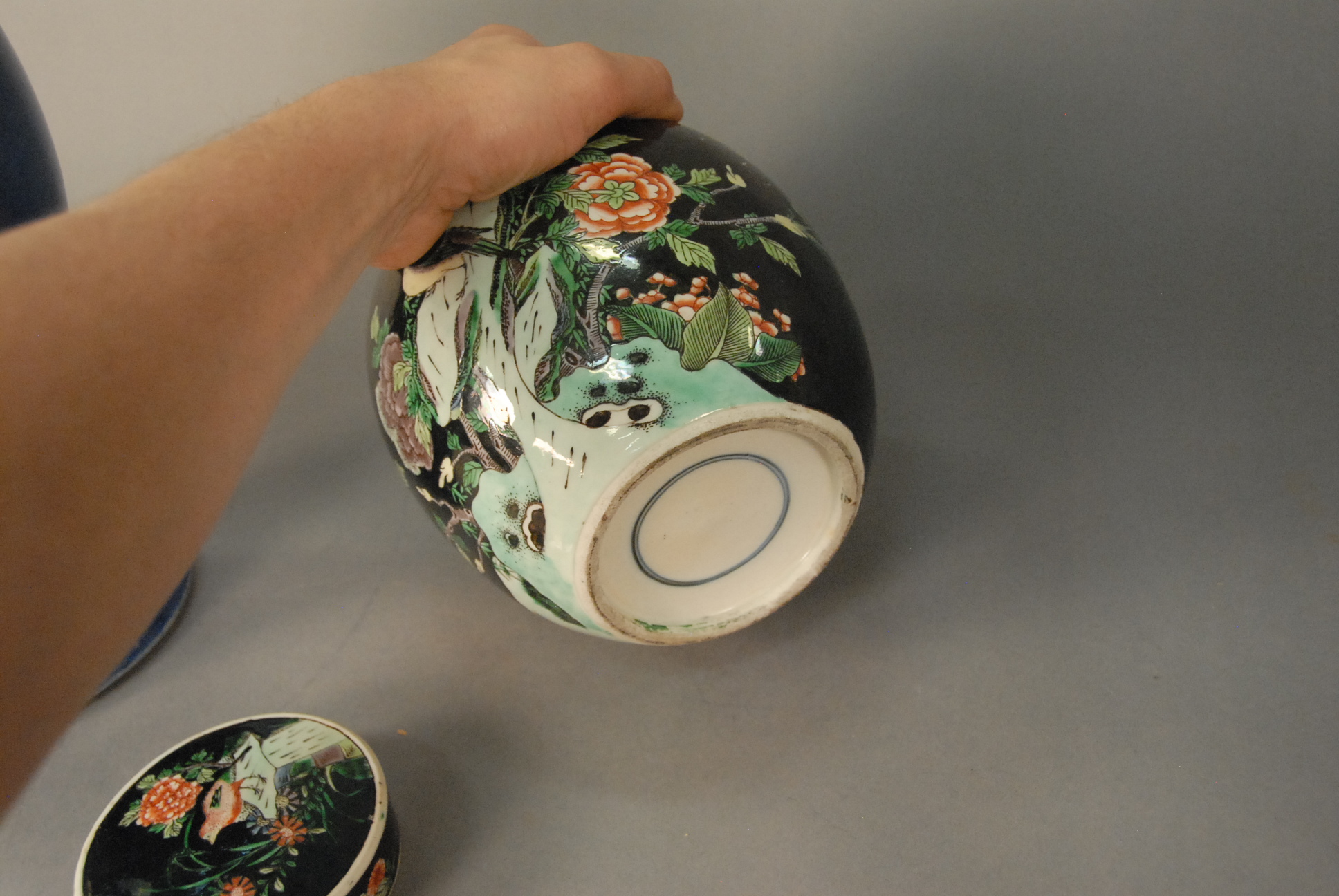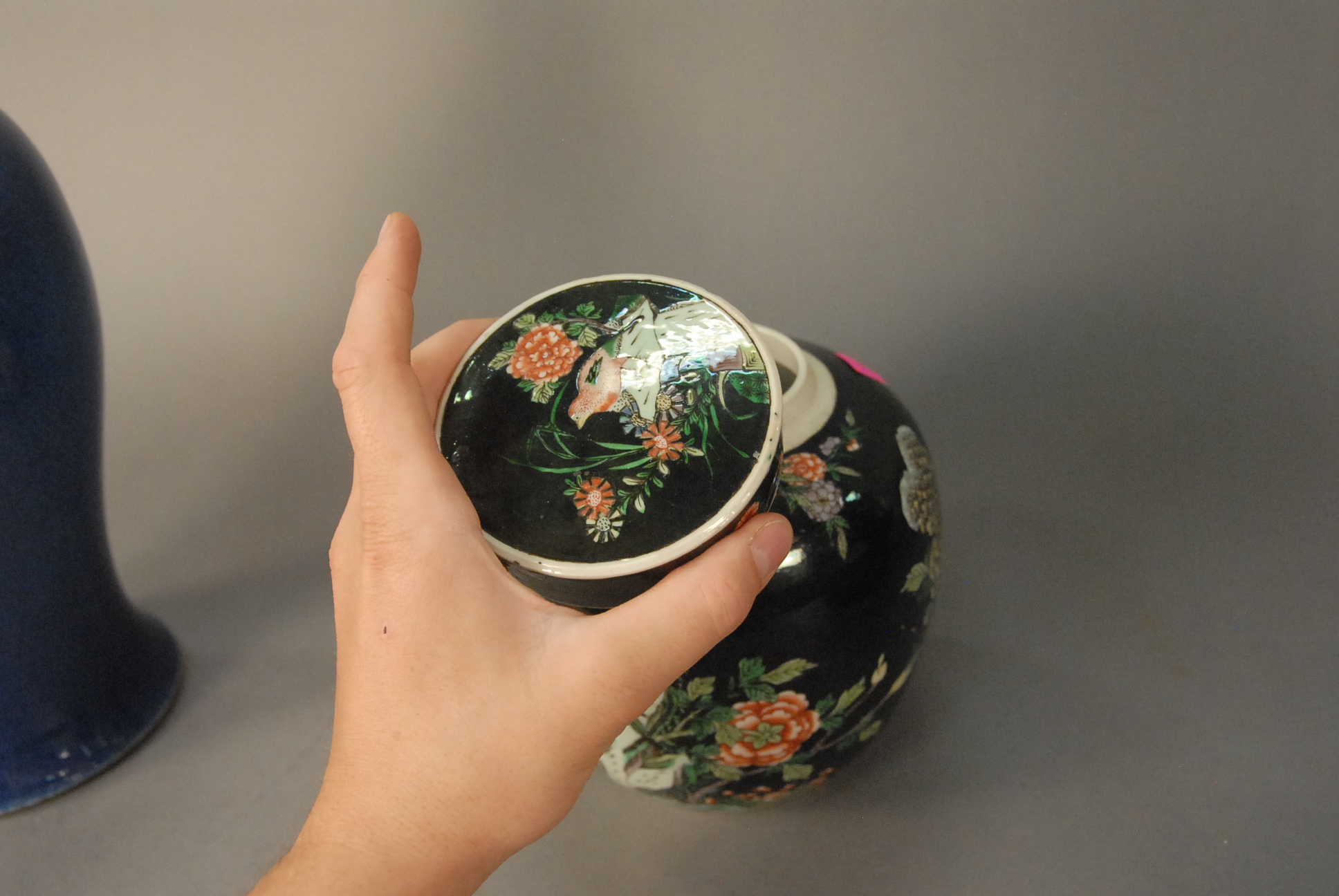 Lot 296: Chinese porcelain ginger jar with cover, having black ground and painted scrolling, blossoming trees and birds. ht. 8 in.