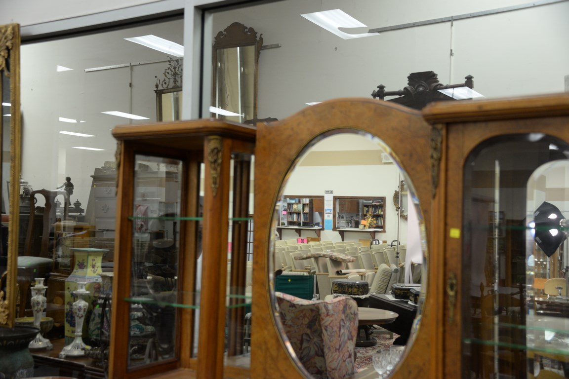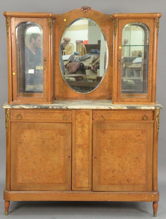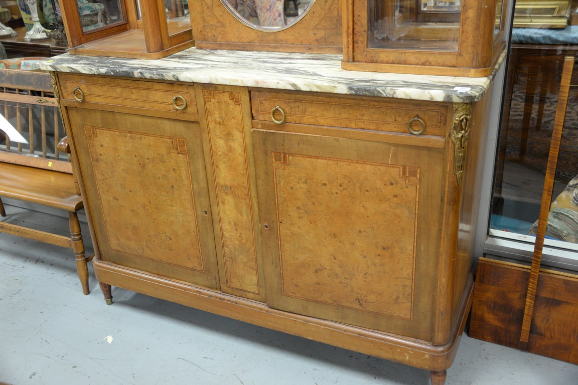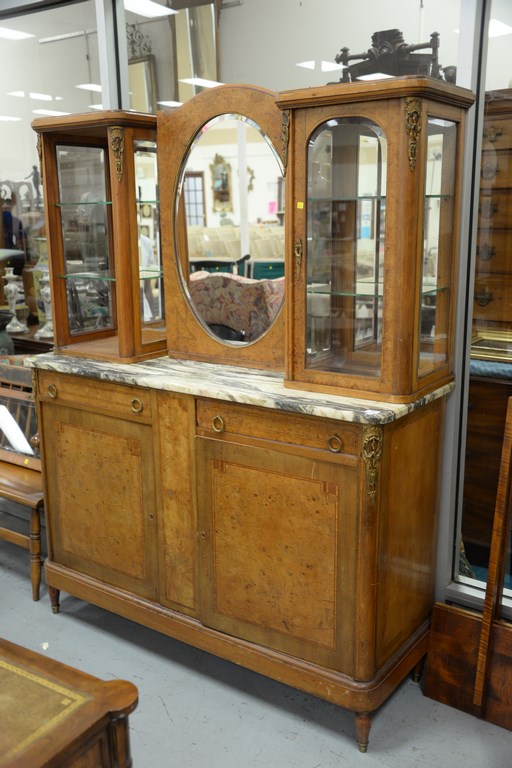 Lot 296: Continental marble top sideboard, top with two curio cabinets and center mirror. total ht. 75 in. wd. 59 in. dp. 20 in.