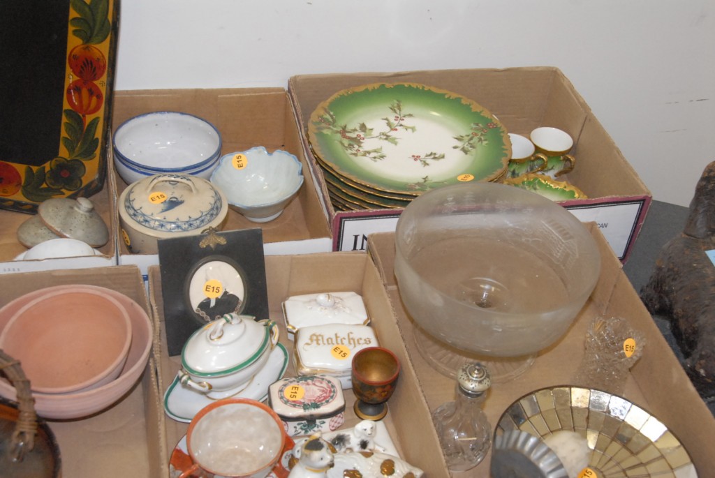 Eight box lots two pieces of Staffordshire, blue and white teapot, platter as is, Japanese pottery, Limoges, Christmas type plates, miniature of woman, Staffordshire dog, small container / boxes, candle sconce with mirrored back, pressed glass compote, small tole tray etc.