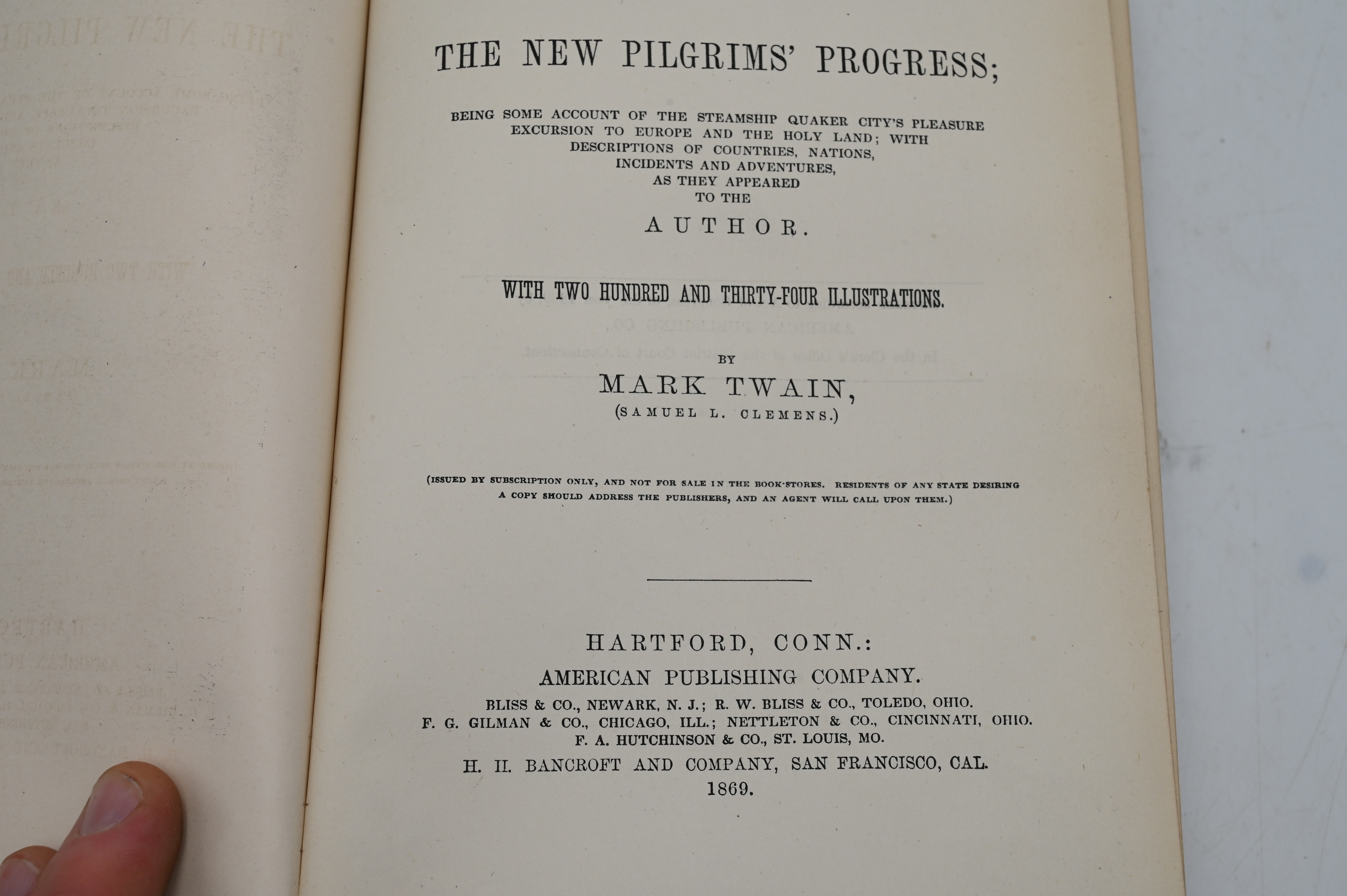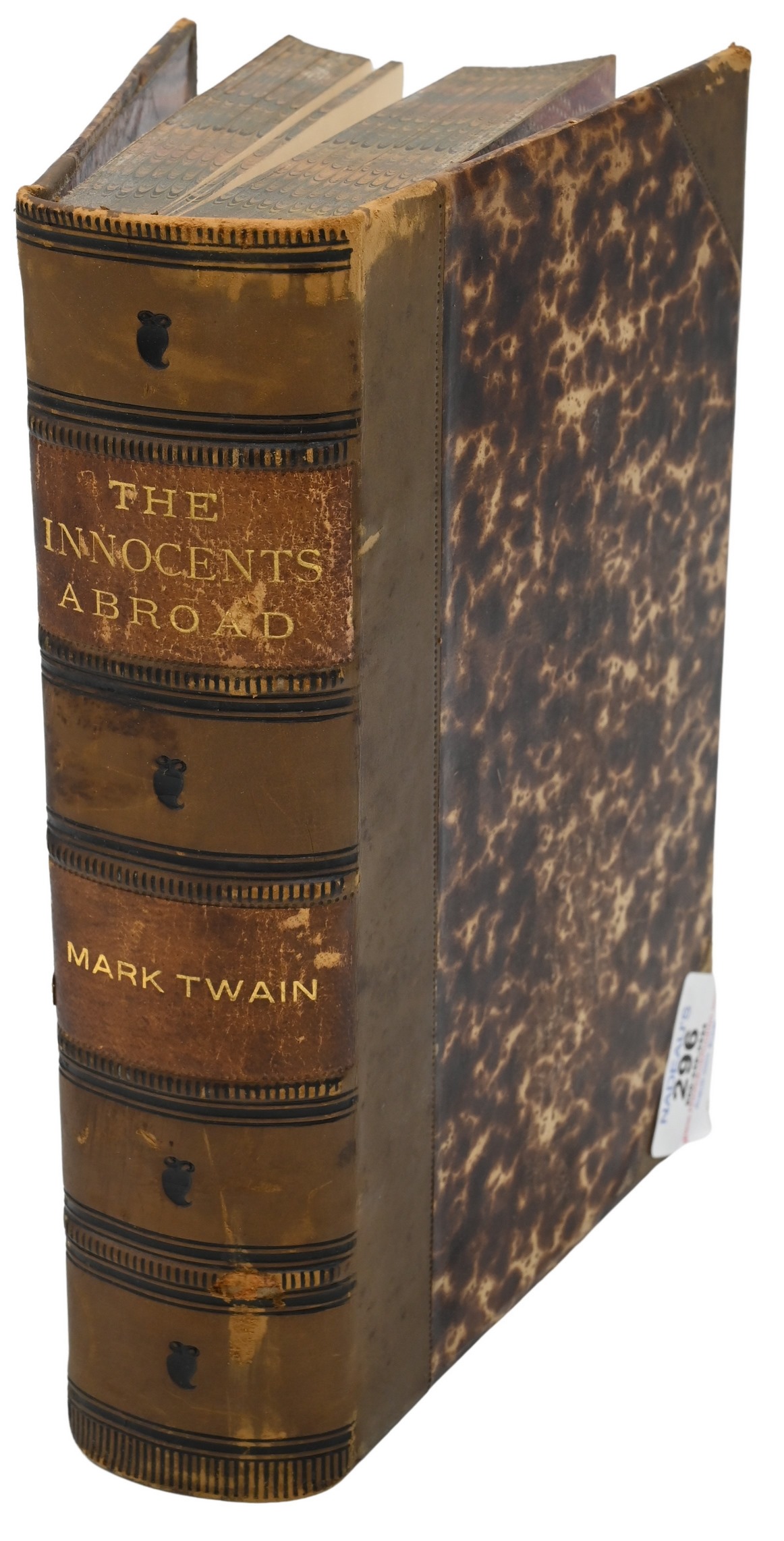 First Edition Mark Twain “The Innocents Abroad” or “The Near Pilgrim’s Progress” printed by the American Publishing Company, Hartford, Connecticut 1869, good condition, has small page tear from original assembly along with handwritten inscription from the owner