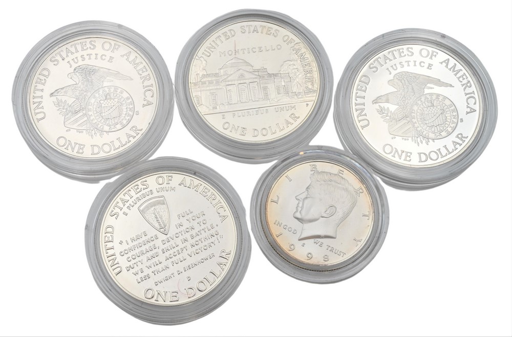 Five Piece Lot, to include two RFK silver dollars, one uncirculated, one proof; one JFK 1992 1/2 dollar with special finish; a silver World War II uncirculated dollar; along with Thomas Jefferson uncirculated dollar.