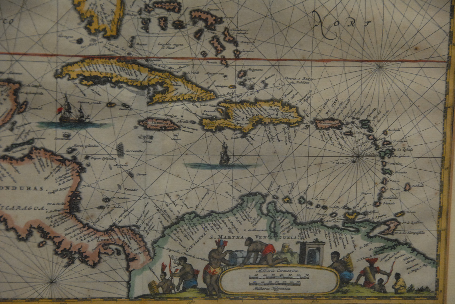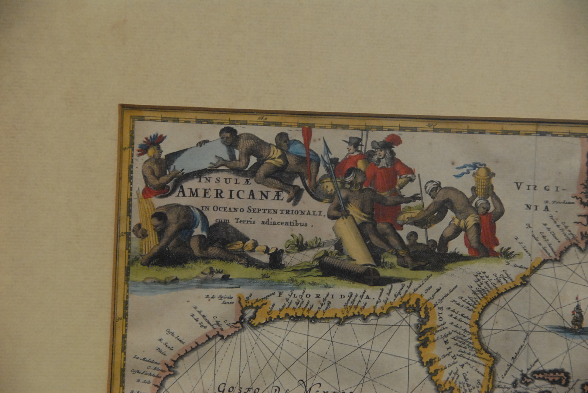 Framed map by Arnold Montanus and John Ogilby Insulae Americanae in oceano Septentrionali, cum Terris adiacentibus hand colored engraving London, 1671, map of West Indies, scenic title cartouche fills North American continent and graphic scale of miles cartouche fills the interior of South America, each surrounded by Native Americans and European merchants, seas are embellished with rhumb lines, ships, and compass roses creasing down center, recolored at later date. 11 1/4 x 13 7/8 overall: 17 1/2 x 20 1/4