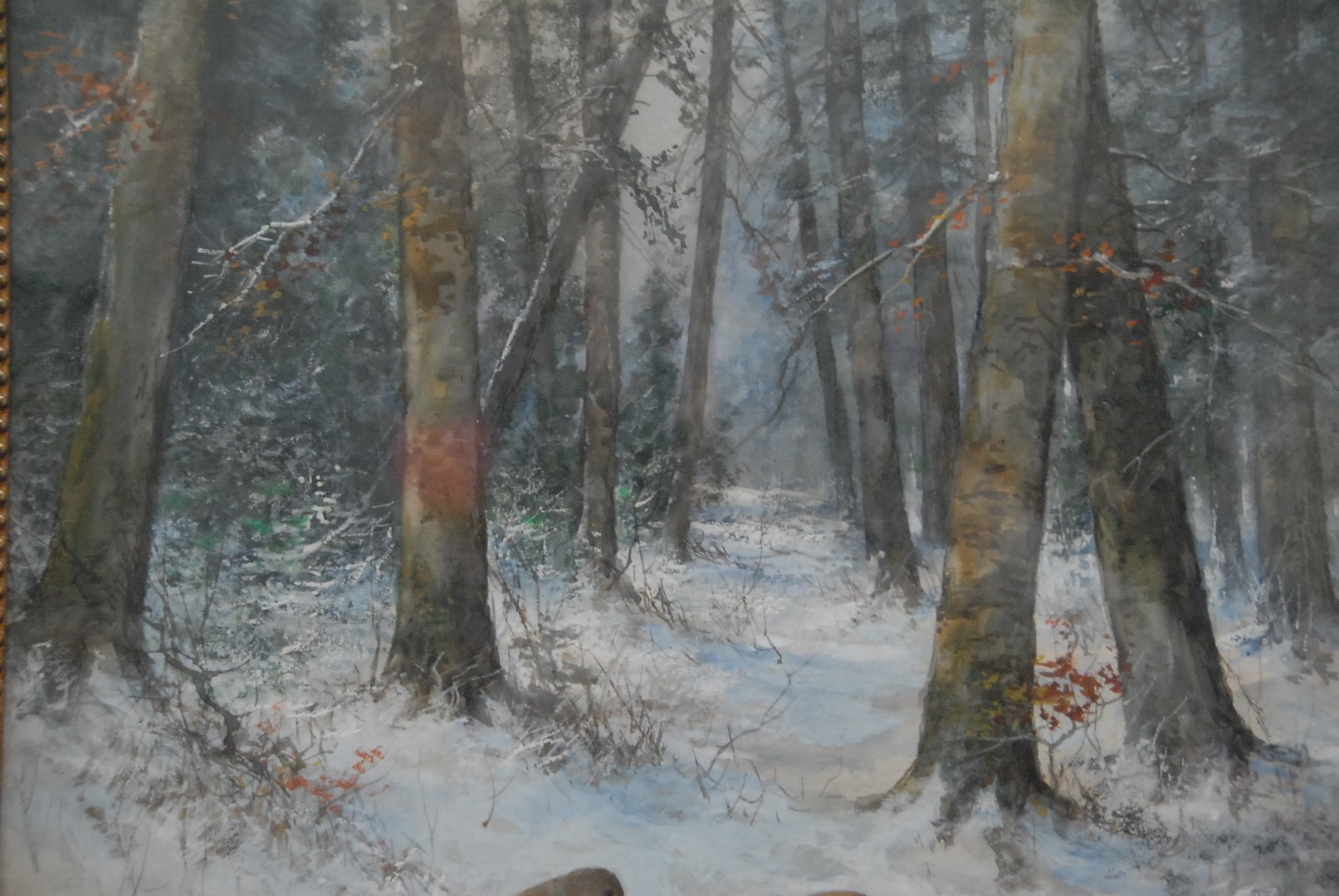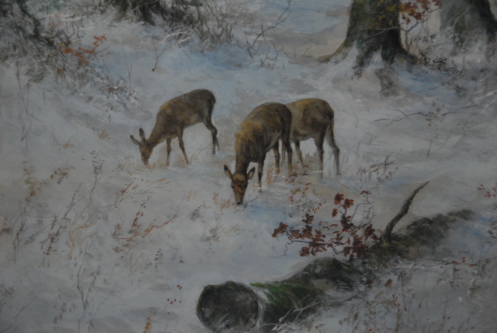 Hugo Anton Fisher winter landscape watercolor and gouache on paper of deer eating. 29 1/2 x 21 1/4