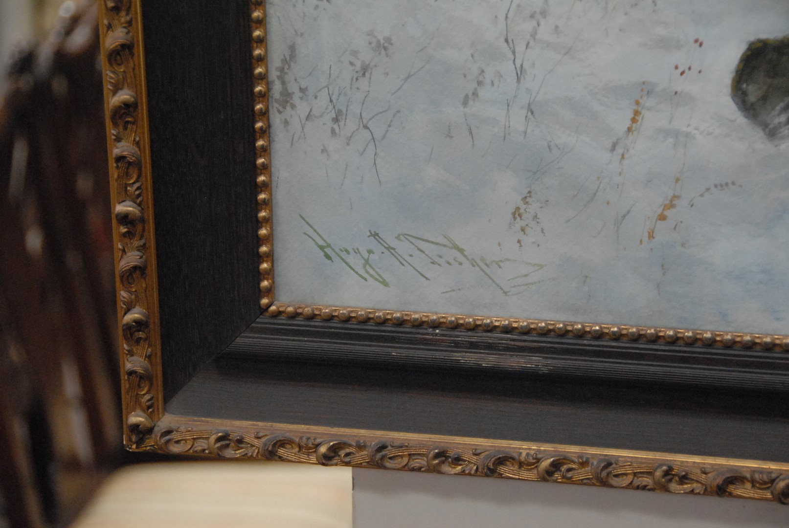 Lot 296: Hugo Anton Fisher winter landscape watercolor and gouache on paper of deer eating. 29 1/2 x 21 1/4