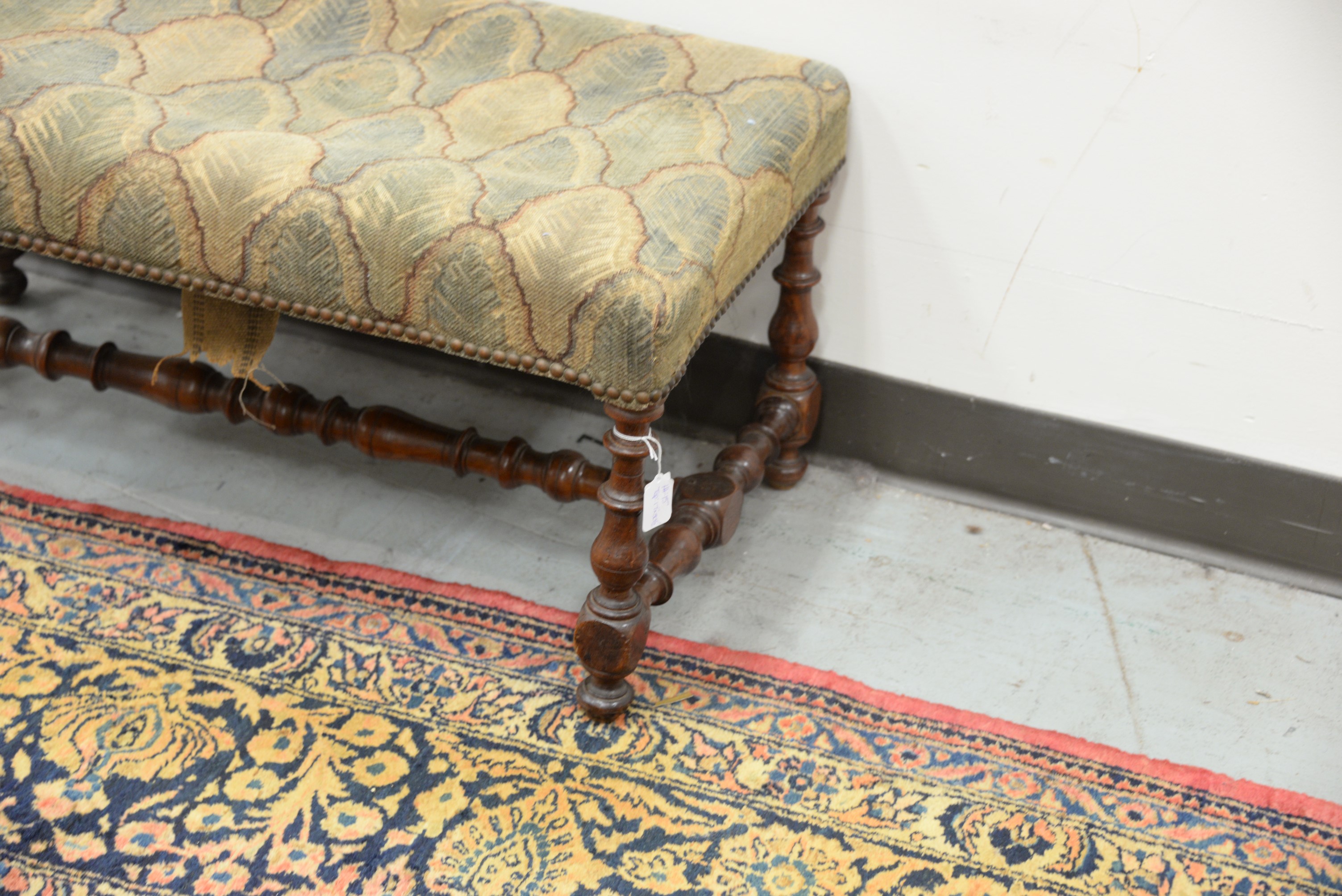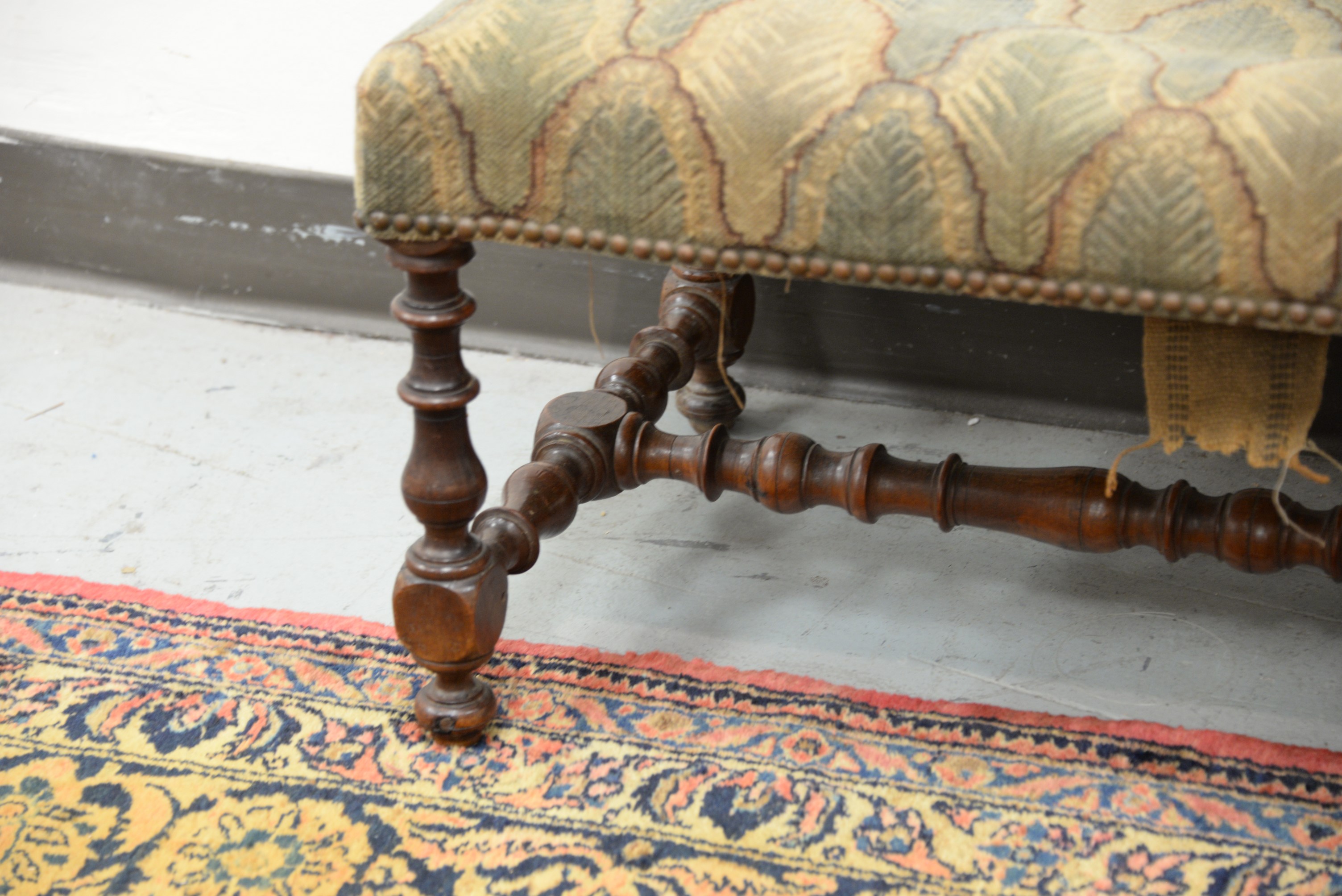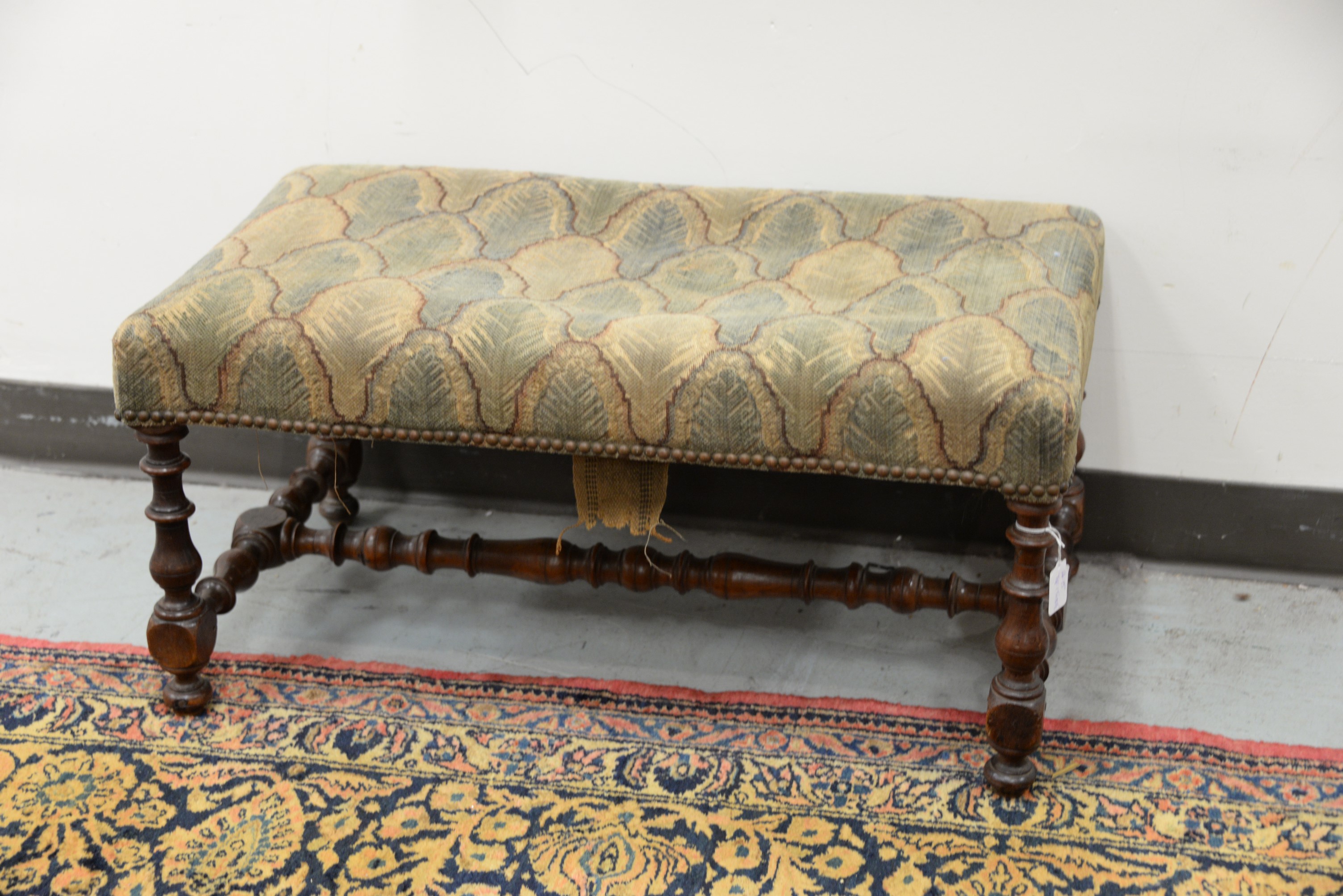 Lot 296: Jacobean bench with upholstered top on turned legs joined by stretchers, probably 17th century. ht. 15 in. top: 17 x 30 1/2 …