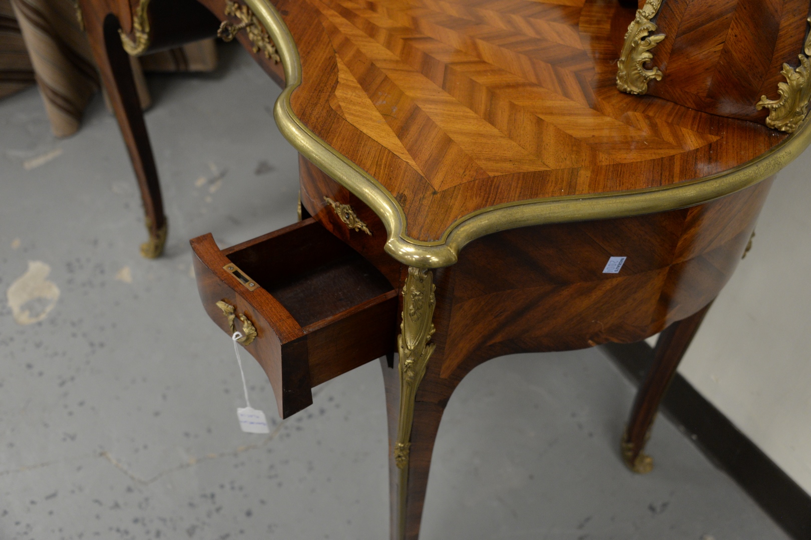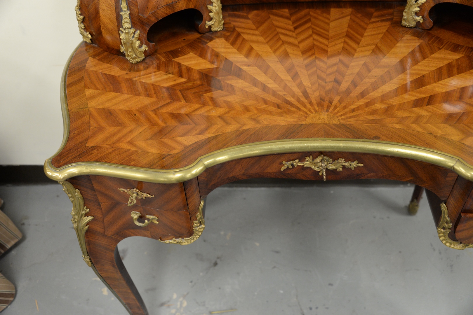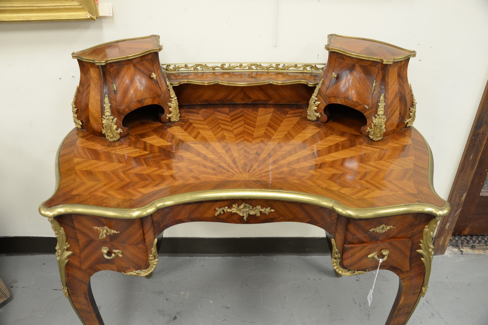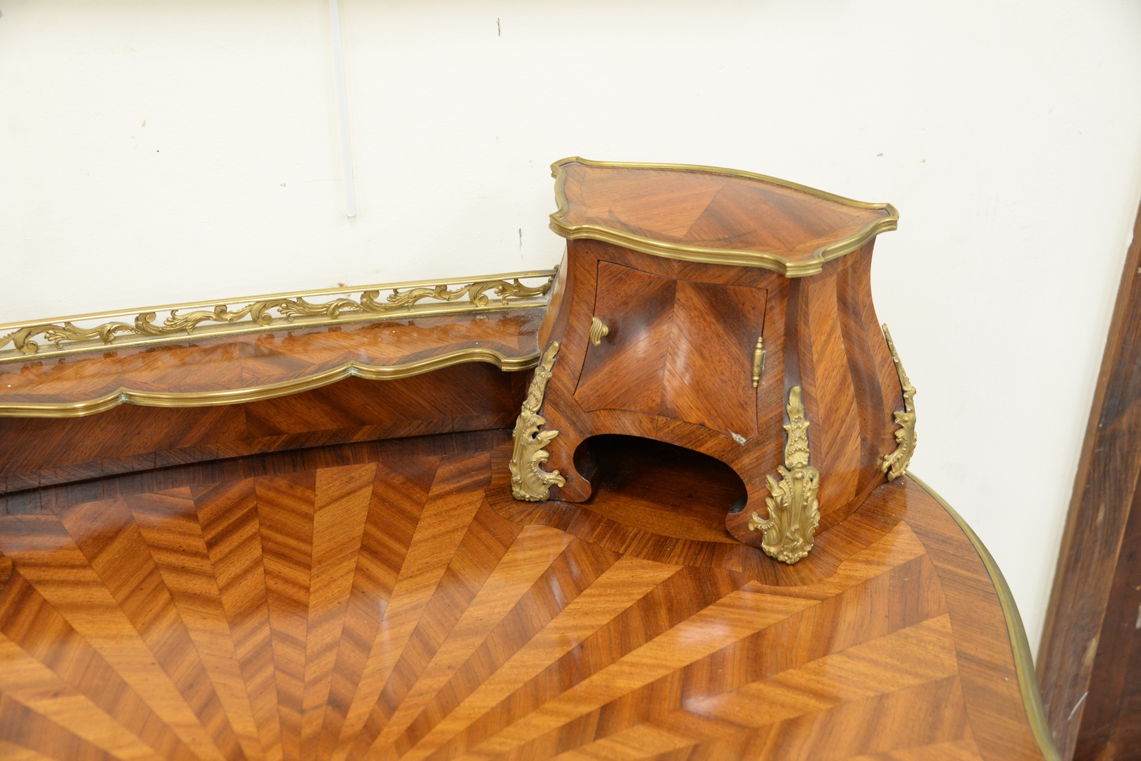 Lot 296: Louis XV Style Writing Desk having double cabinet top, over parquetry inlaid top surface, with brass mounts over center drawer, f…