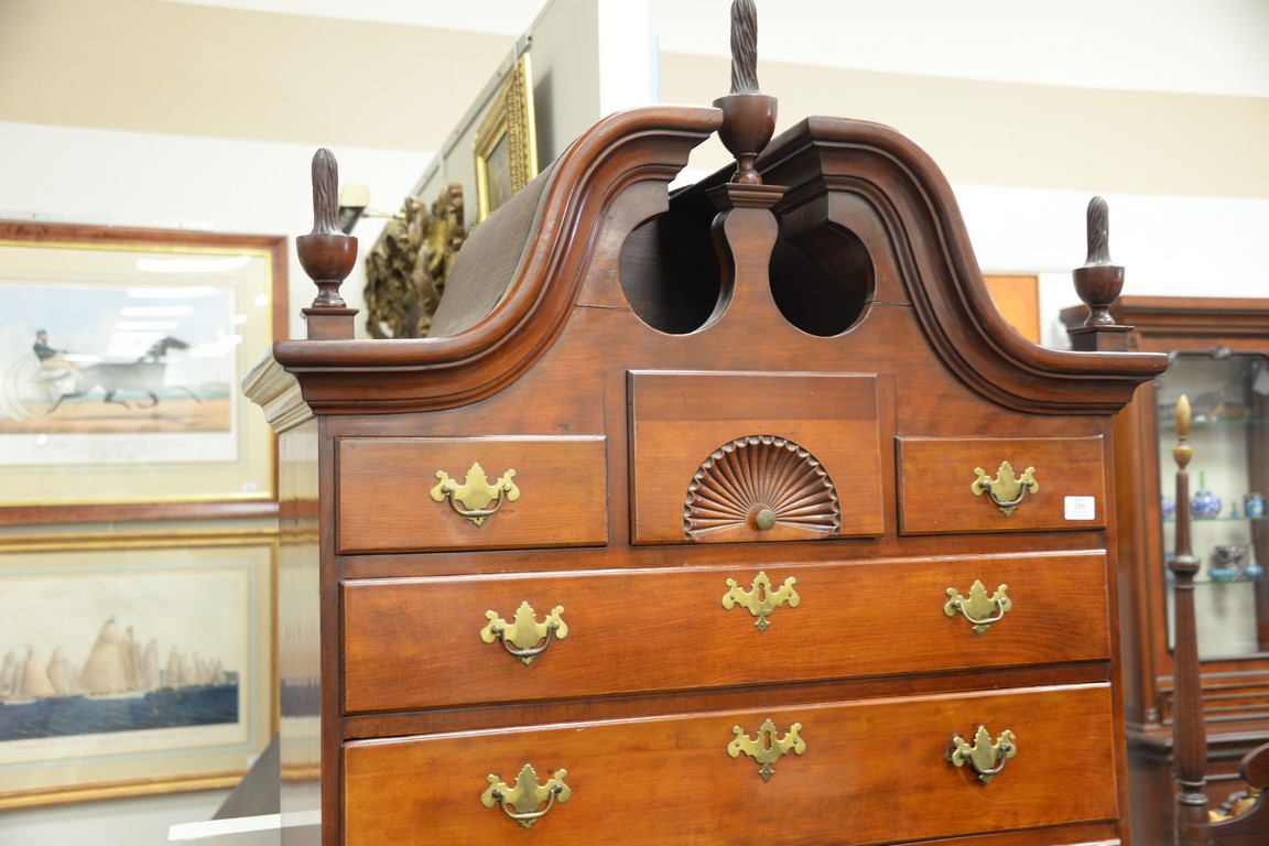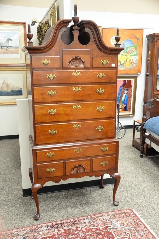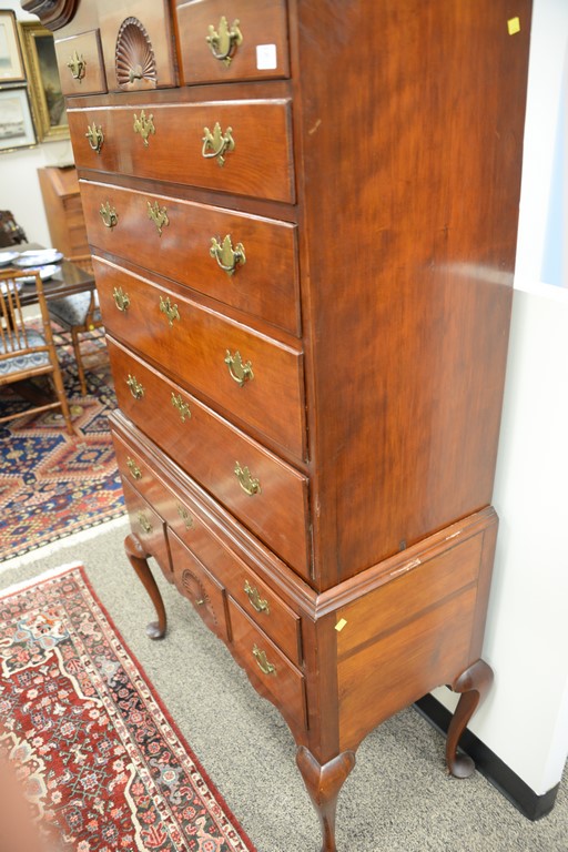 Lot 296: Queen Anne highboy in two parts, upper portion with full bonnet top over fan carved center drawer flanked by two short drawers over…