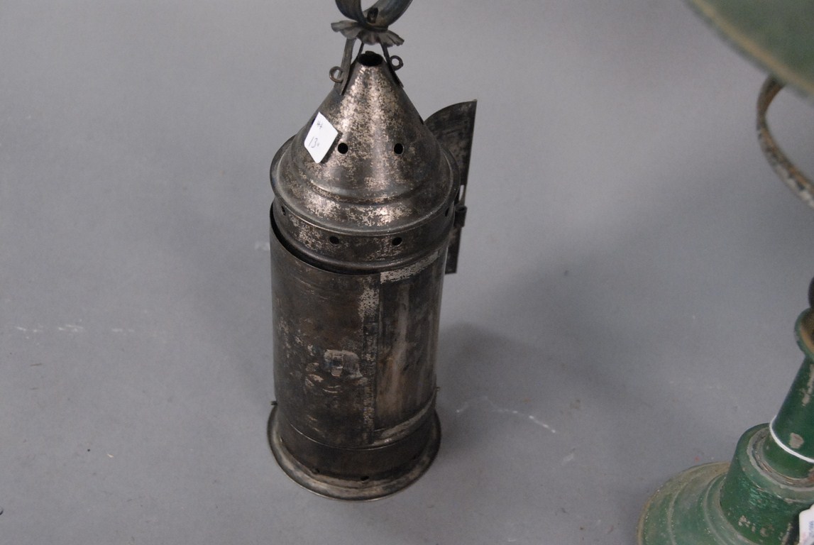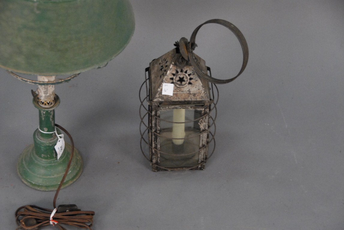 Lot 296: Three piece lot two candle lanterns one with mica front and one tole oil lamp with tole shade converted to electric.