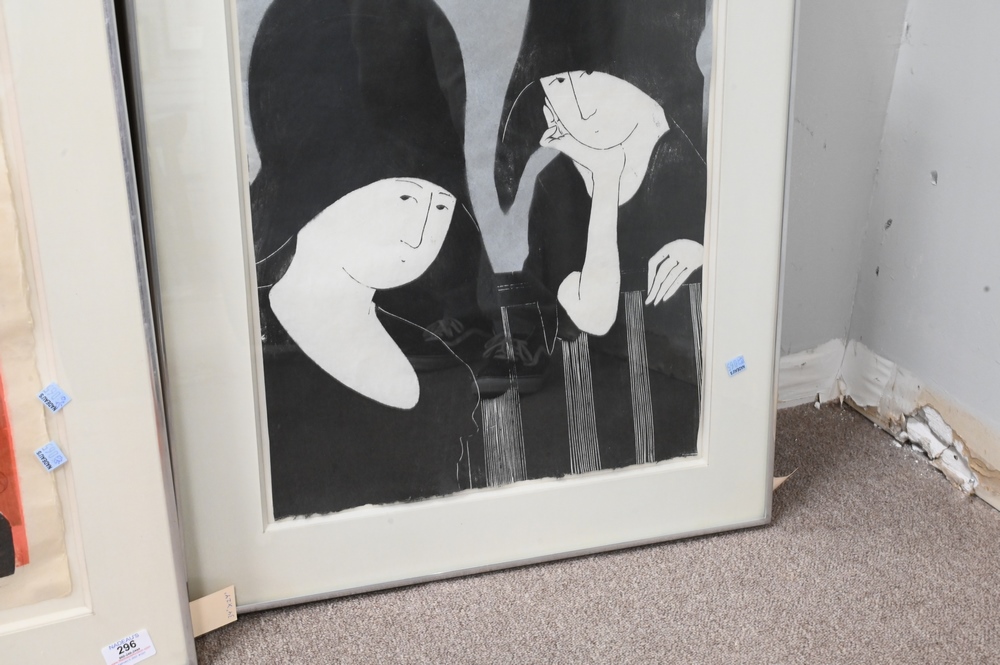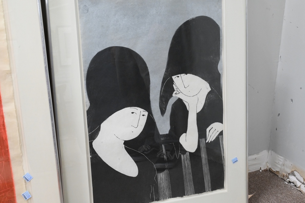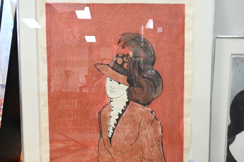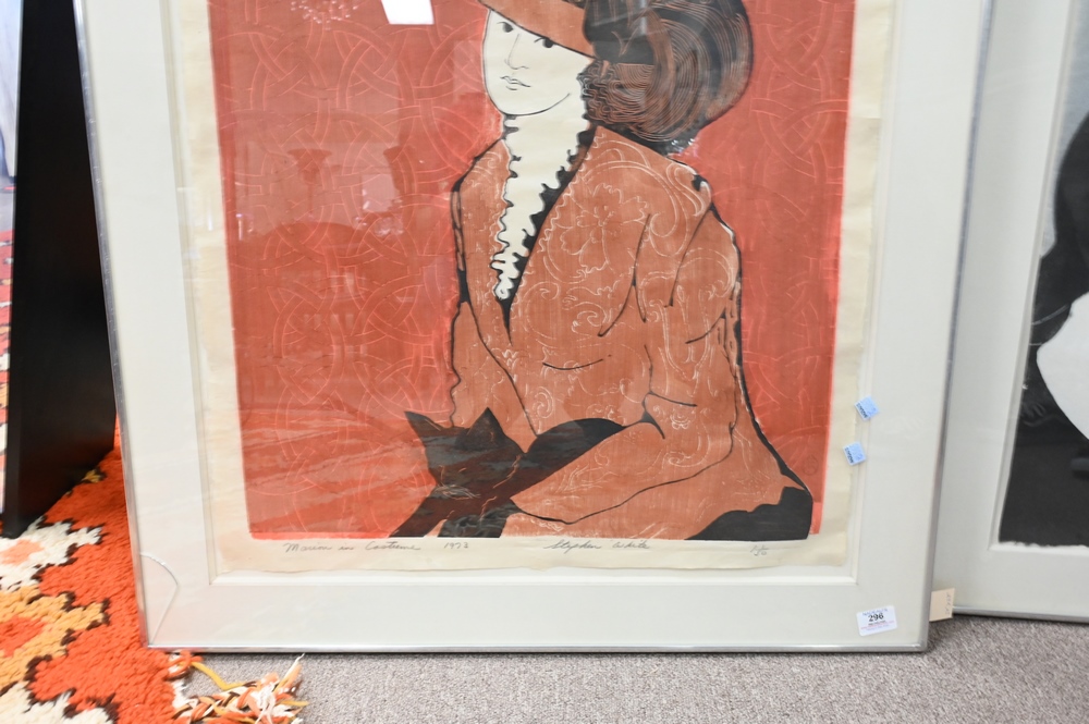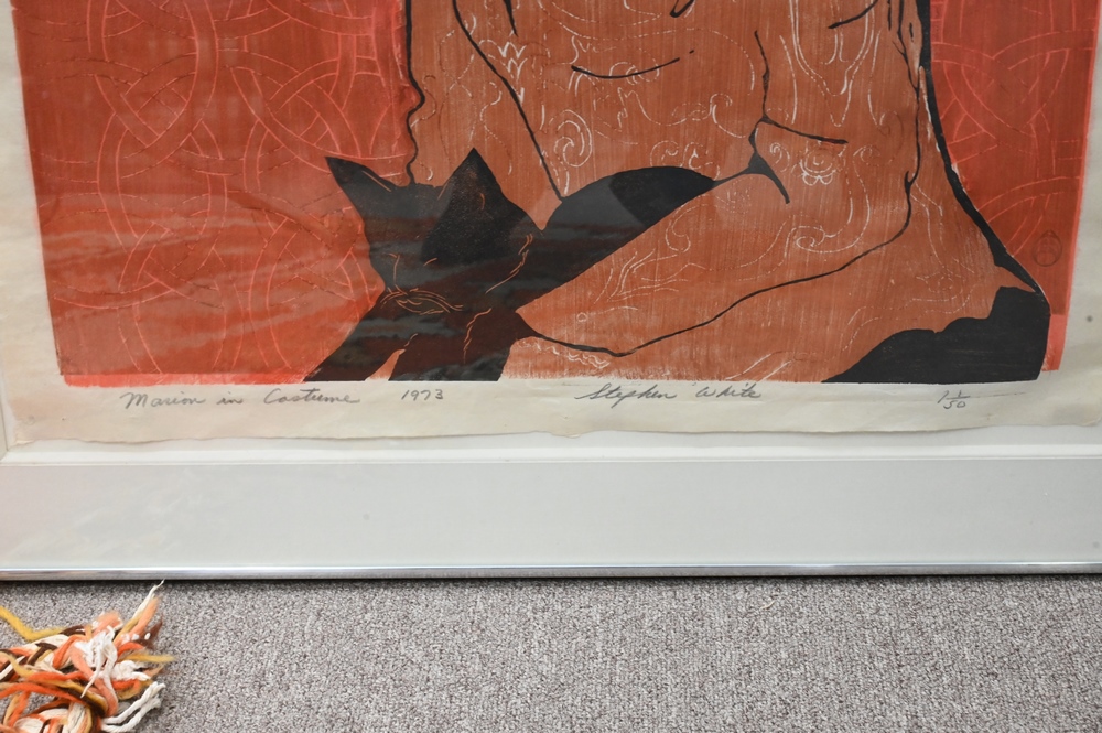 Lot 296: Two Woodcuts by Stephen White (b. 1939), to include “Two Ladies in Large Hats”, 17″ x 24″; “Marion in Costume”, 1973, titled, numbered and dated bottom edge, 24″ x 33″; both having monogram signature.