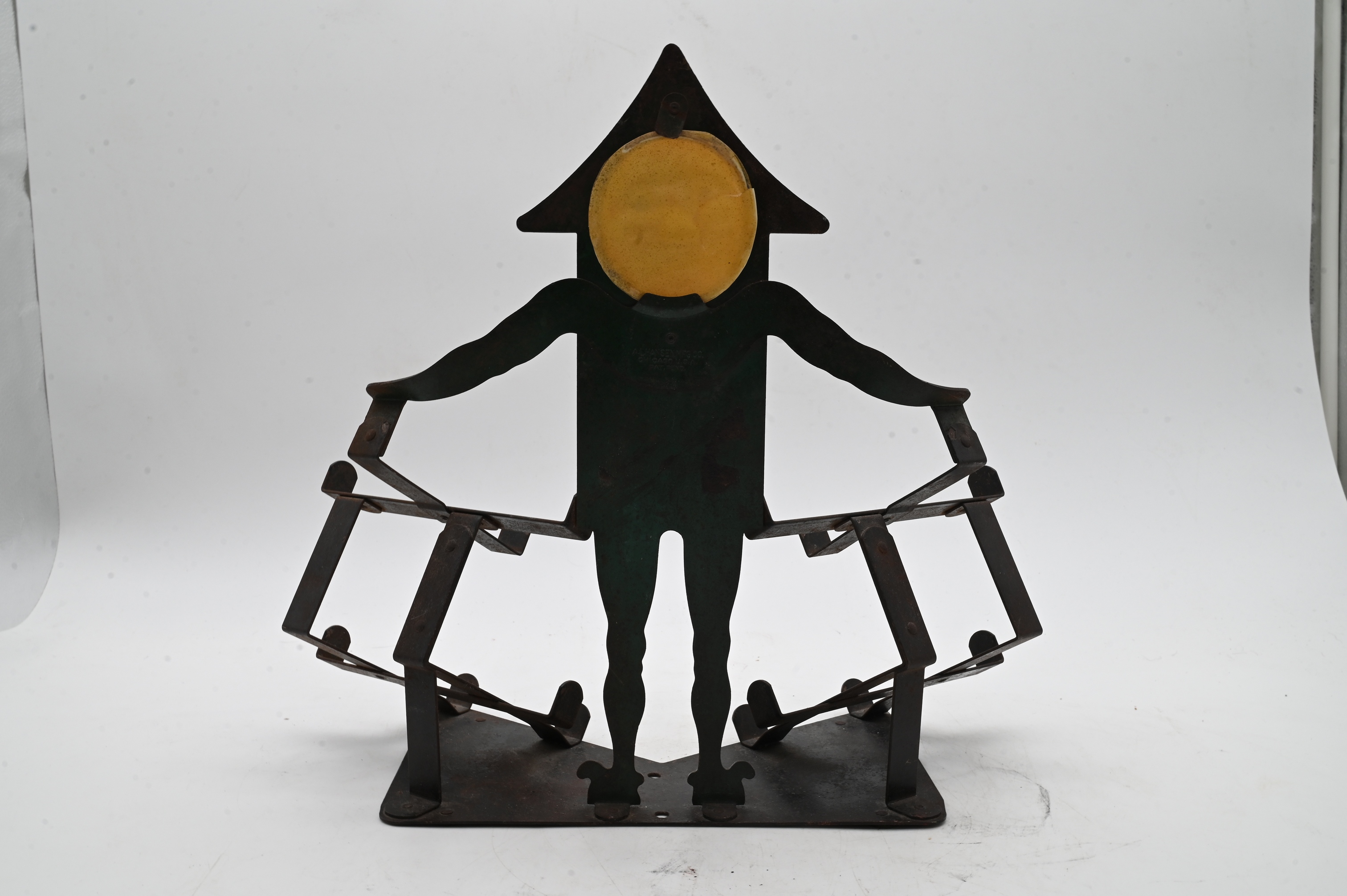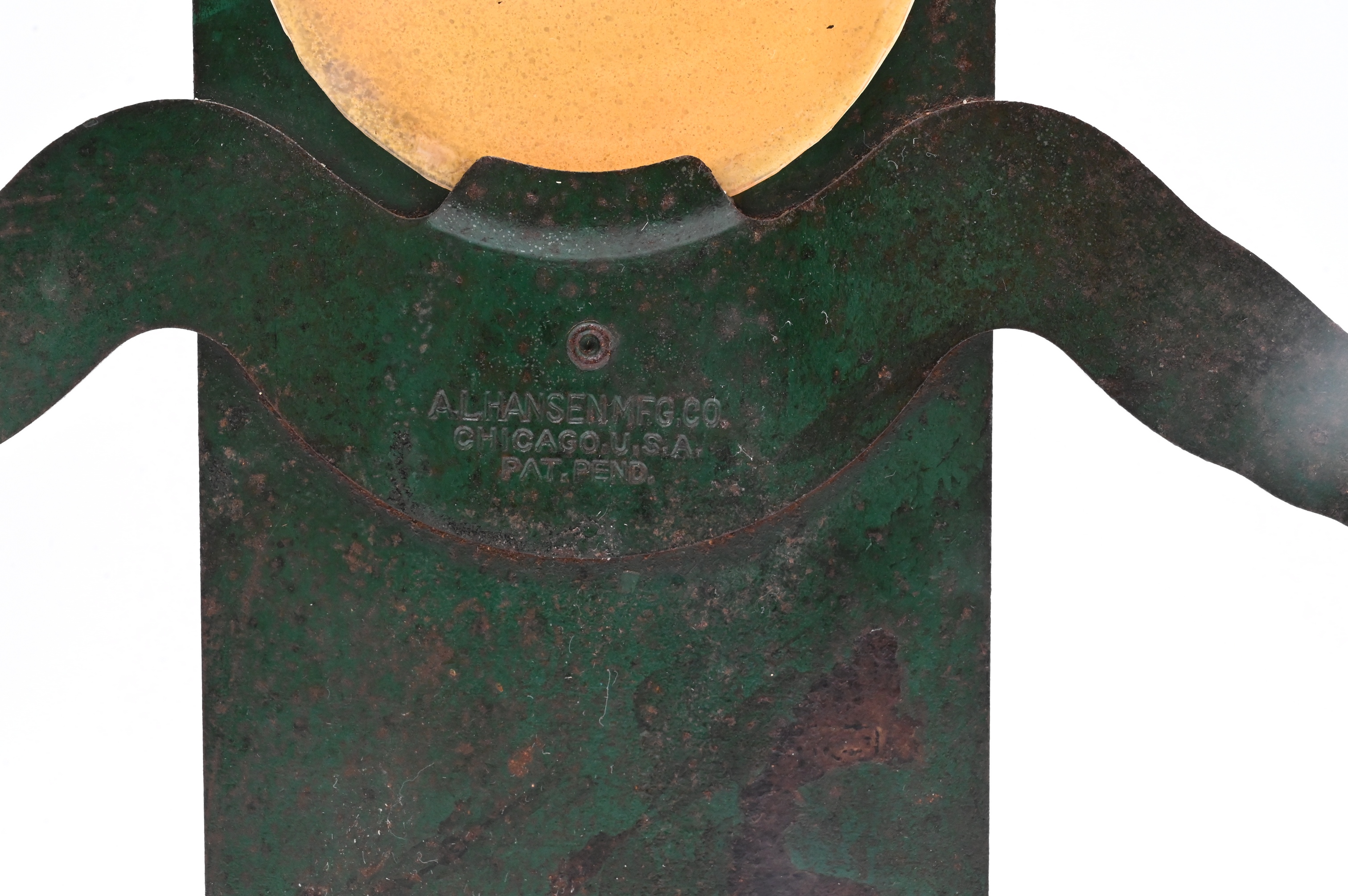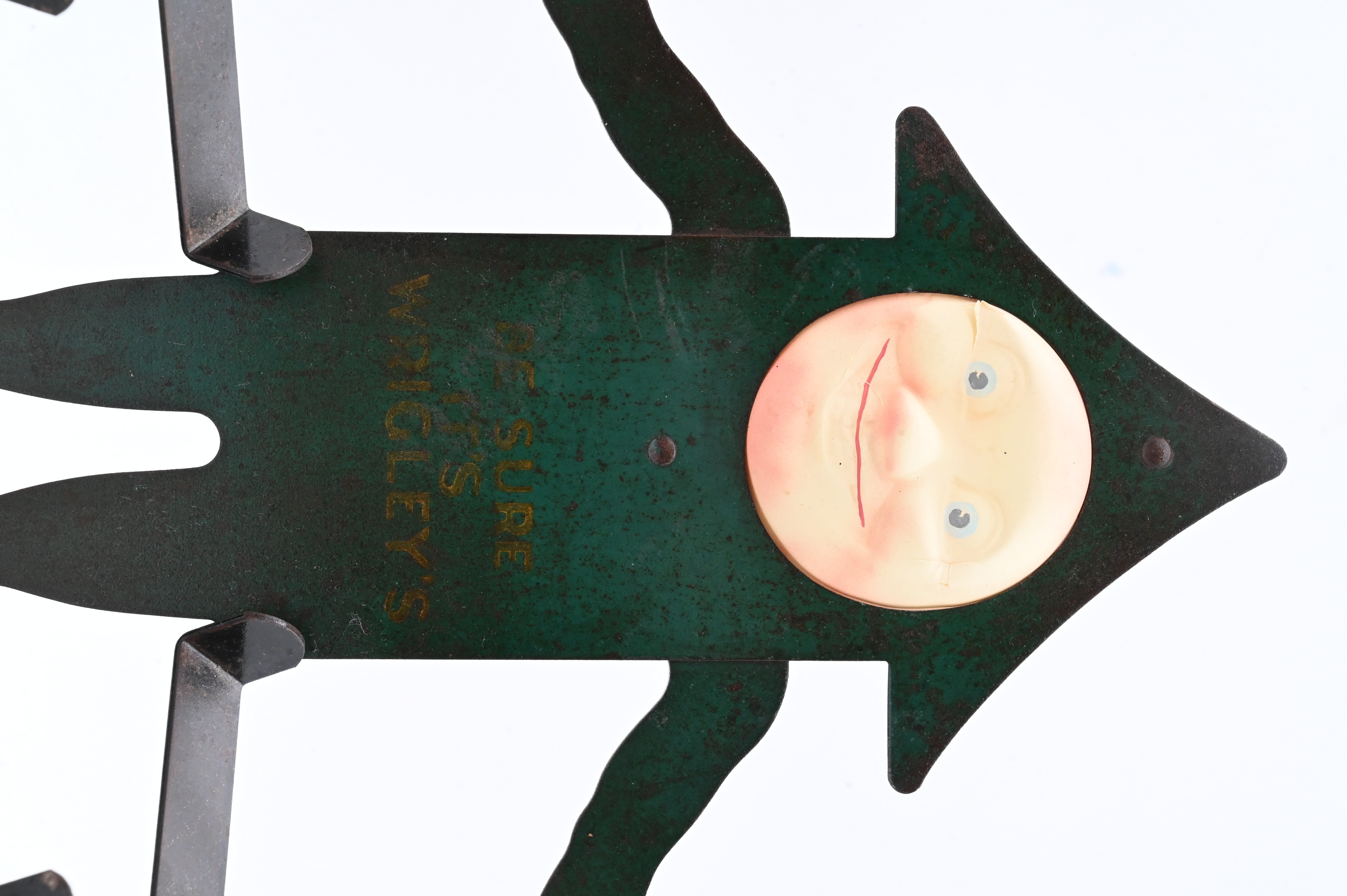 featuring the Spearmint Man figure display with open arms “Be Sure It’s Wrigley’s”, the celluloid face intact, the metal stand having areas of paint loss and wear, Hansen Manufacturing Co., Chicago, circa 1940