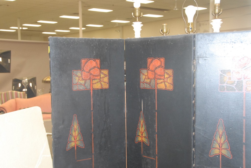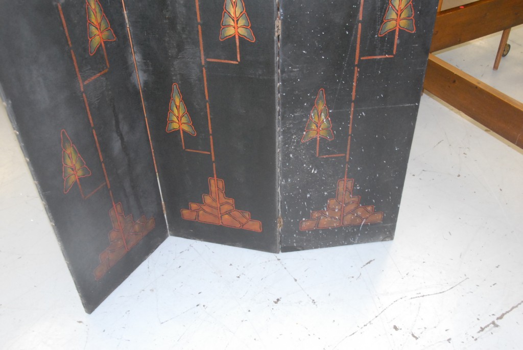 Arts and Crafts style canvas three fold dressing screen, ht. 68, wd. 51.