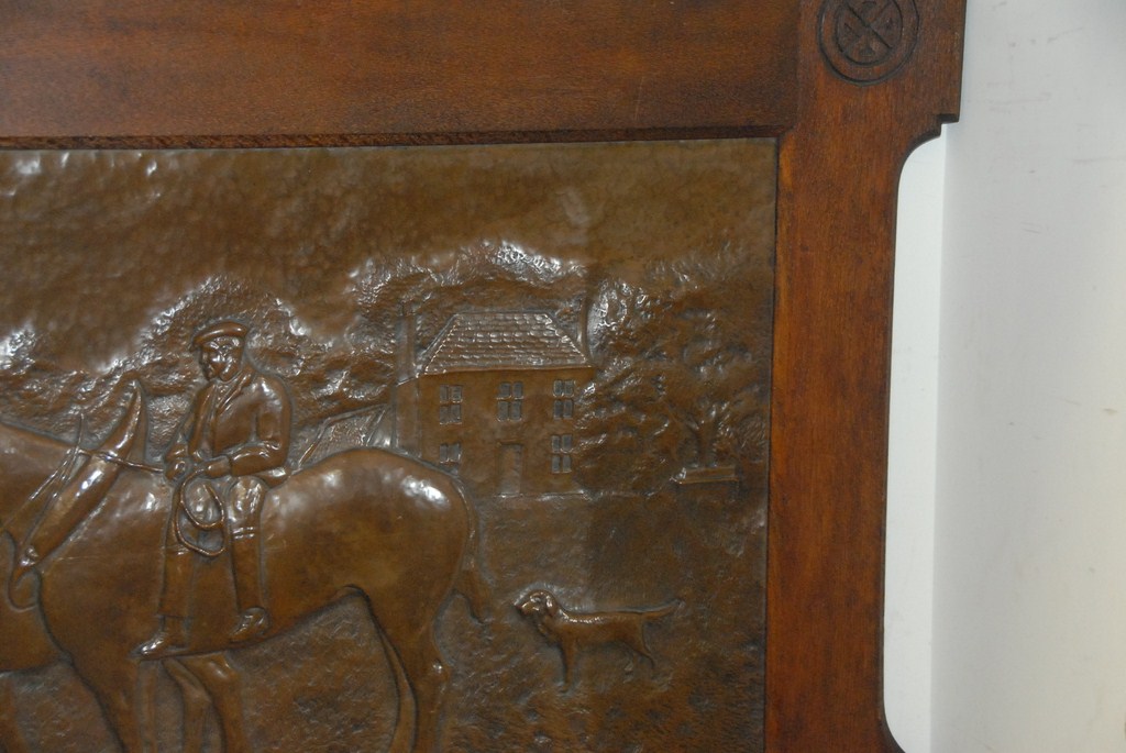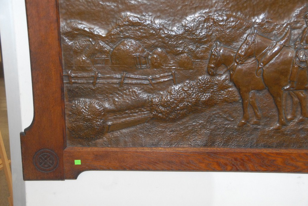 Lot 297: Arts & Crafts embossed copper wall hanging with oak frame and scene of men on horses. copper size 22 x 47