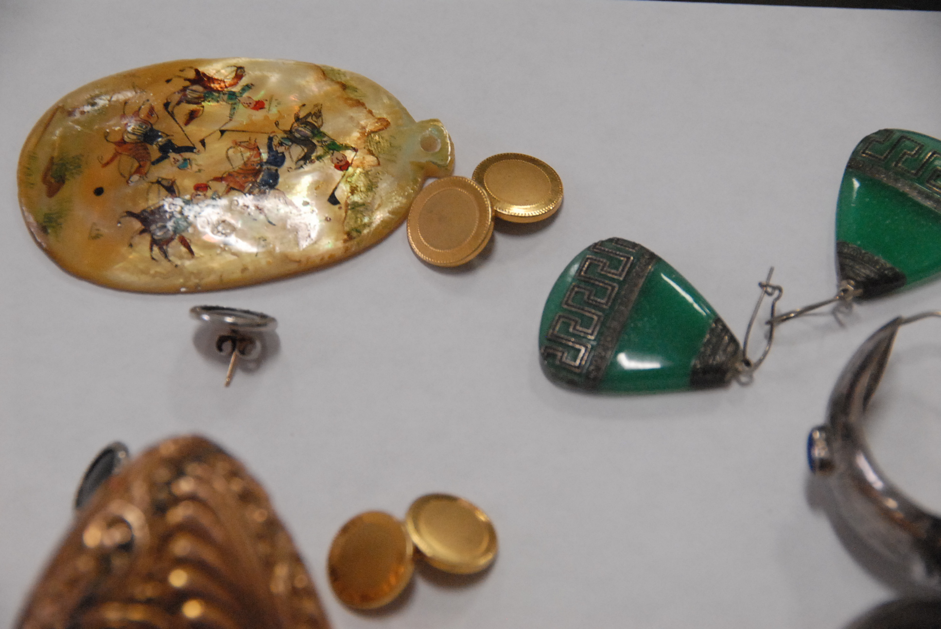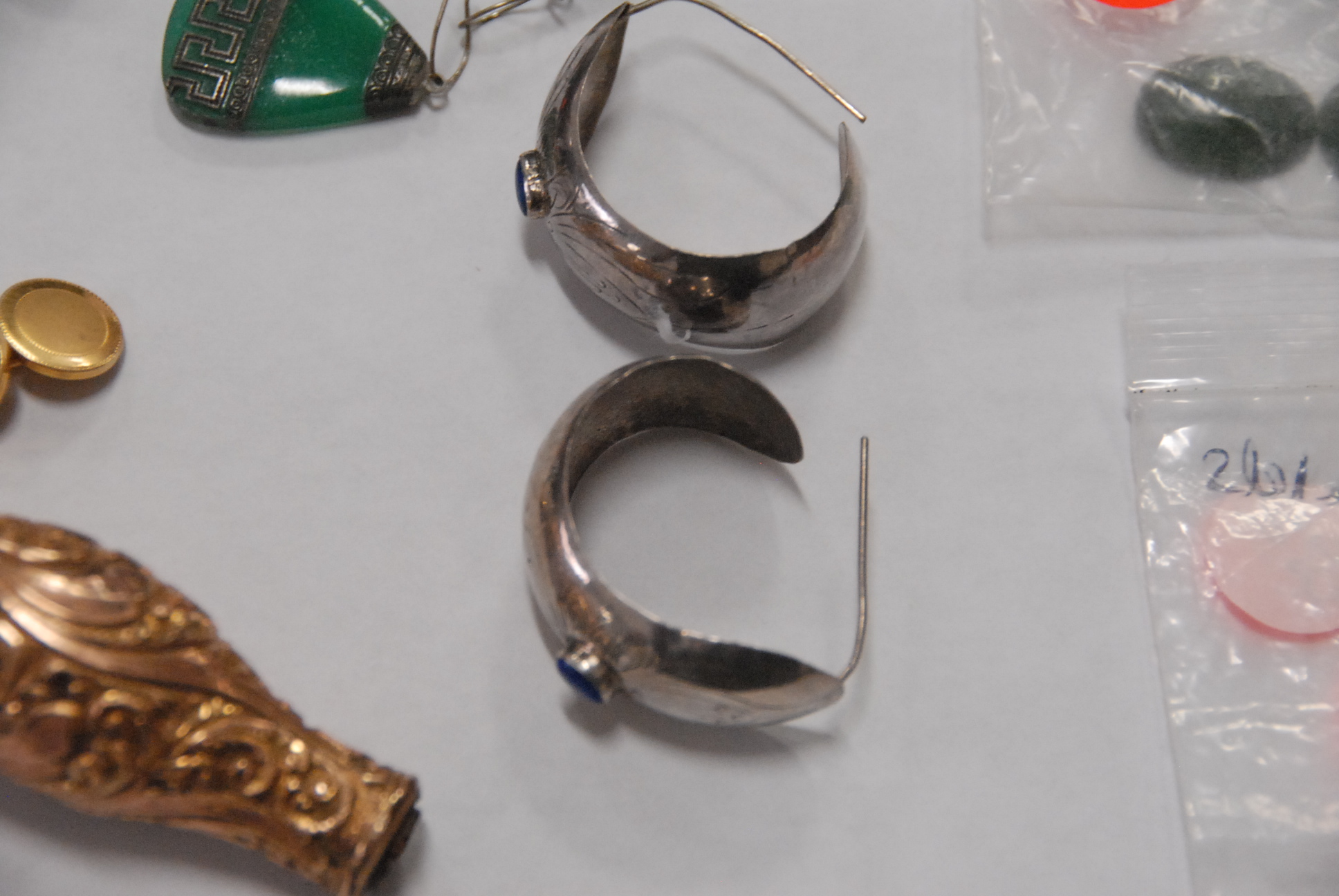 Cane top, pair of silver earrings, various stones in small bags, and cuff links.