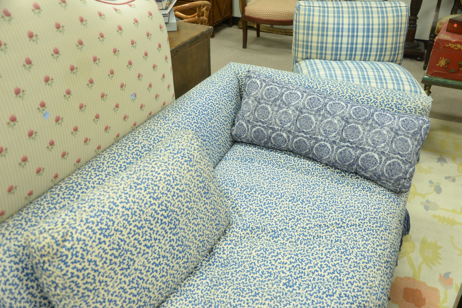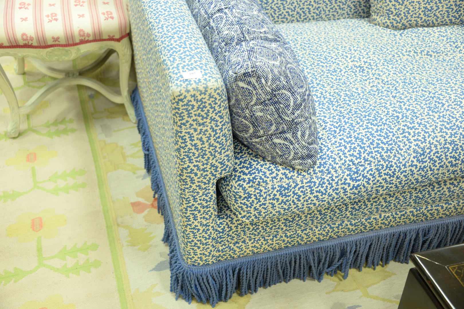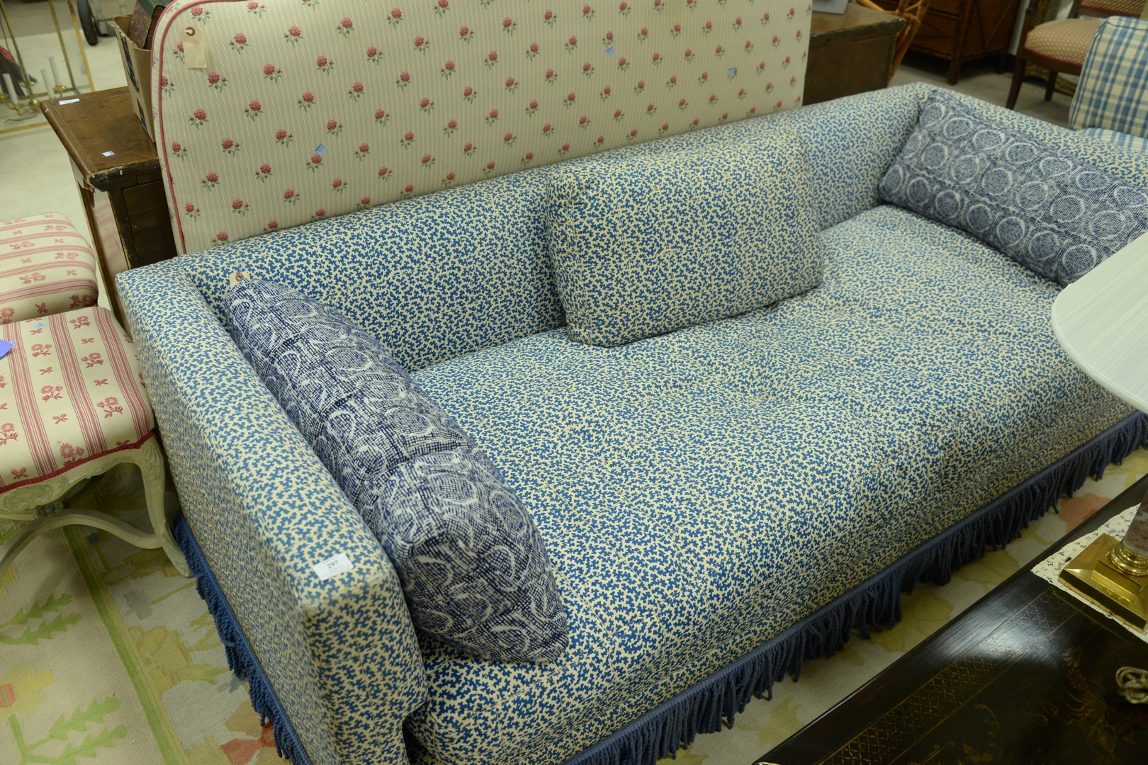 Custom Low Back Sofa, in blue and white upholstery, with fringe ends worn, length 84 inches.