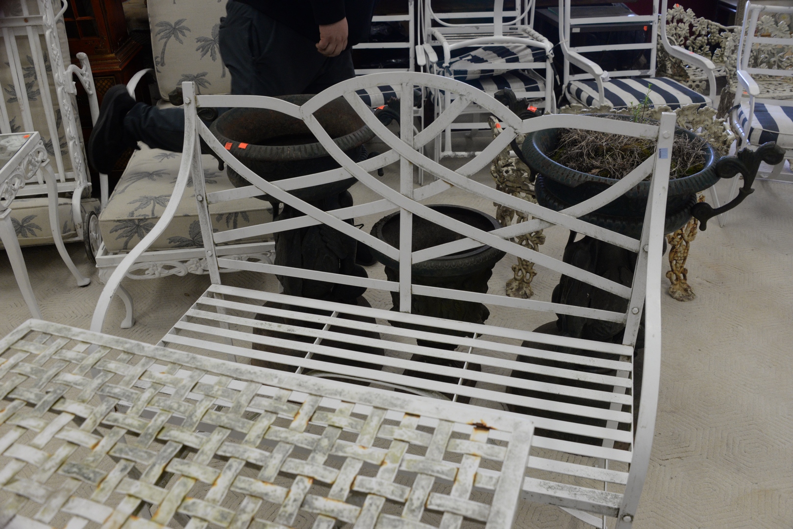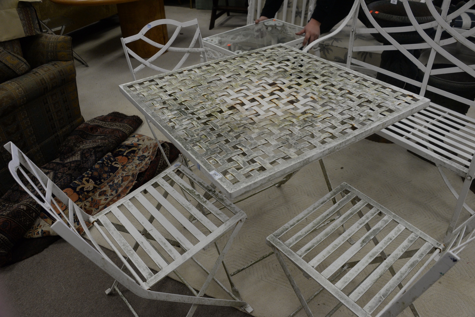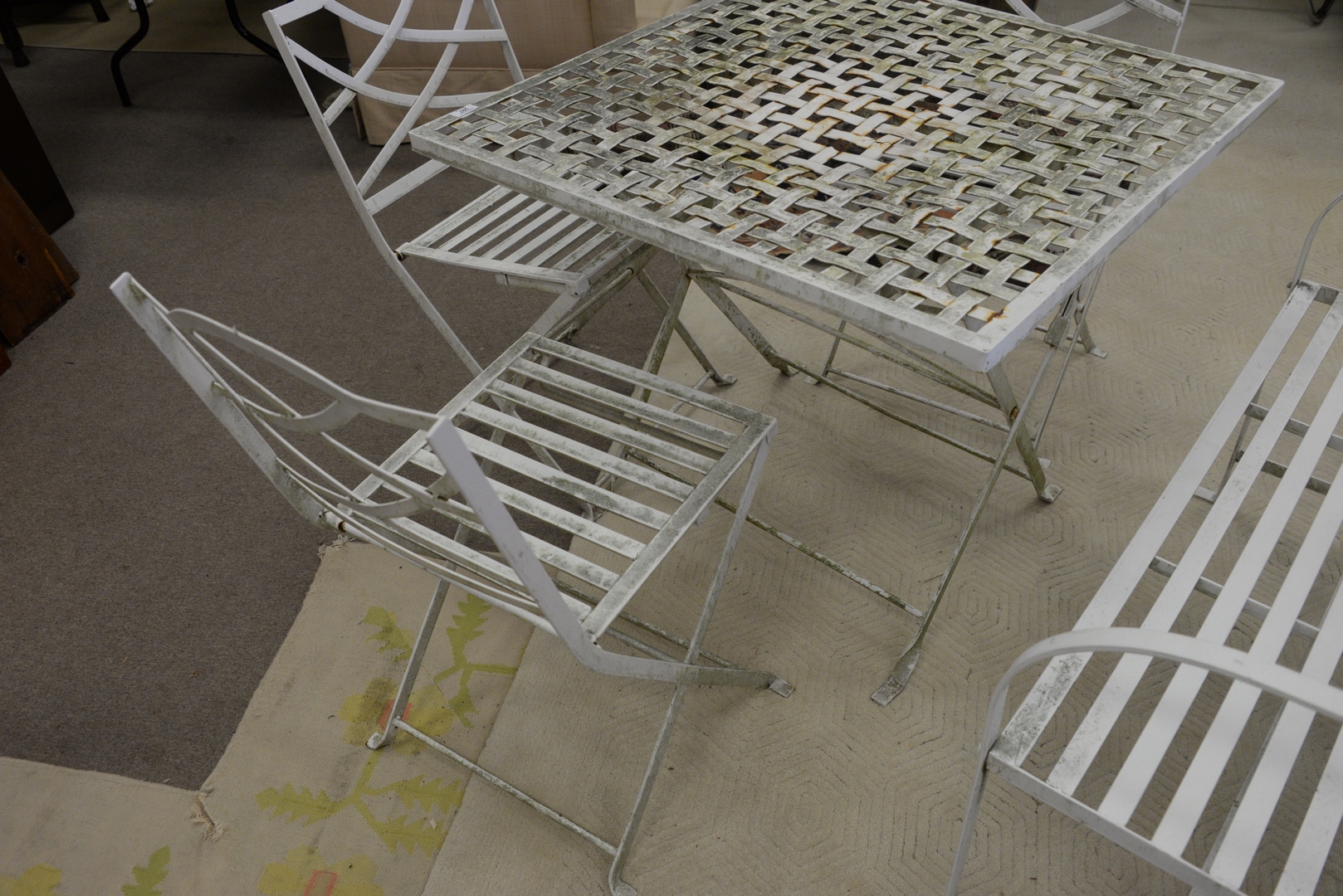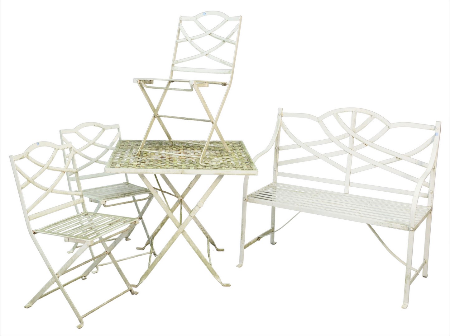 Lot 297: Five Piece Outdoor Set to include a table, three chairs, and bench, length 33 inches, width 33 inches.