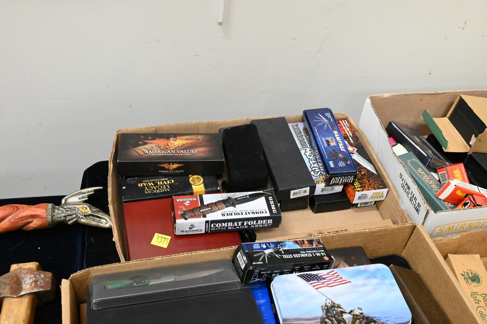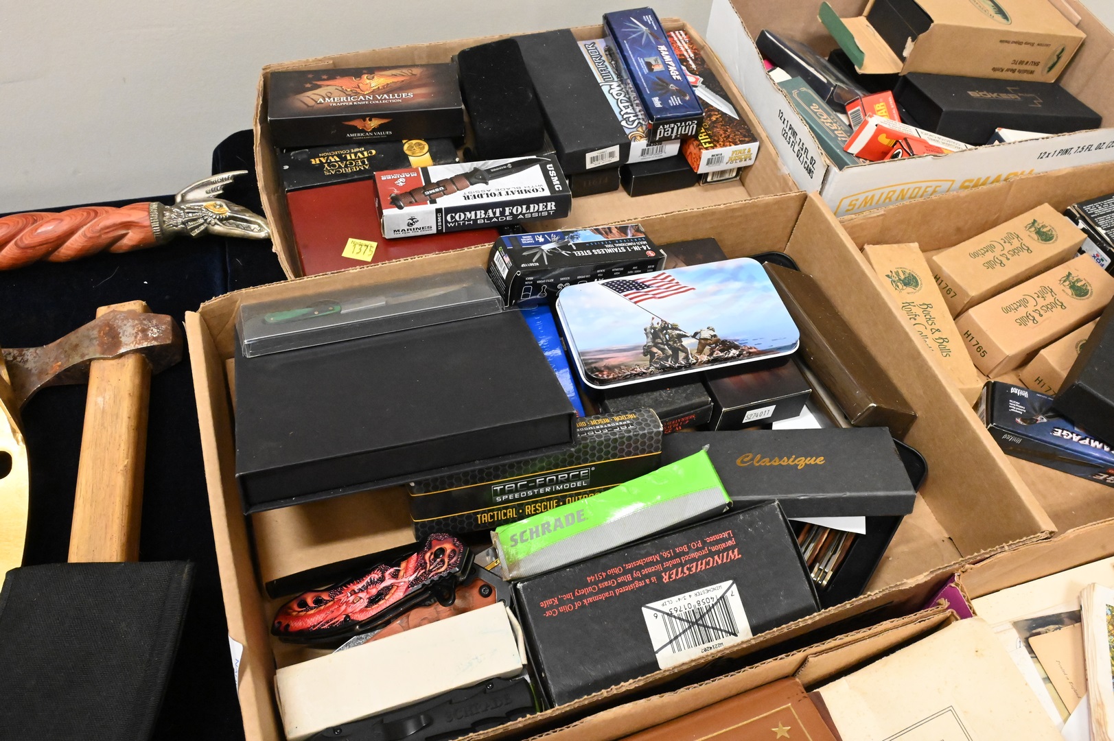 Four Tray Lots of Pocket and Buck Knives, to include American Values, Rampage, Tac-forces, Schrade, Bucks and Bulls, along with Ridge Runner, Provenance: Estate of Cyril H. Moore Jr, Kent, Connecticut.