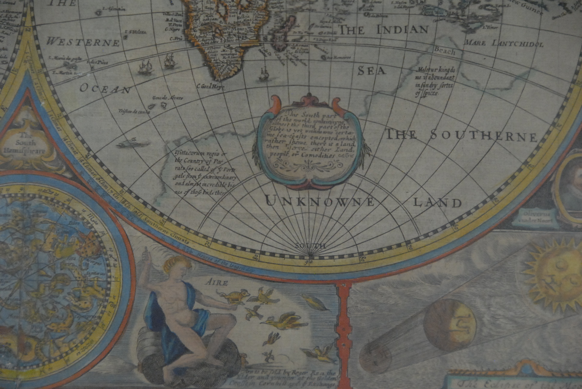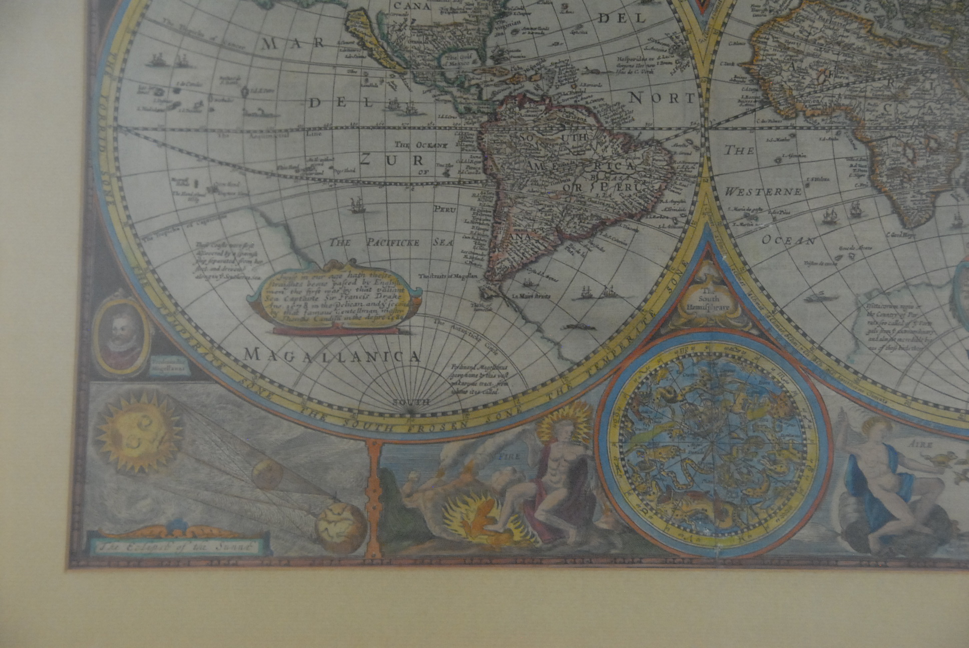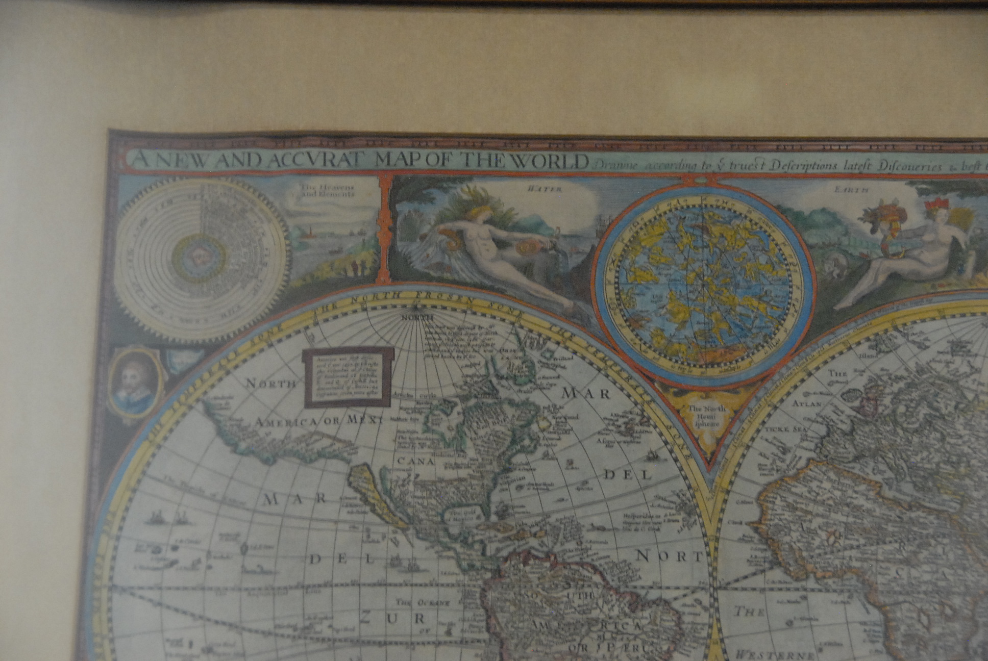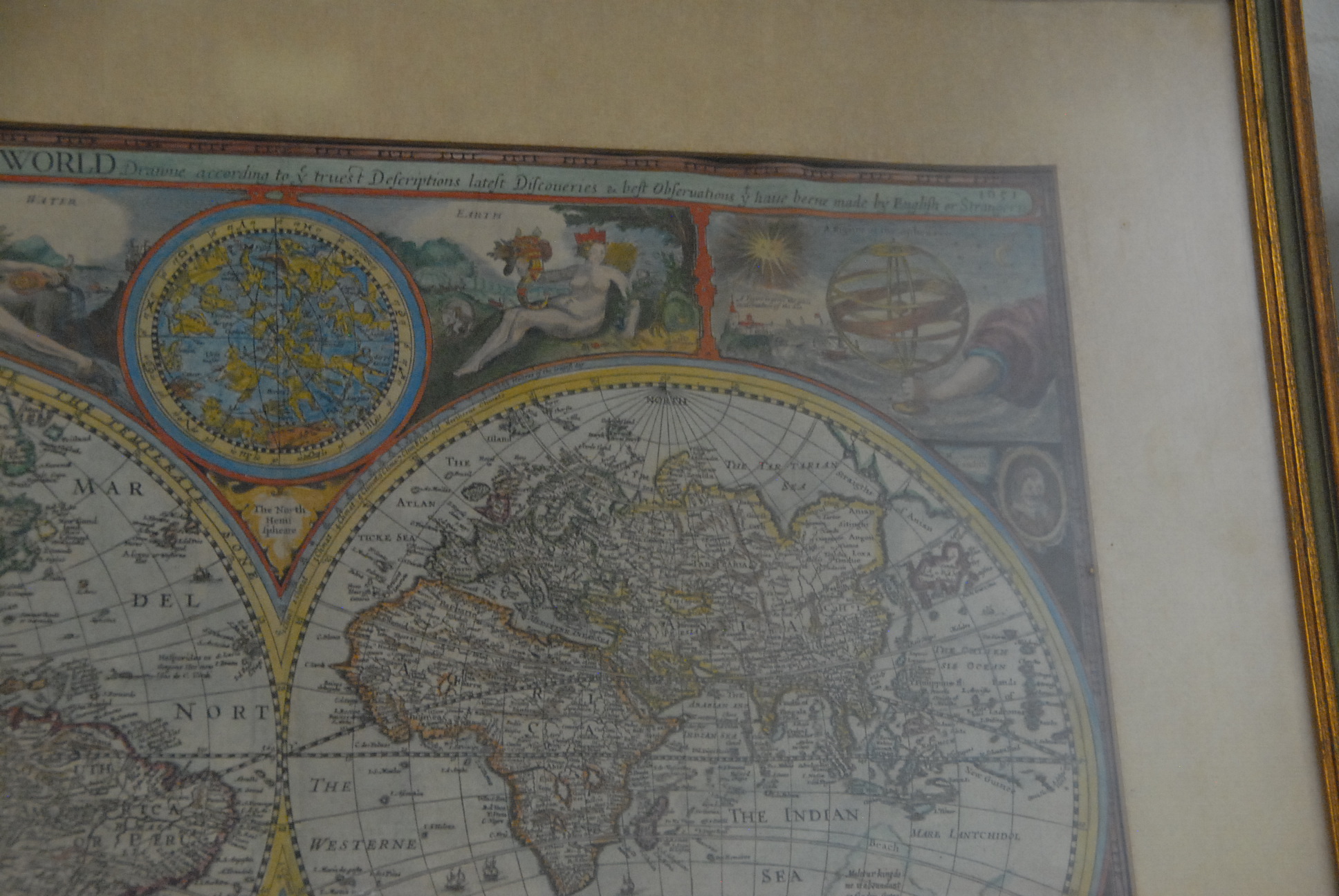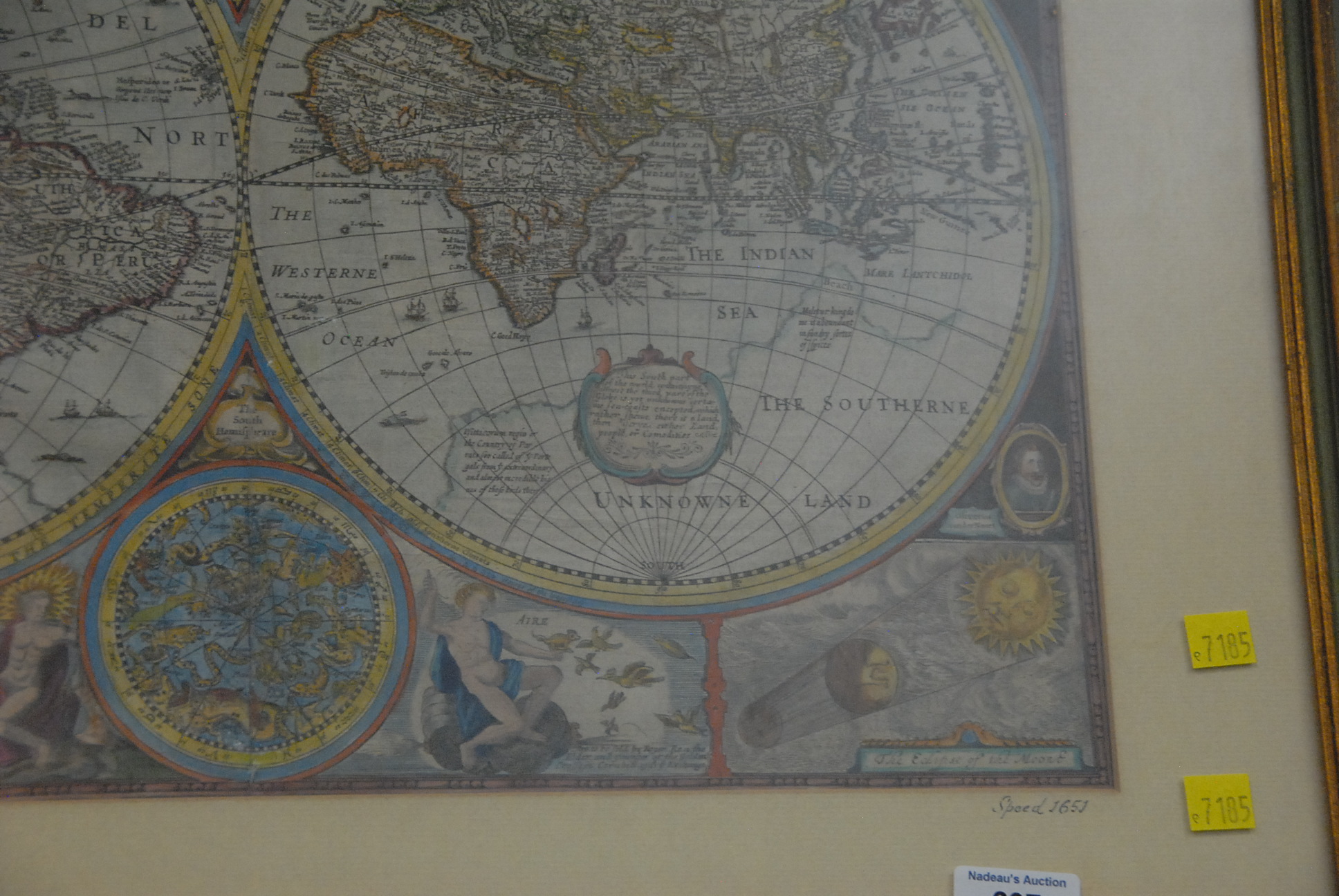 Lot 297: Framed map by John Speed dated 1651, hand colored engraving, twin-hemisphere map of the world fully titled: A New and Accurate Map of The Word Drawne according to ye truest Descriptions latest Discoveries & best Observations yet have been made by En