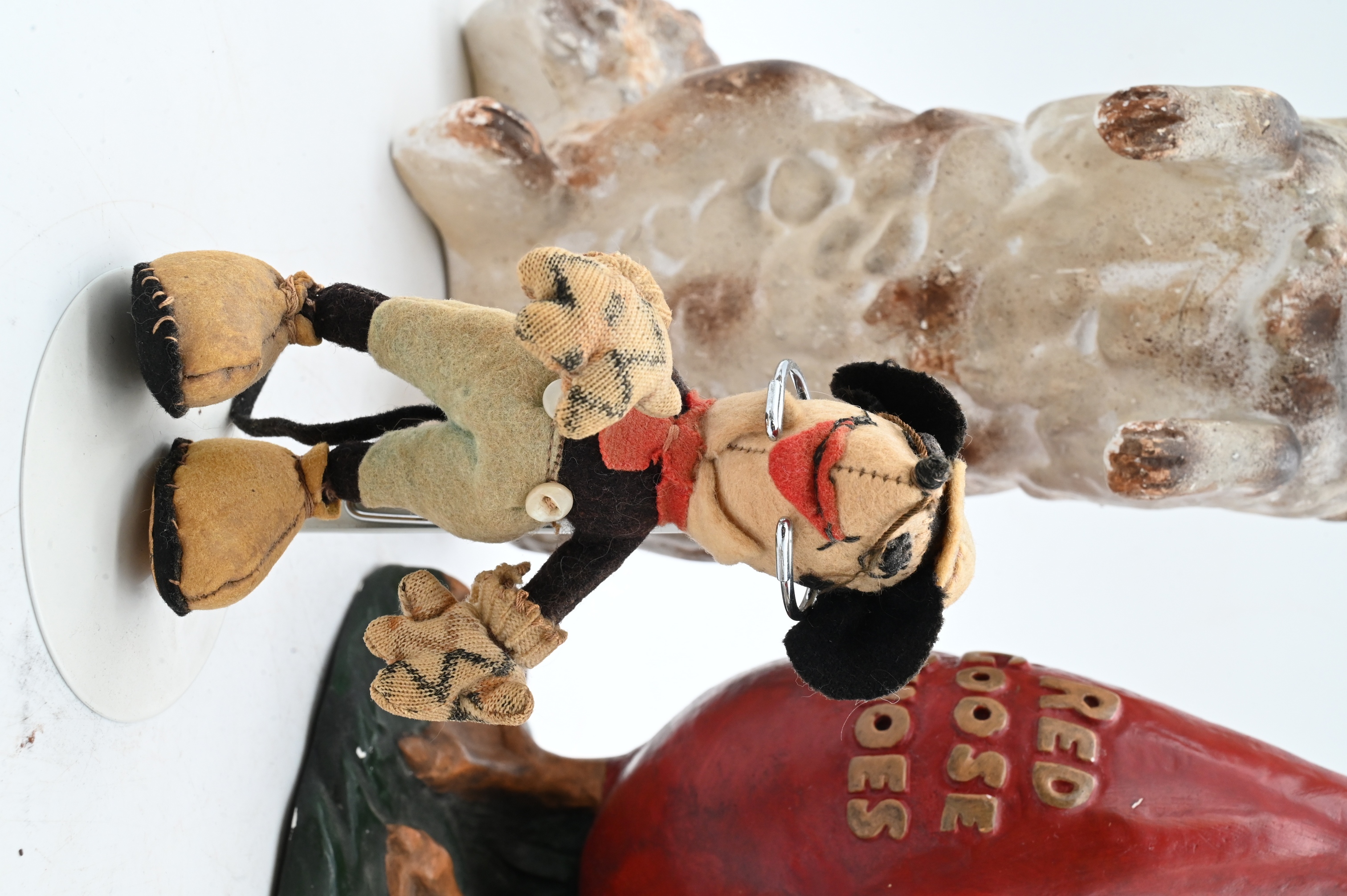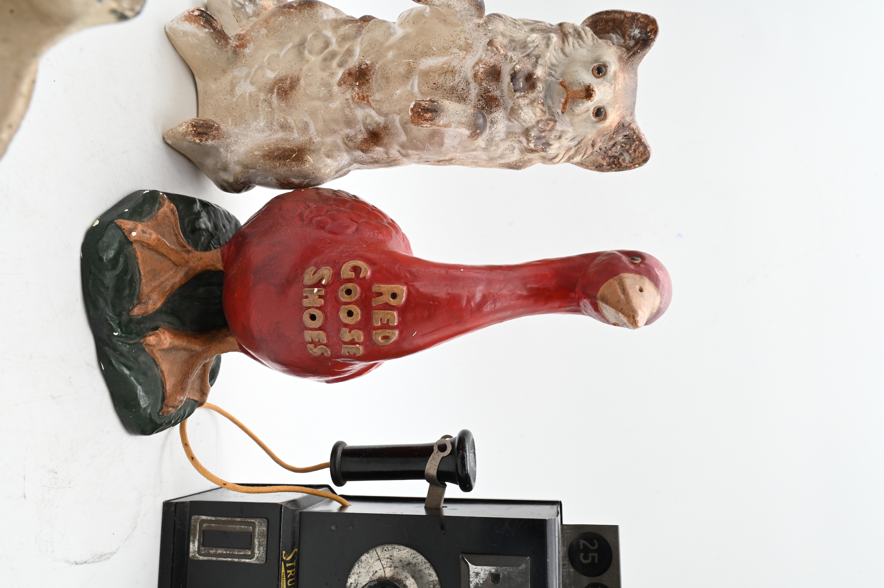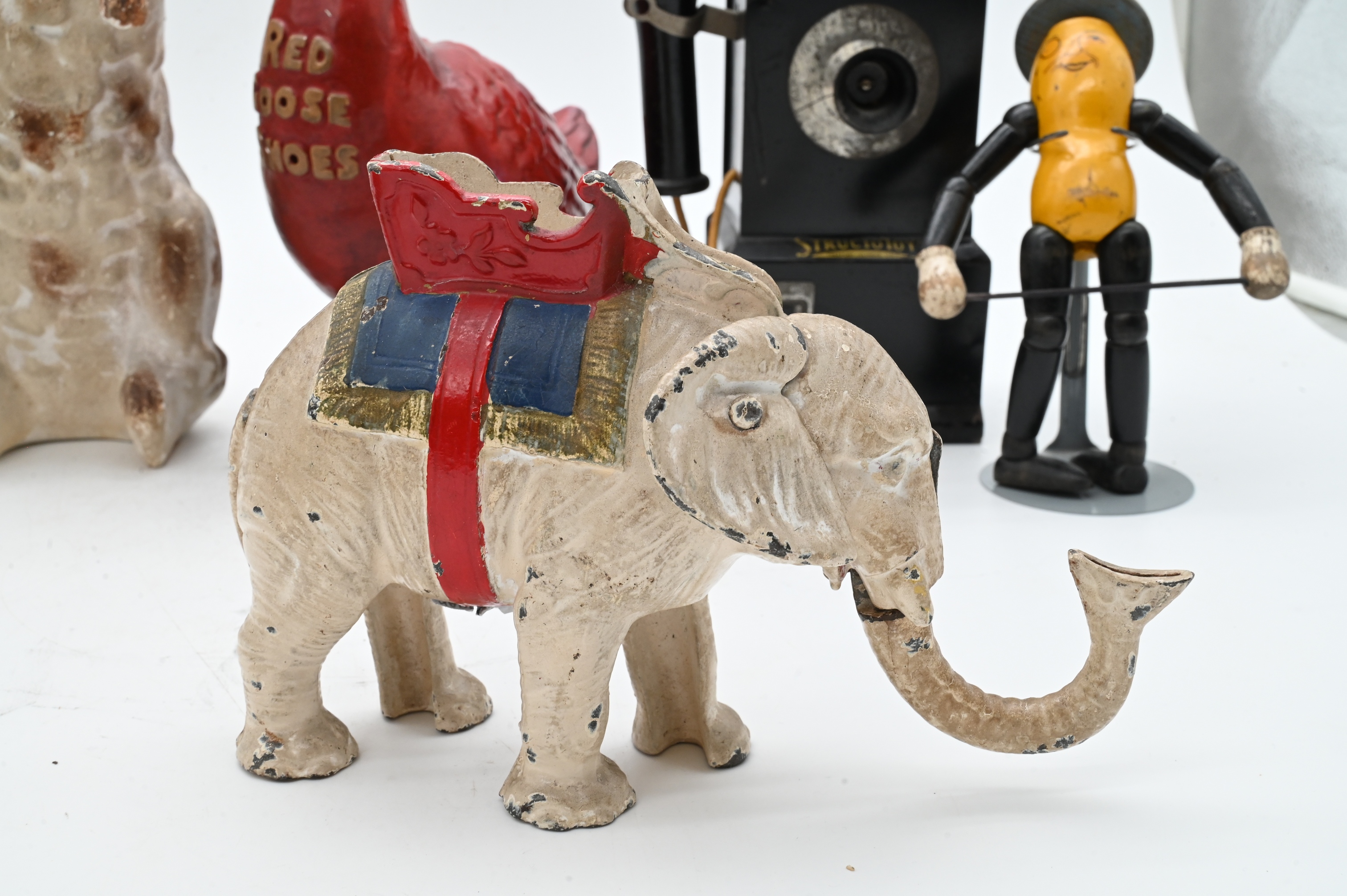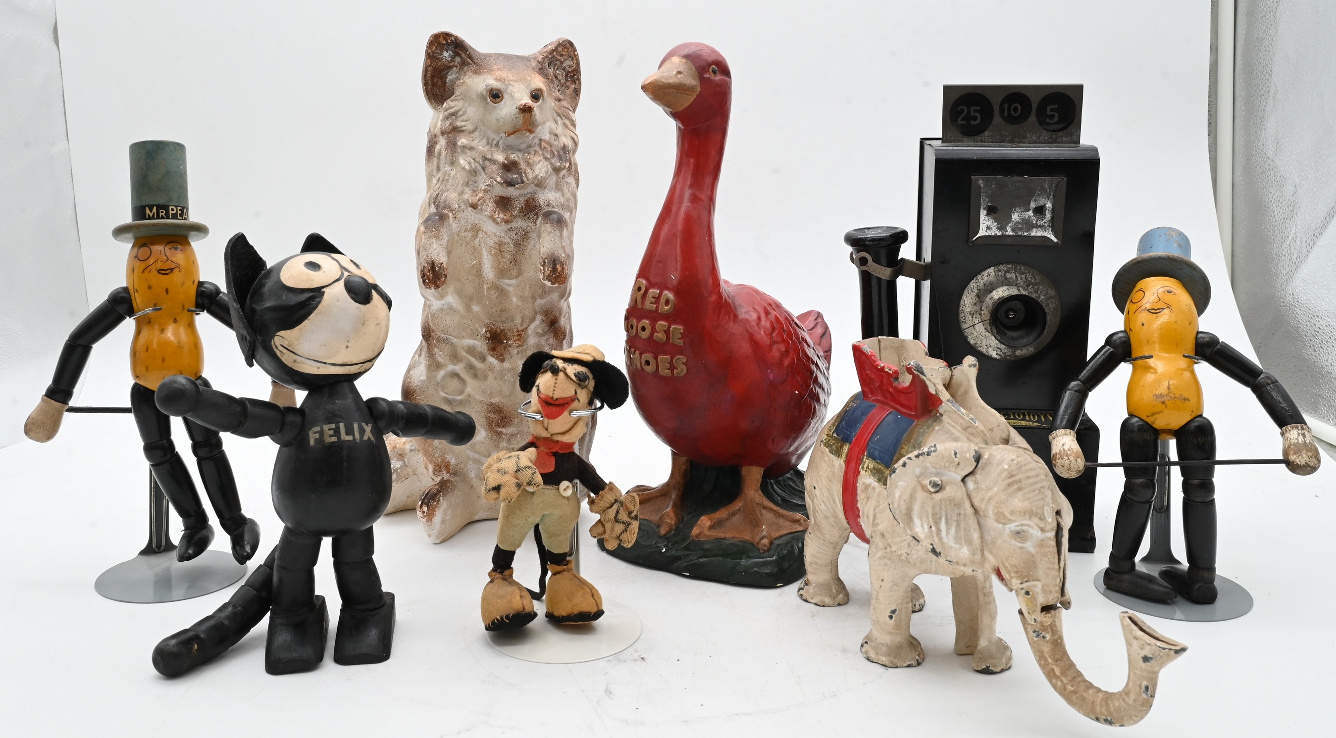 Red Goose Shoes chalkware goose figure with great paint, 11 1/2 inches, two 1930’s Planters Mr. Peanut wood jointed advertising doll, height 9 inches, Hubley Elephant Mechanical Bank painted cast iron having articulating trunk, Structo Toys telephone coin bank, Wood Felix Cat by Pat Sullivan 1925, chalkware seated pomeranian dog etc..