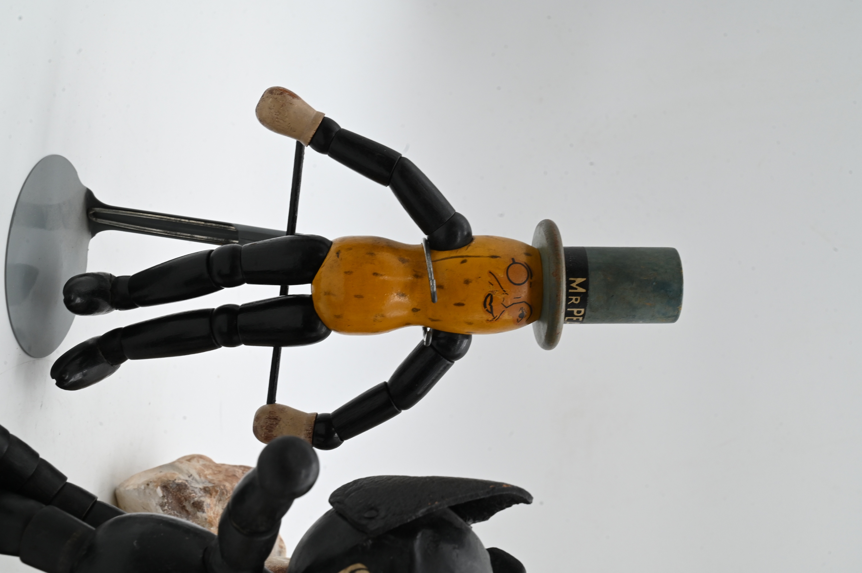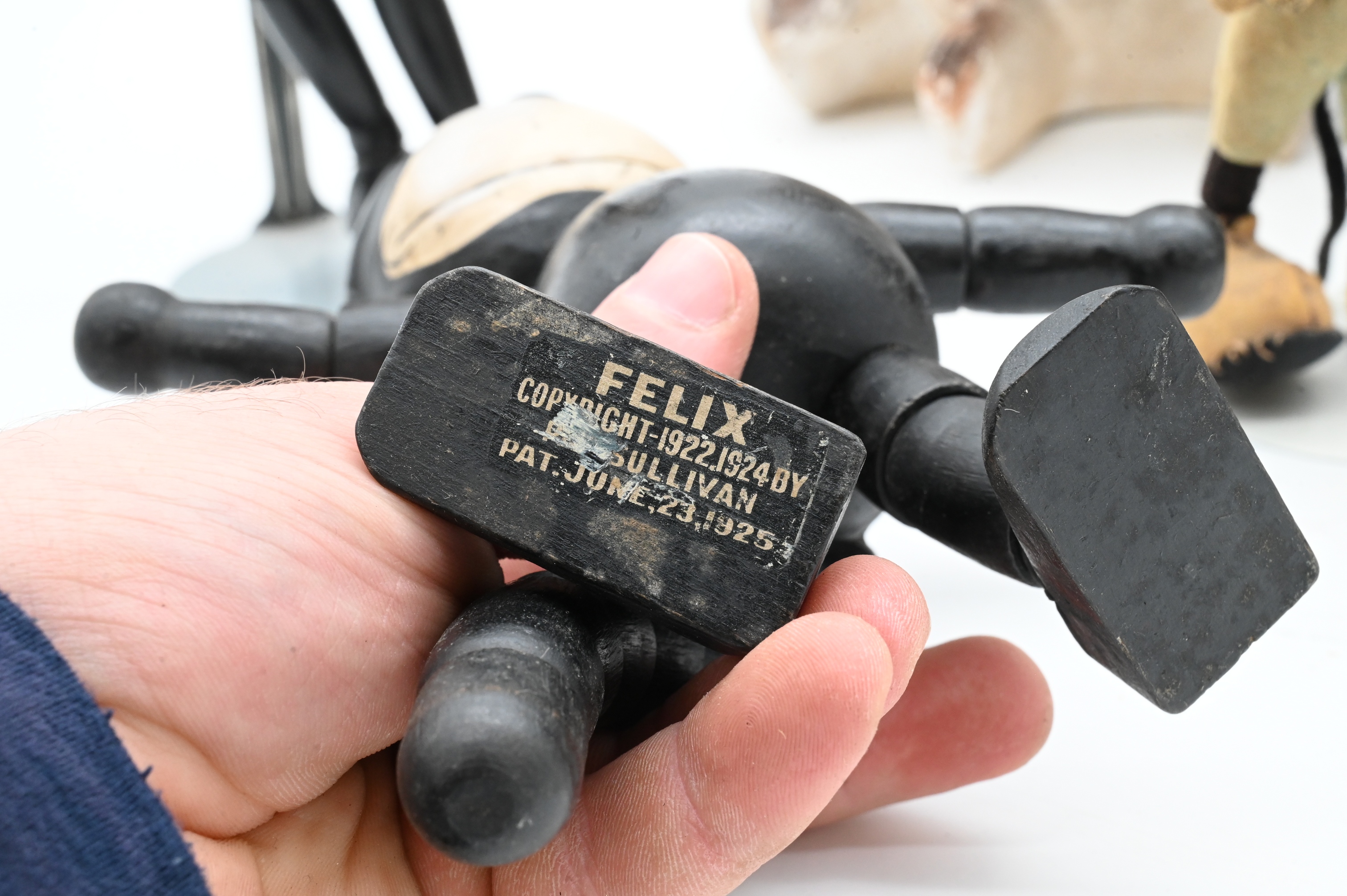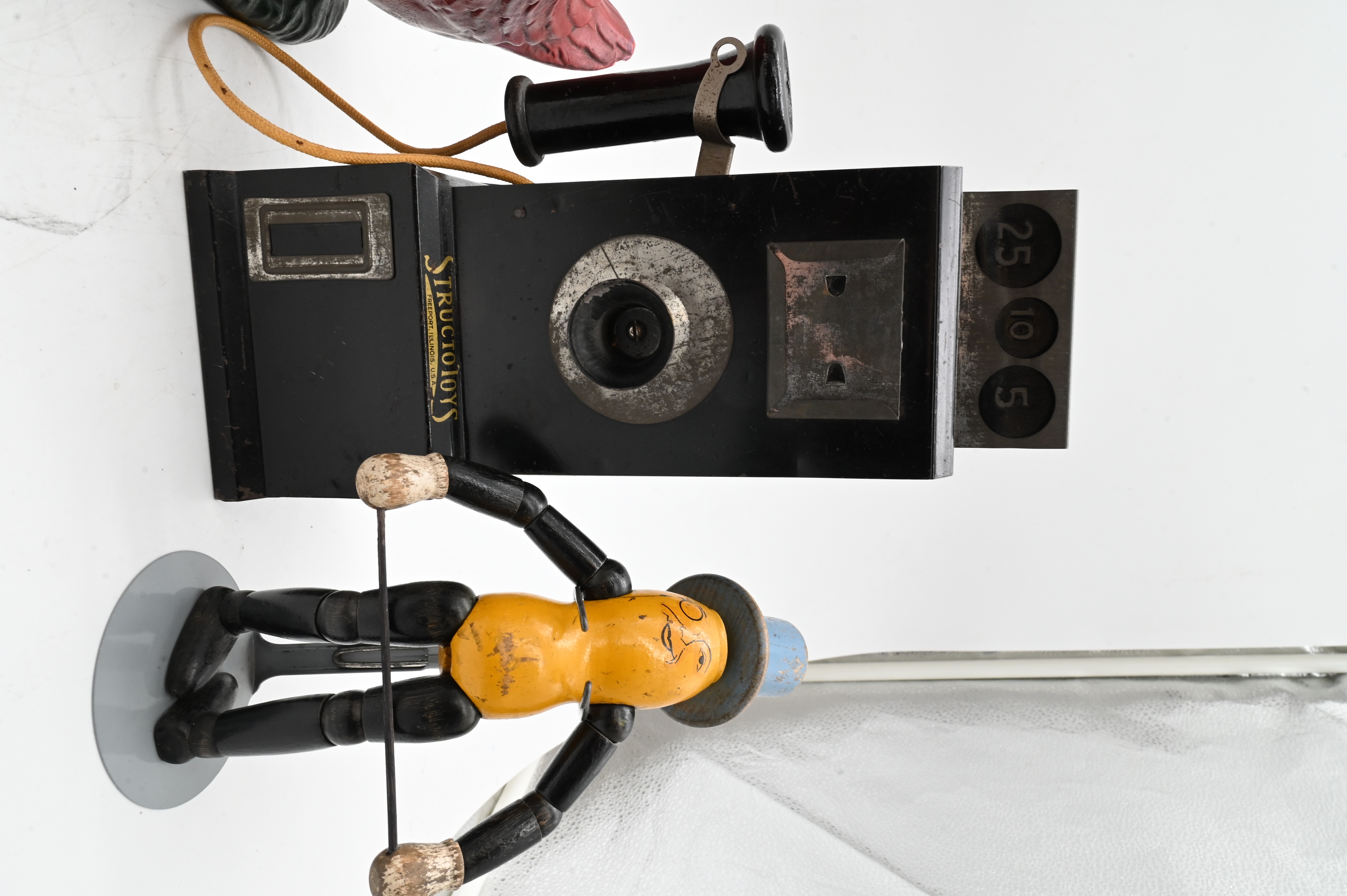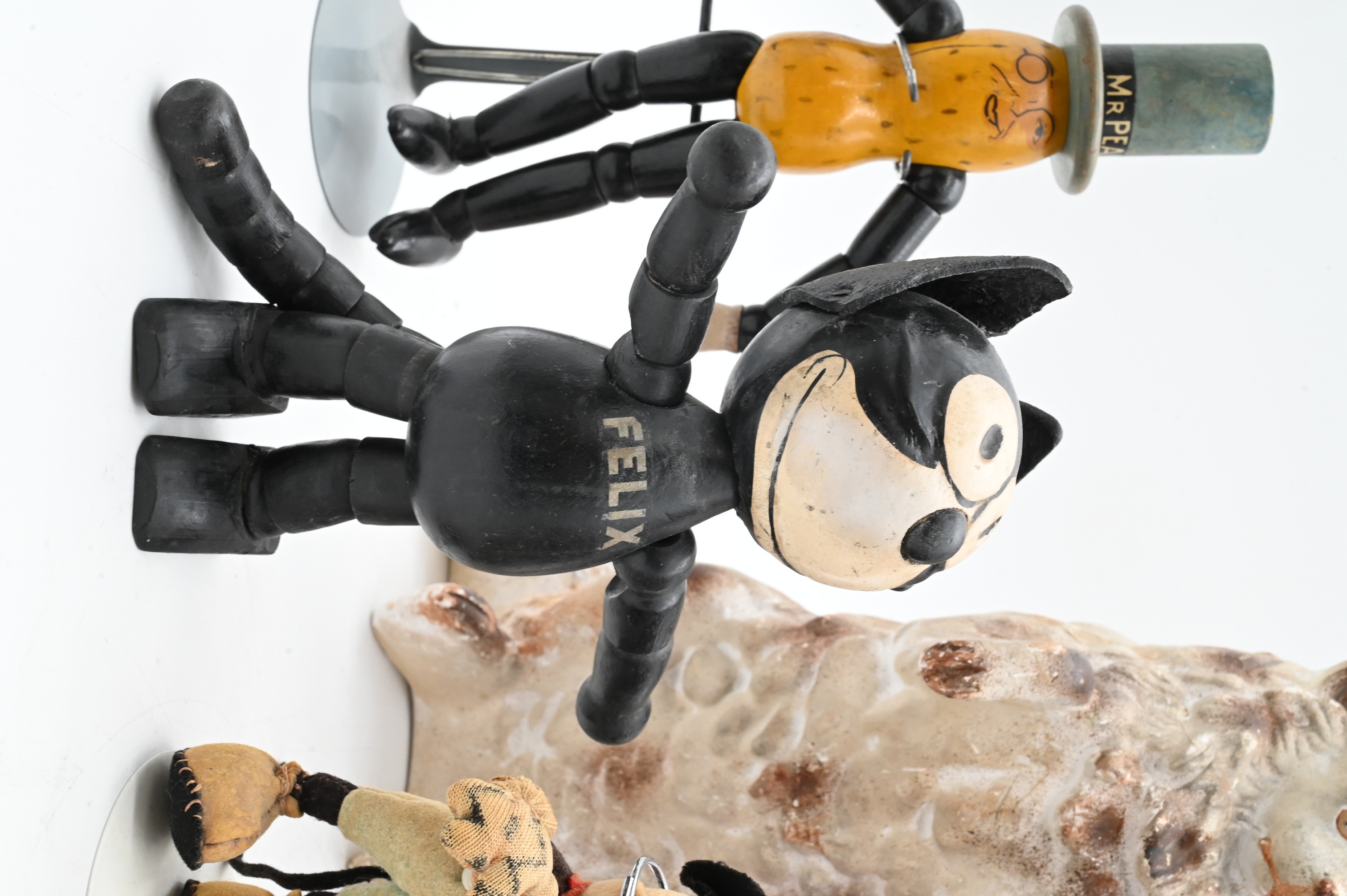 Red Goose Shoes chalkware goose figure with great paint, 11 1/2 inches, two 1930’s Planters Mr. Peanut wood jointed advertising doll, height 9 inches, Hubley Elephant Mechanical Bank painted cast iron having articulating trunk, Structo Toys telephone coin bank, Wood Felix Cat by Pat Sullivan 1925, chalkware seated pomeranian dog etc..