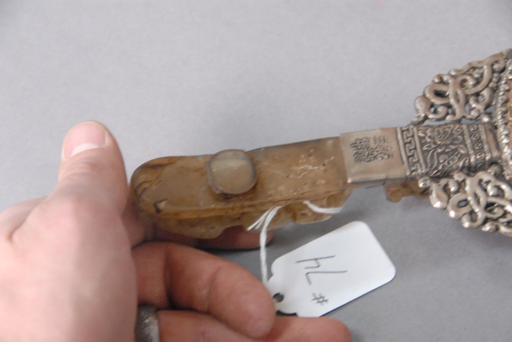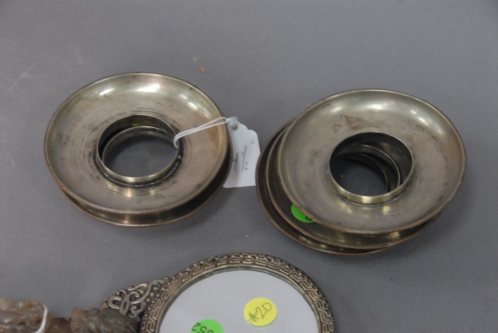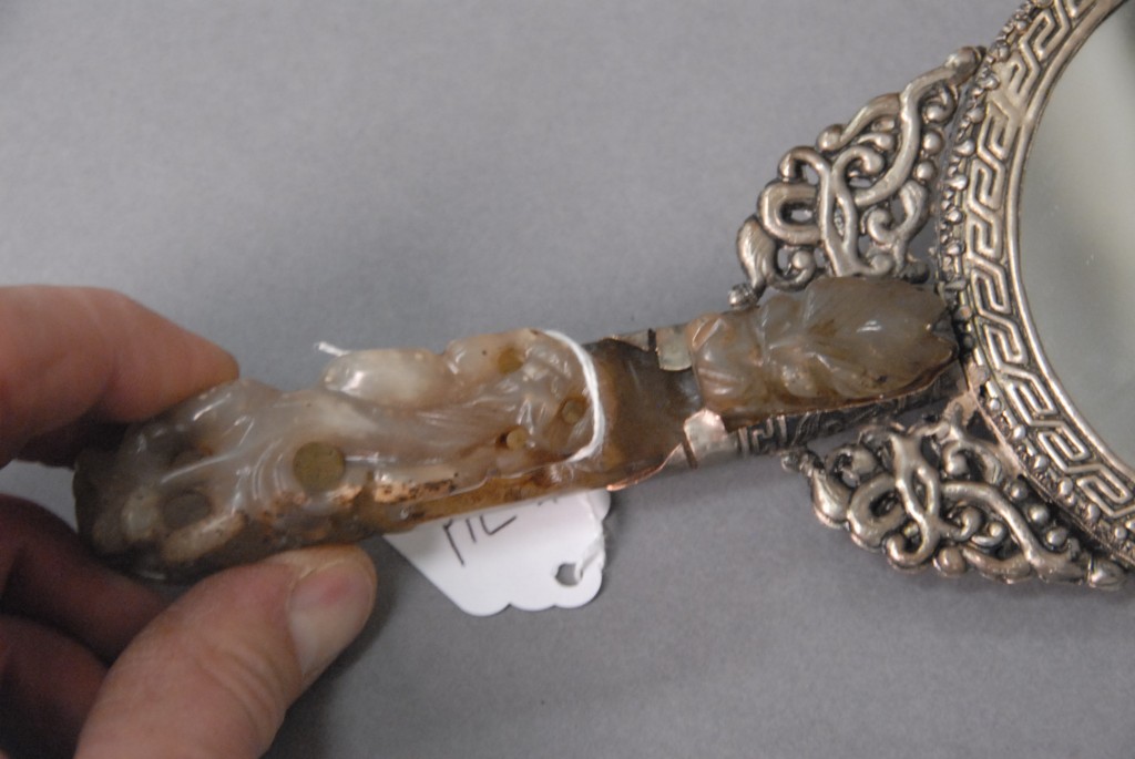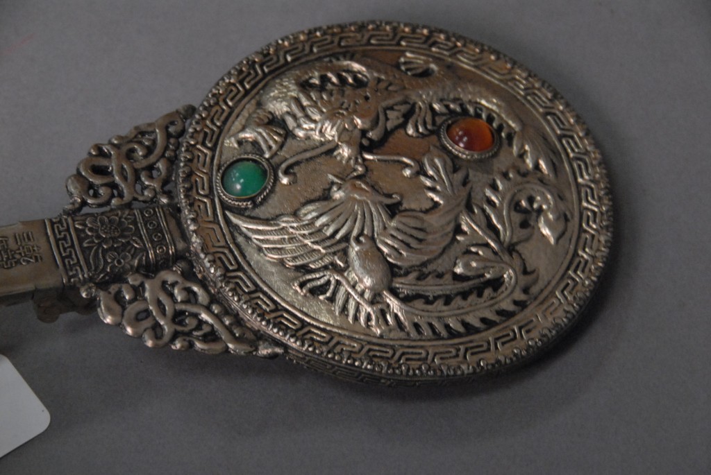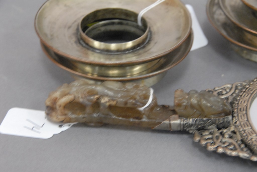 Hardstone dragon handled mirror with silver frame and five metal saucers lg. of mirror 9 1/2.