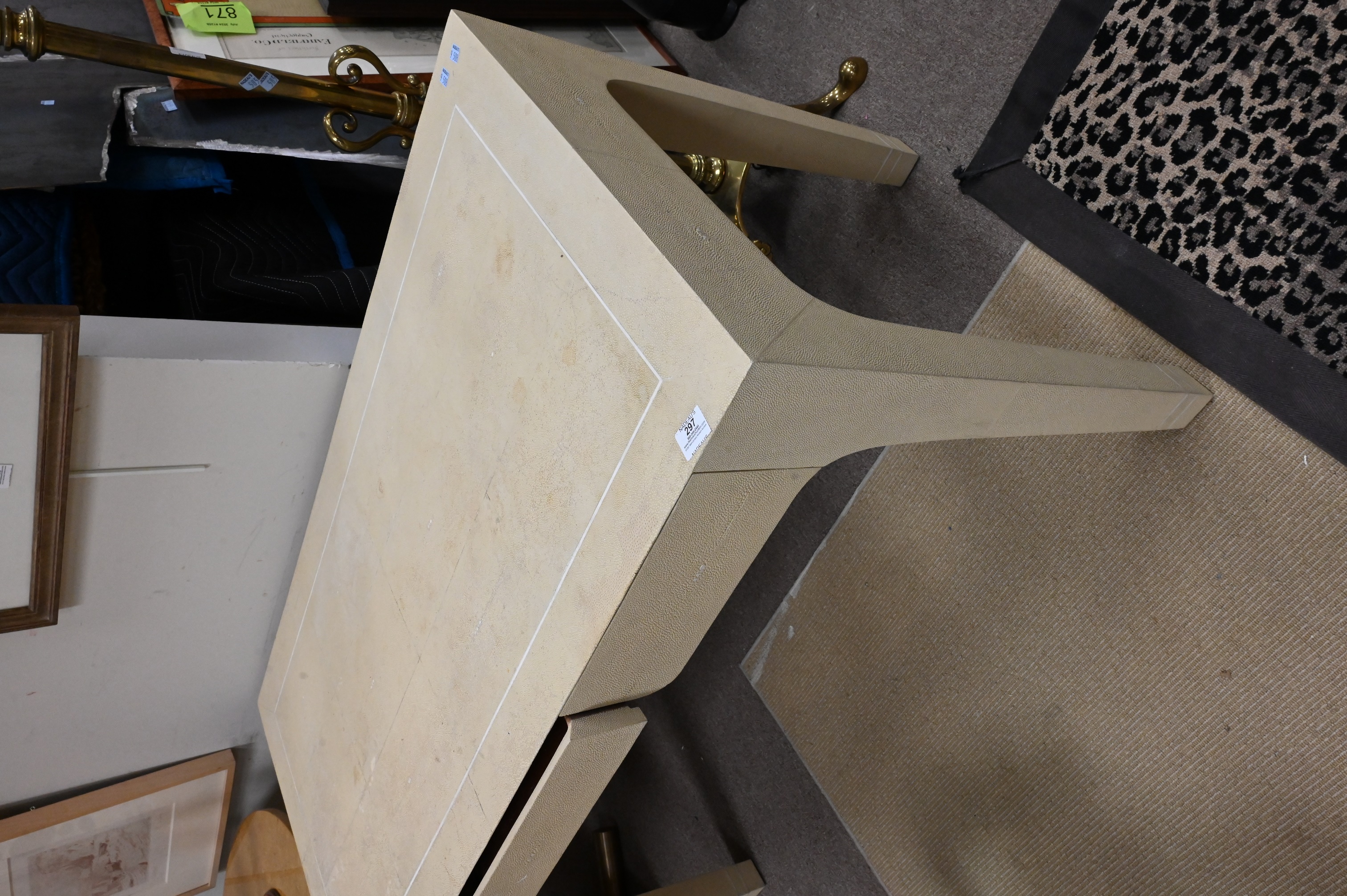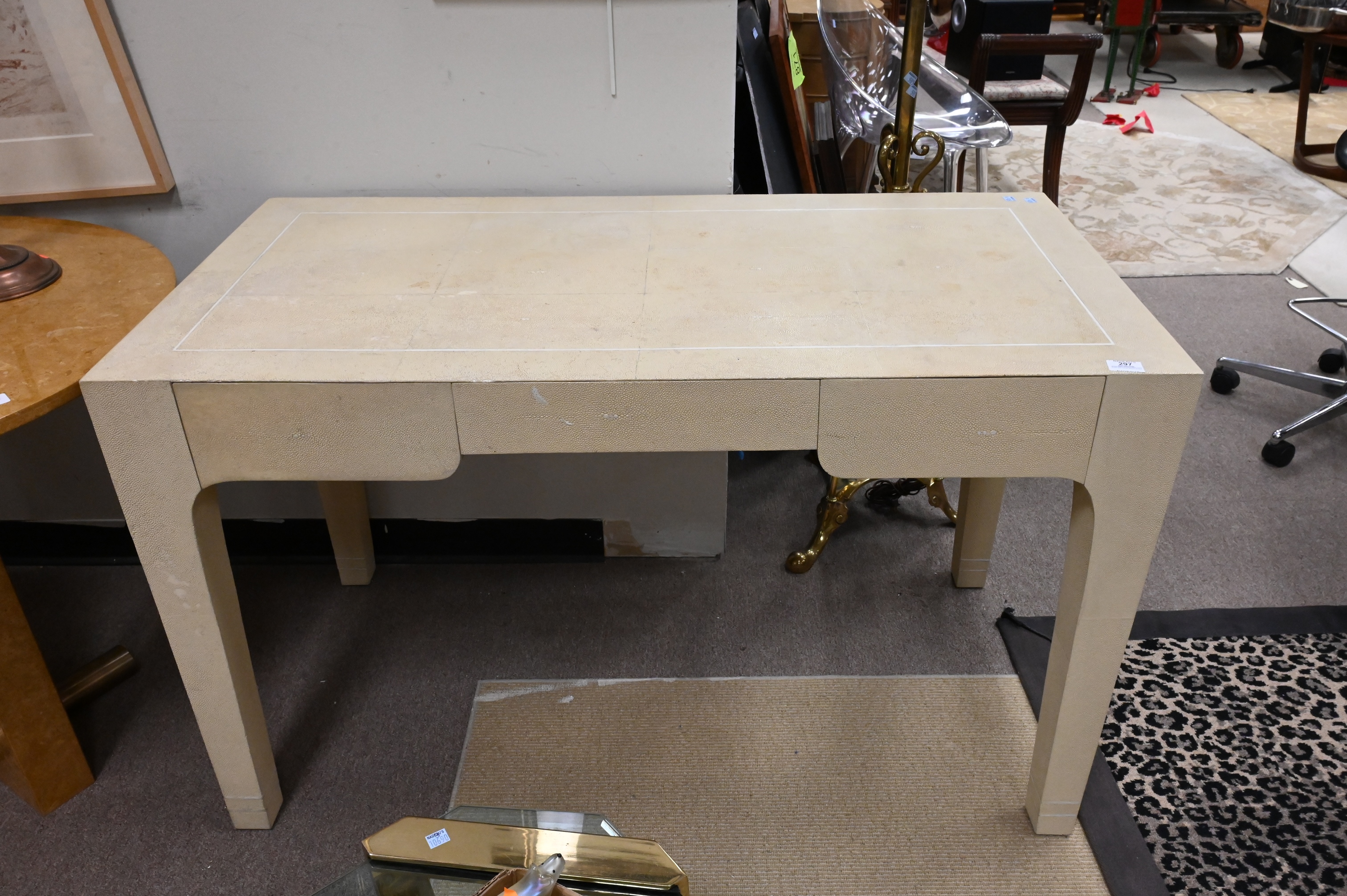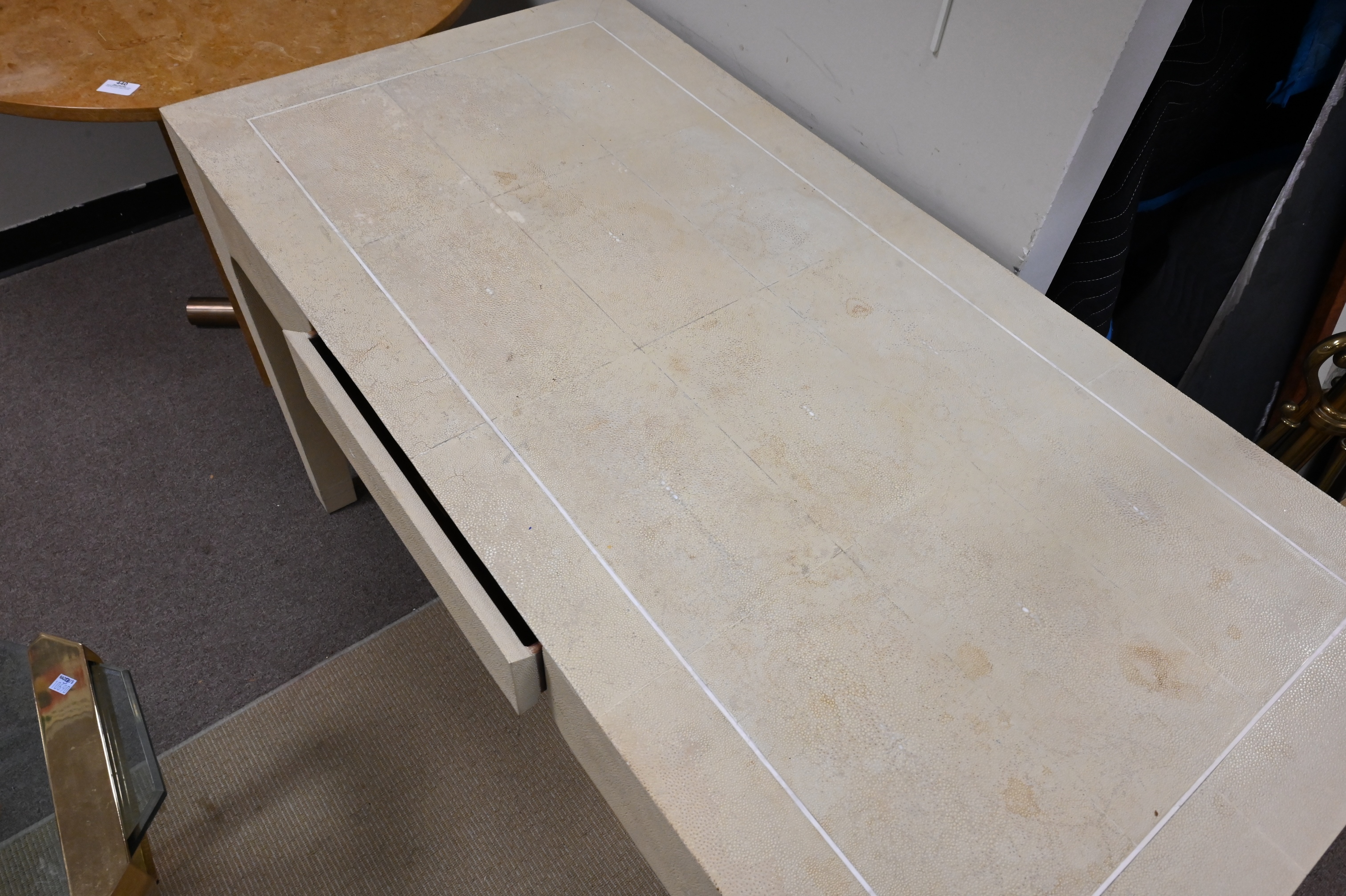 shagreen with inlaid line and three drawers, signed Karl Springer with brass tag in drawer, circa 1970