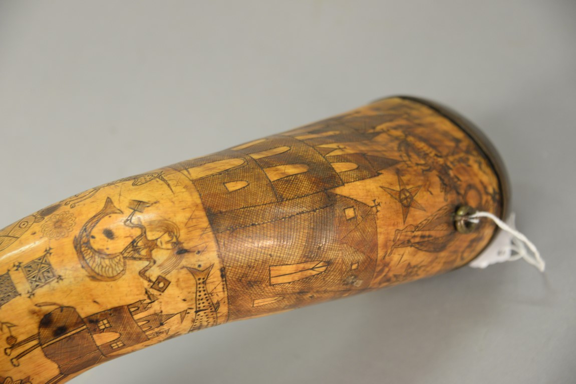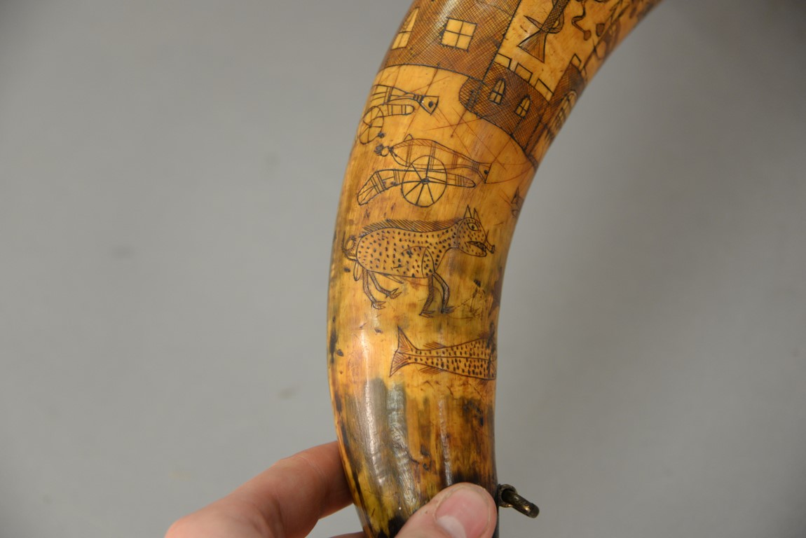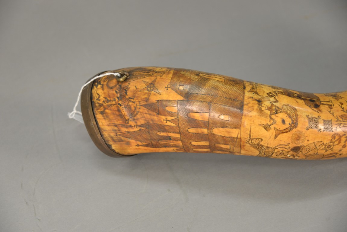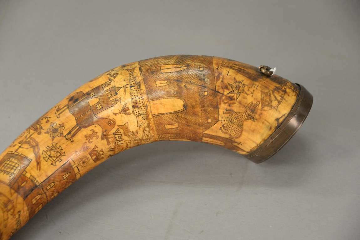 Lot 297: Large powder horn having scrimshaw buildings, mermaid, fish, animals, and cannon with brass ends, initialed WEM, late 18th to early 19th century. lg. 17 1/2 in.
