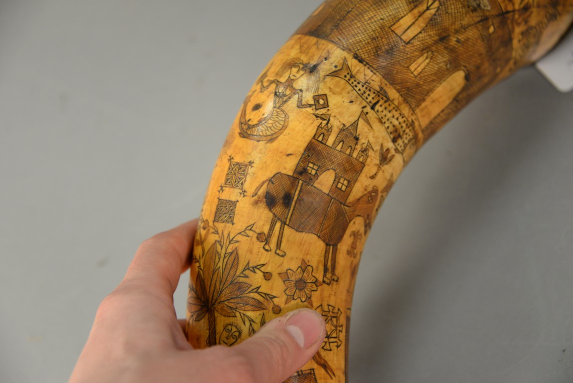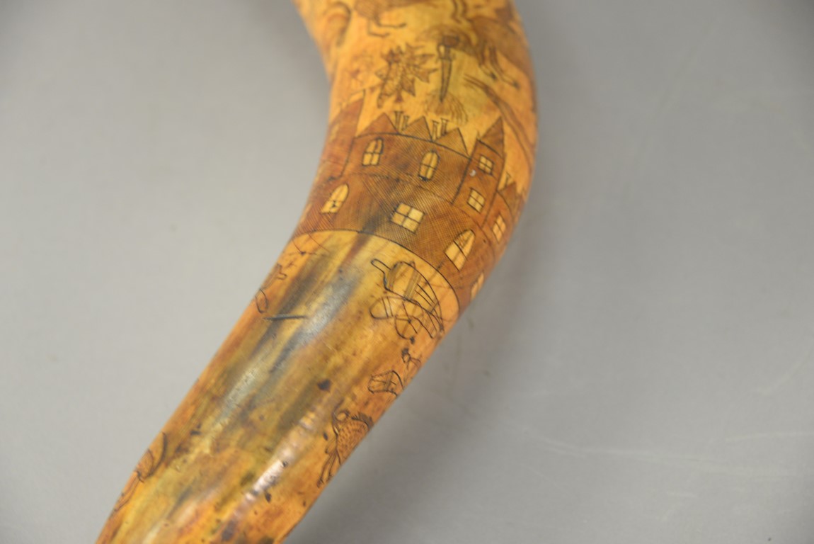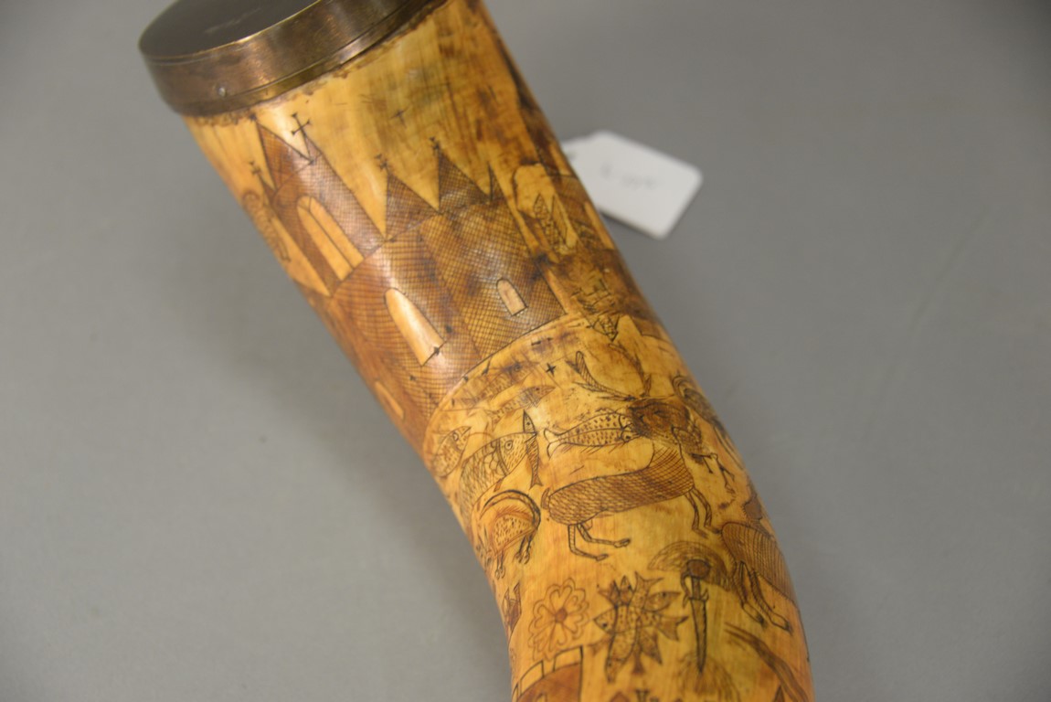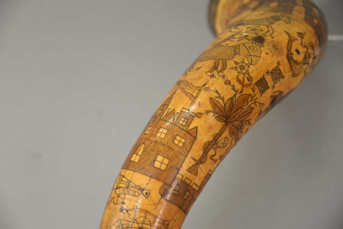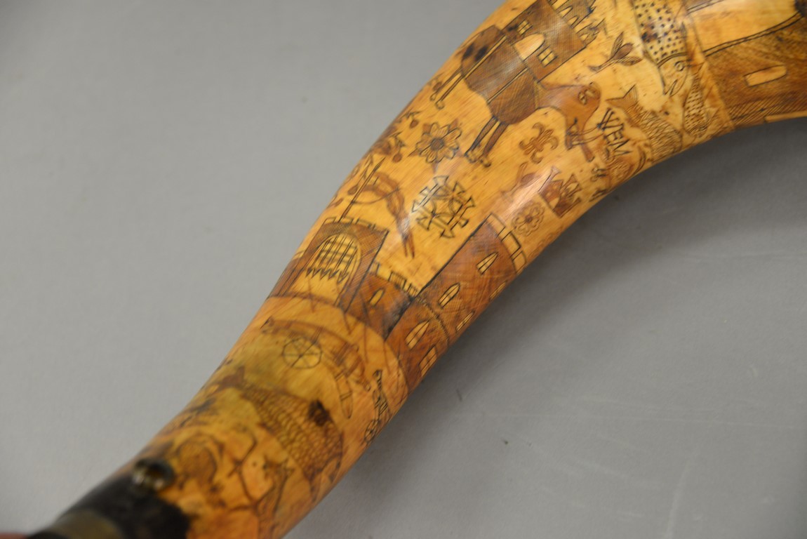Lot 297: Large powder horn having scrimshaw buildings, mermaid, fish, animals, and cannon with brass ends, initialed WEM, late 18th to early 19th century. lg. 17 1/2 in.