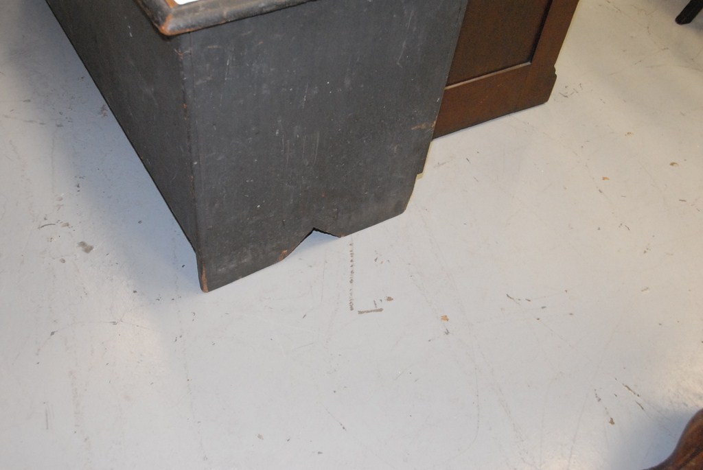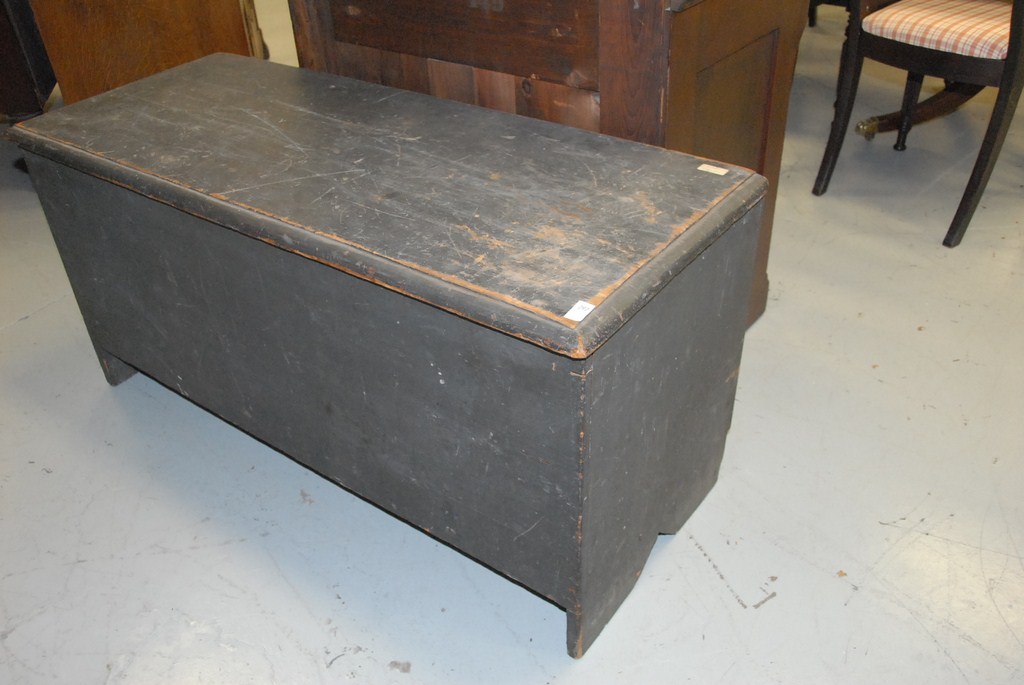 Lot 297: Lift top blanket chest on bootjack ends slightly low in original dark grey paint being sold to benefit a Connecticut Museum.