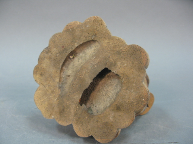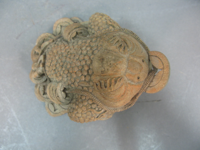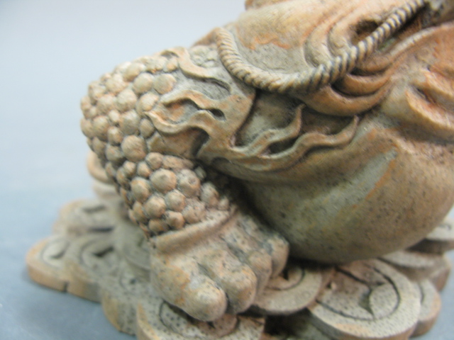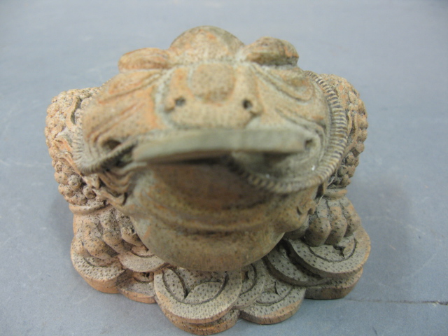 Oriental carved bull frog having carved disc in his mouth and standing on discs.