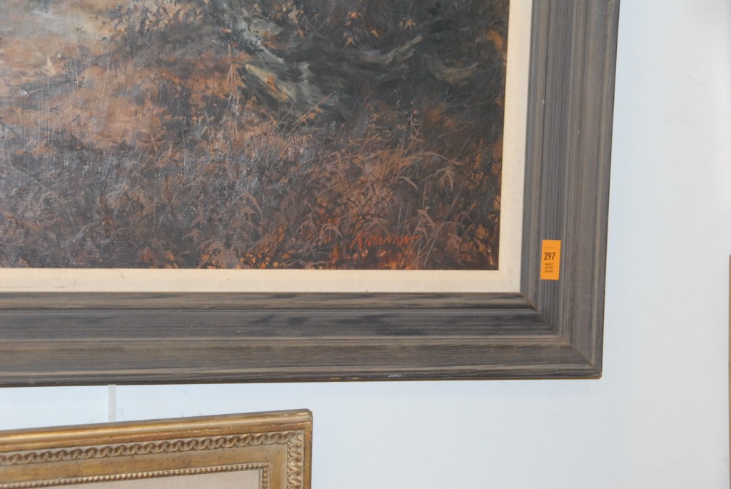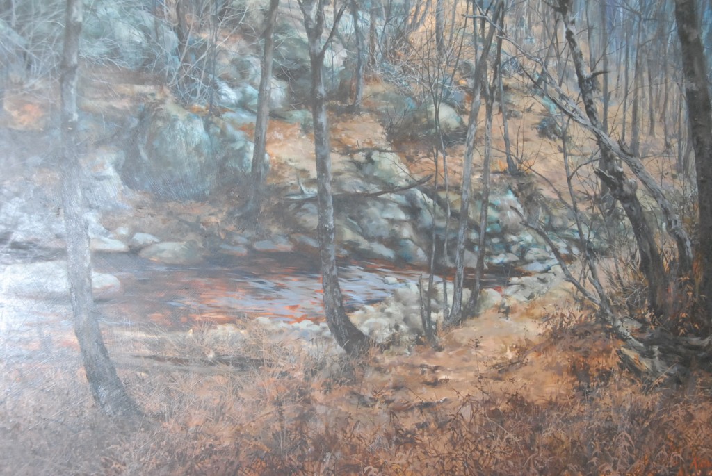Painting Kijanka oil on canvas brook in wooded landscape.