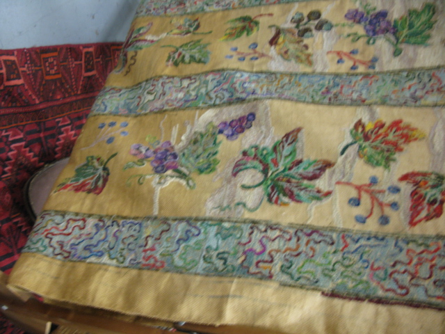 Lot 297: Partially hooked rug on a rack.