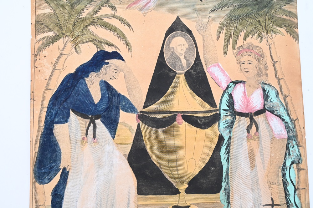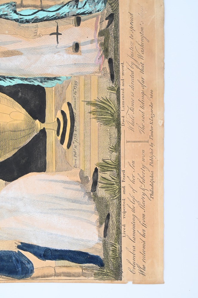 Lot 297: Pember and Luzarder, Lamenting the Death of Washington, 1800, engraving with hand coloring on paper paper size 12 x 9 5/8 inches.