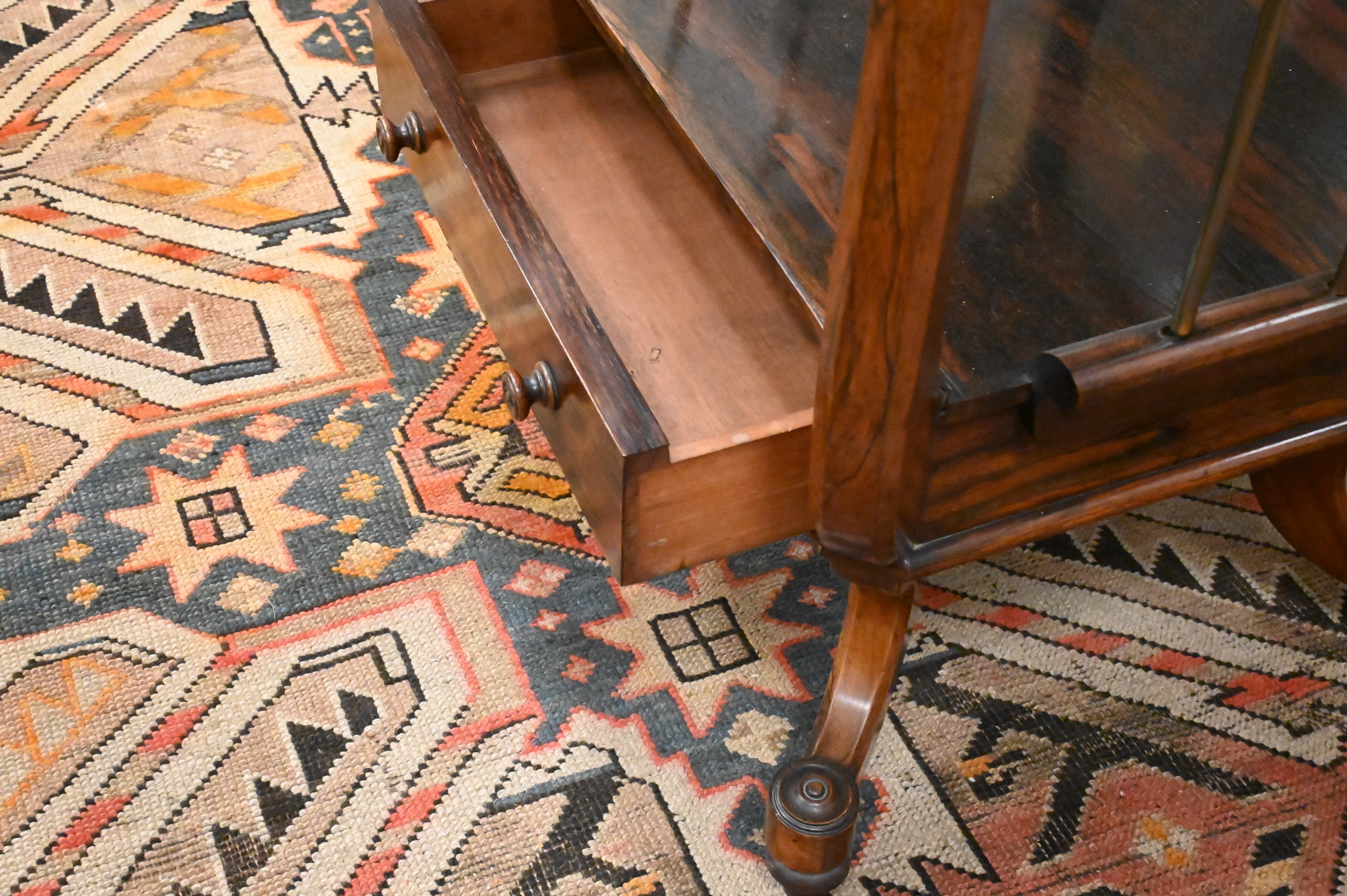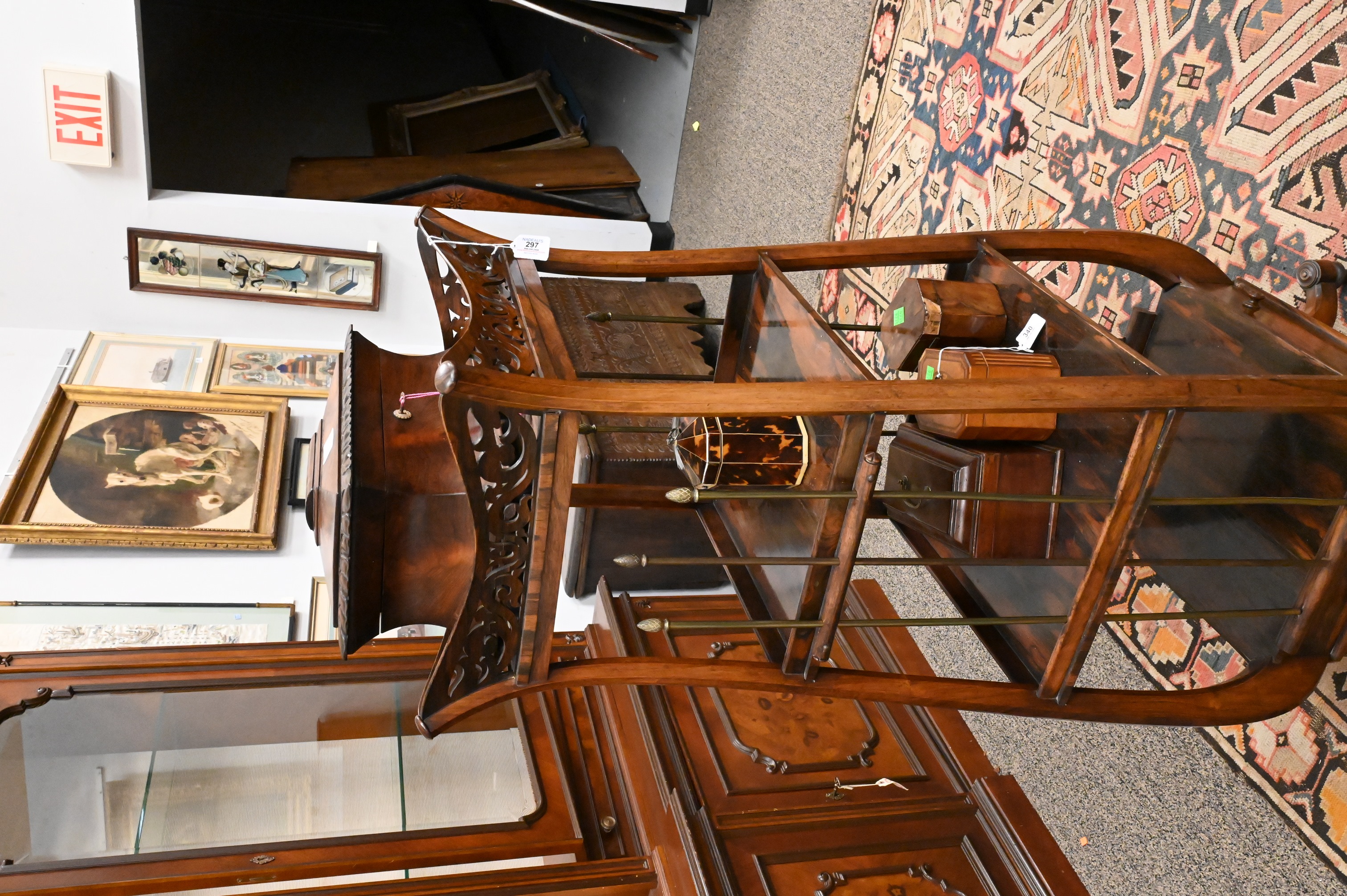 lyre form having pierced carved top brass rods, one drawer on four downswept members