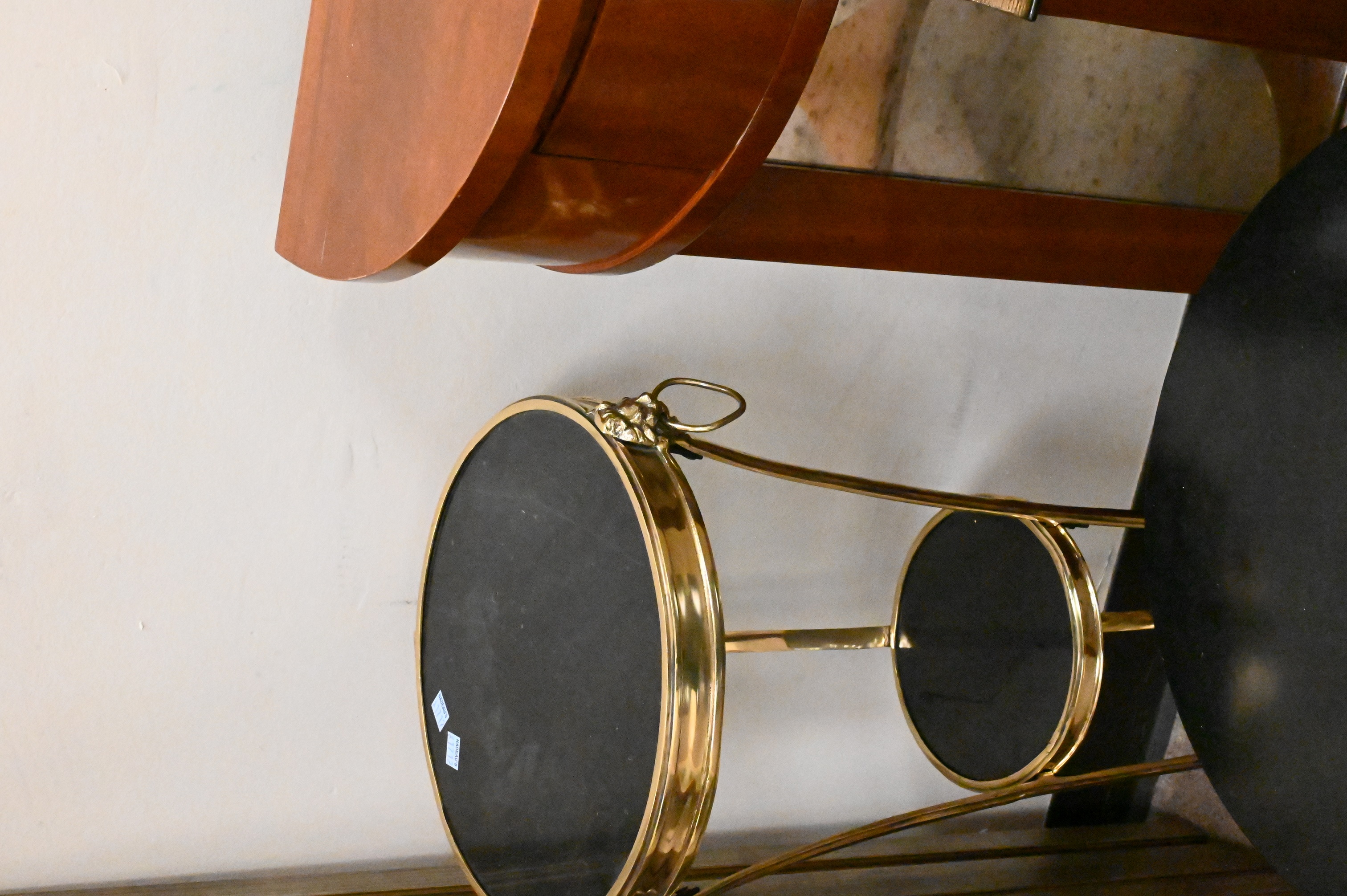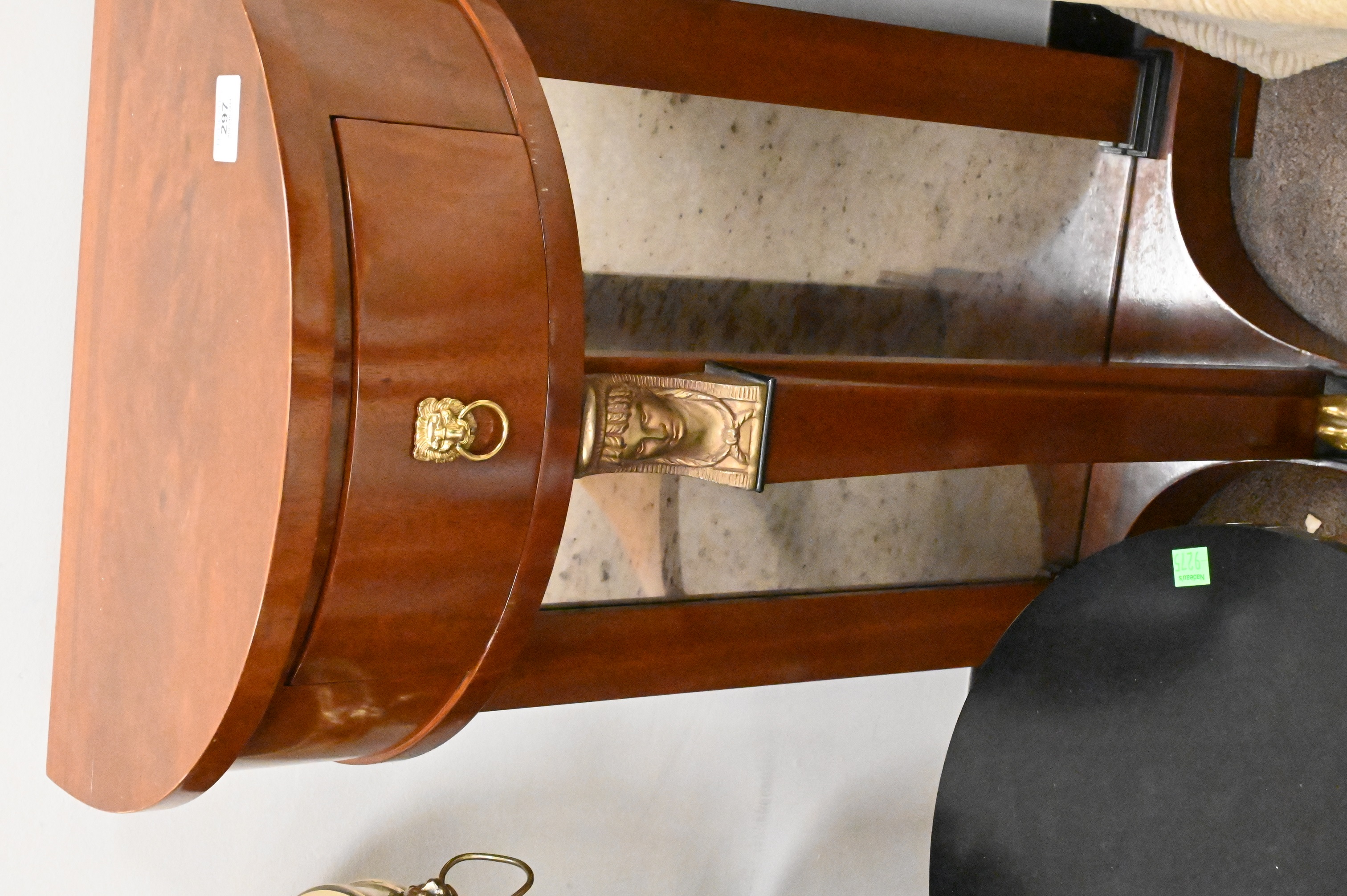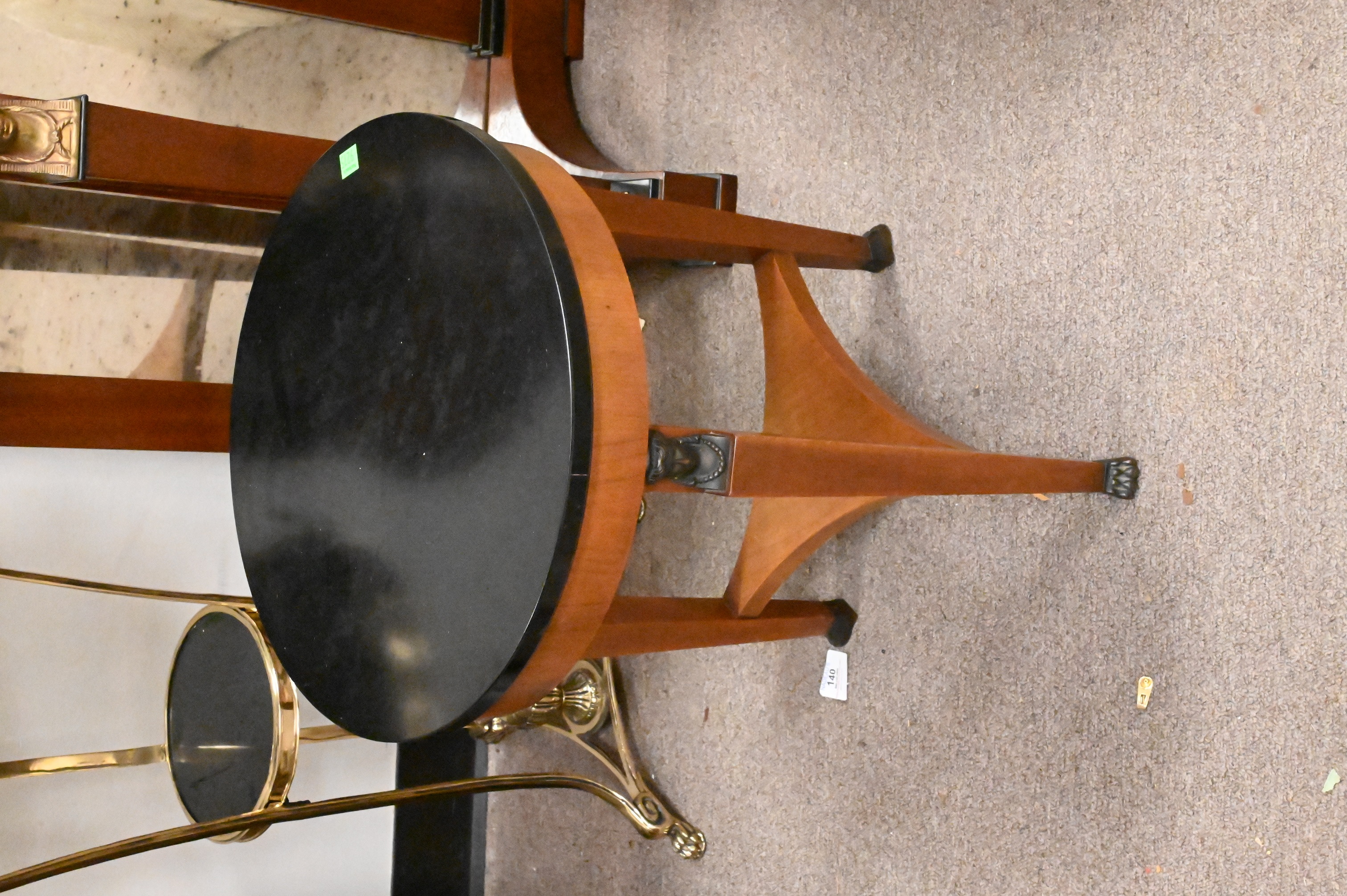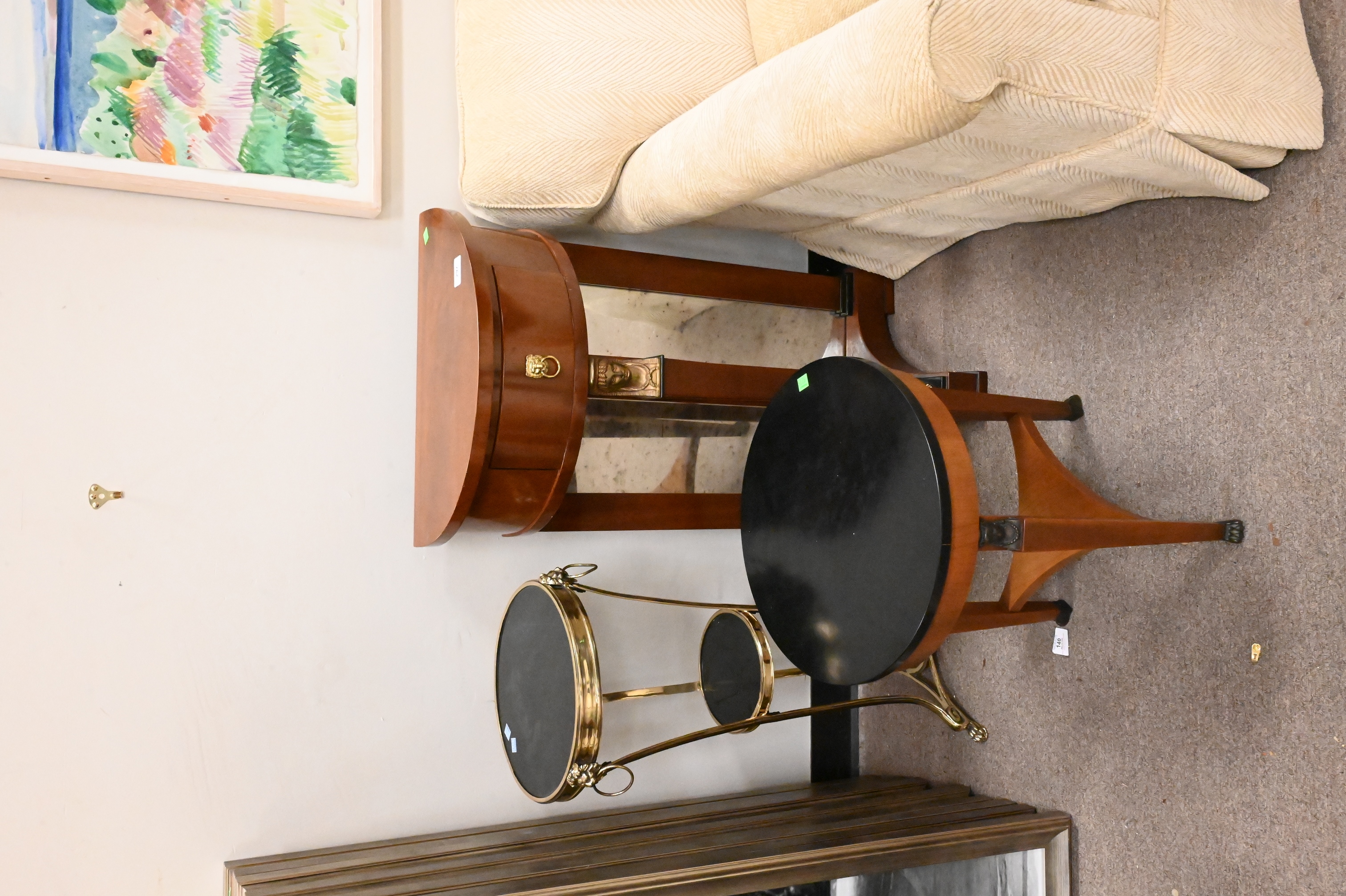 brass and granite Gueridon stand, Baker small round stand, demilune stand with drawer and mirror back