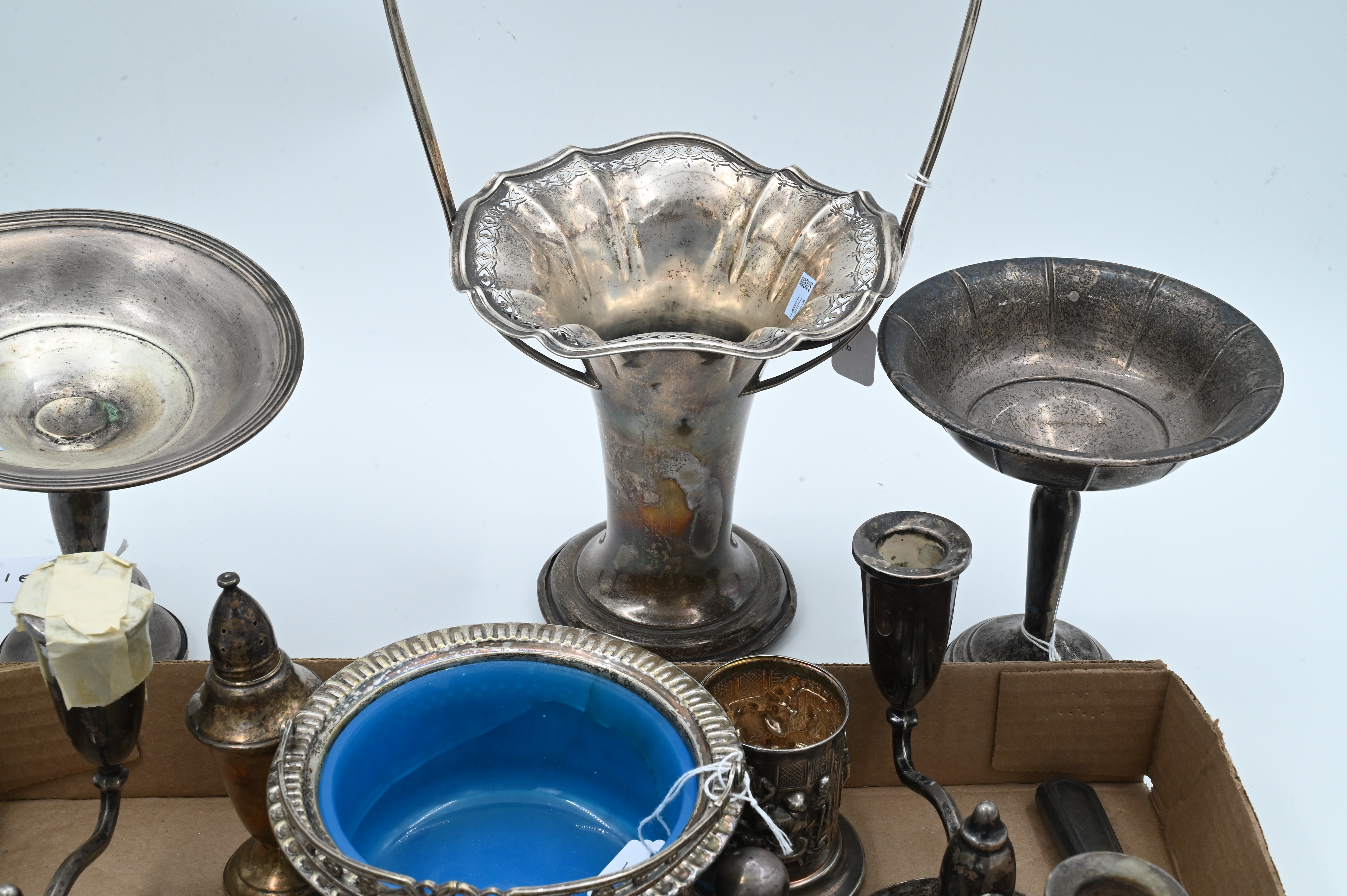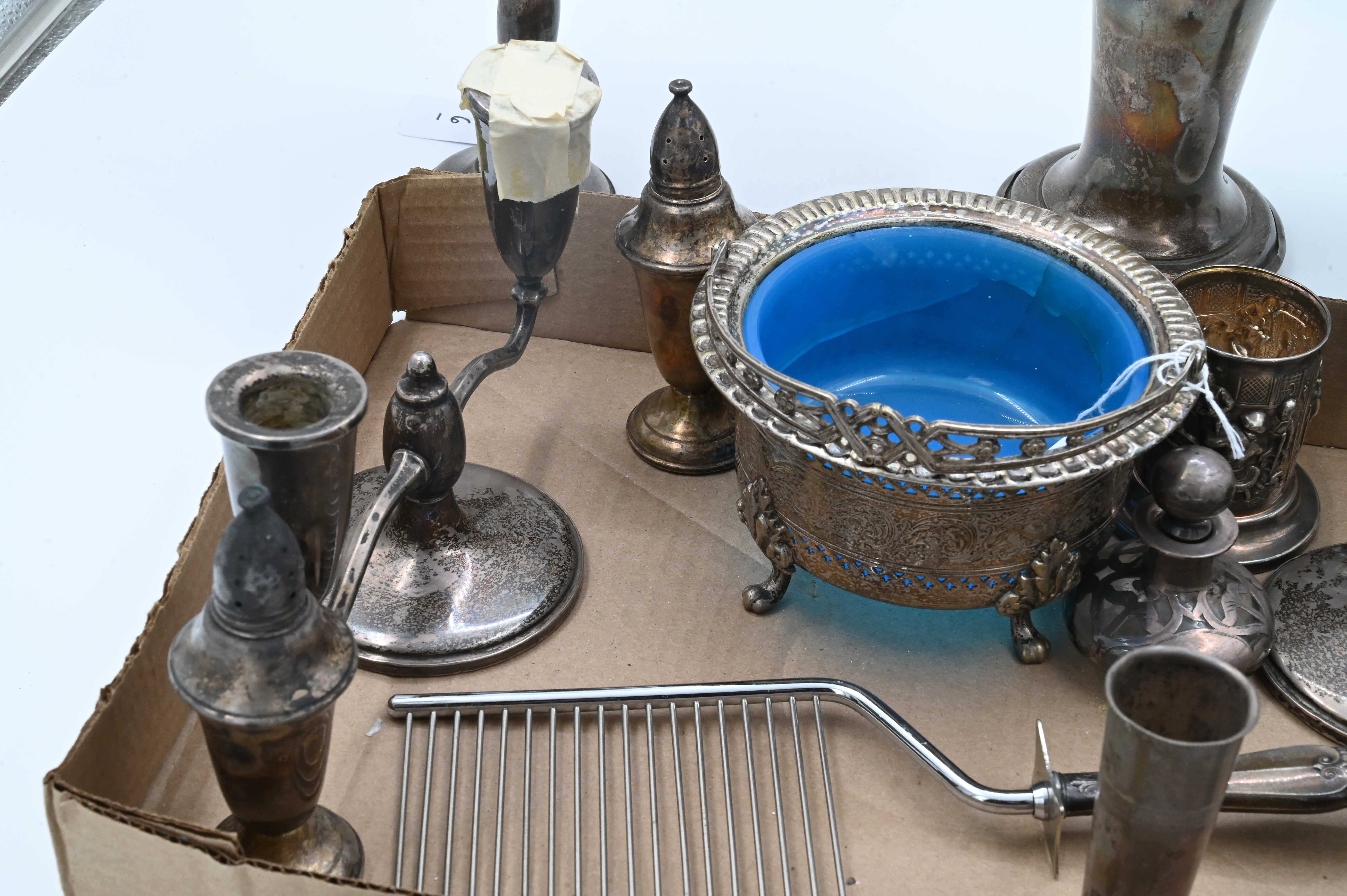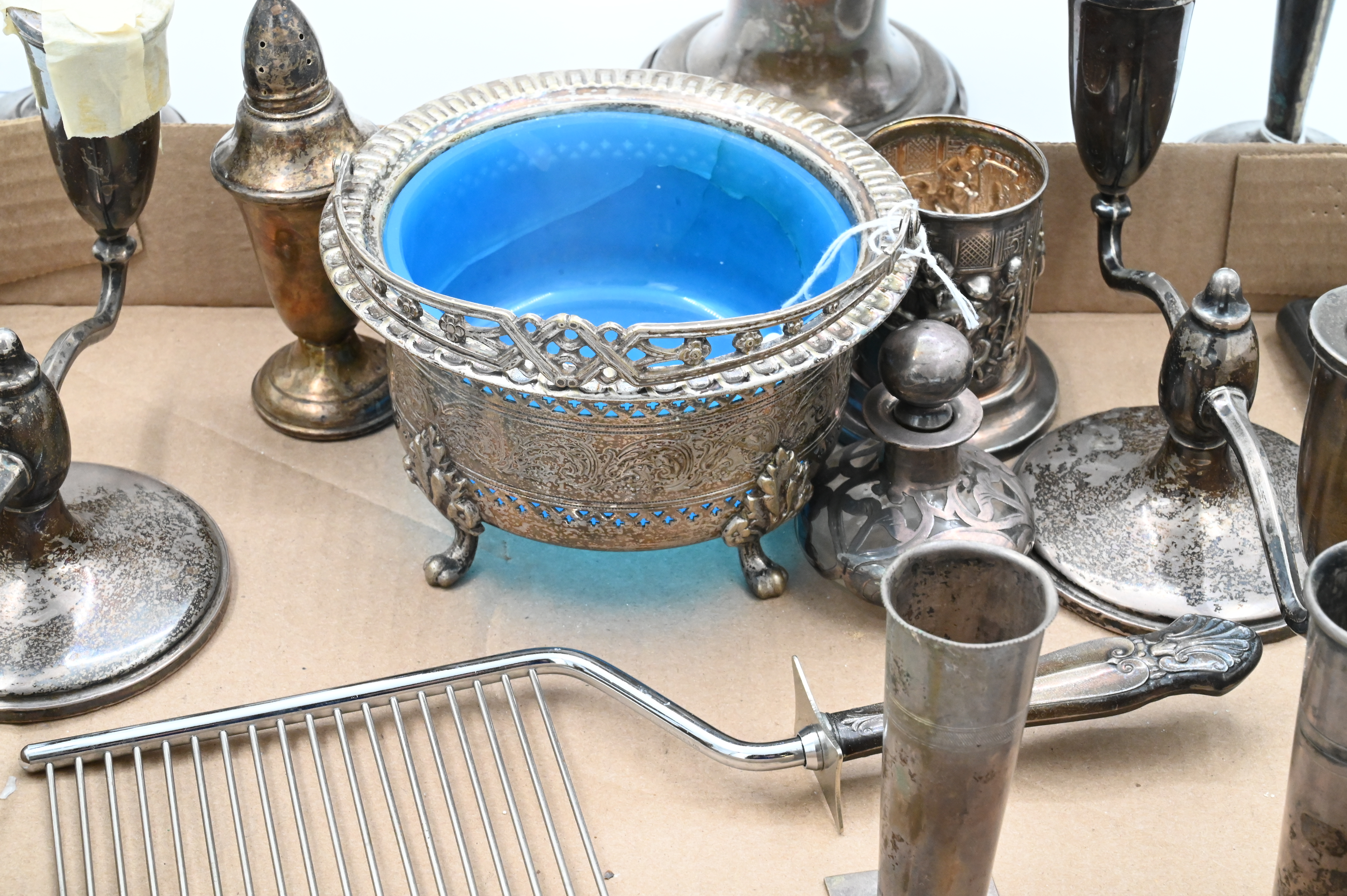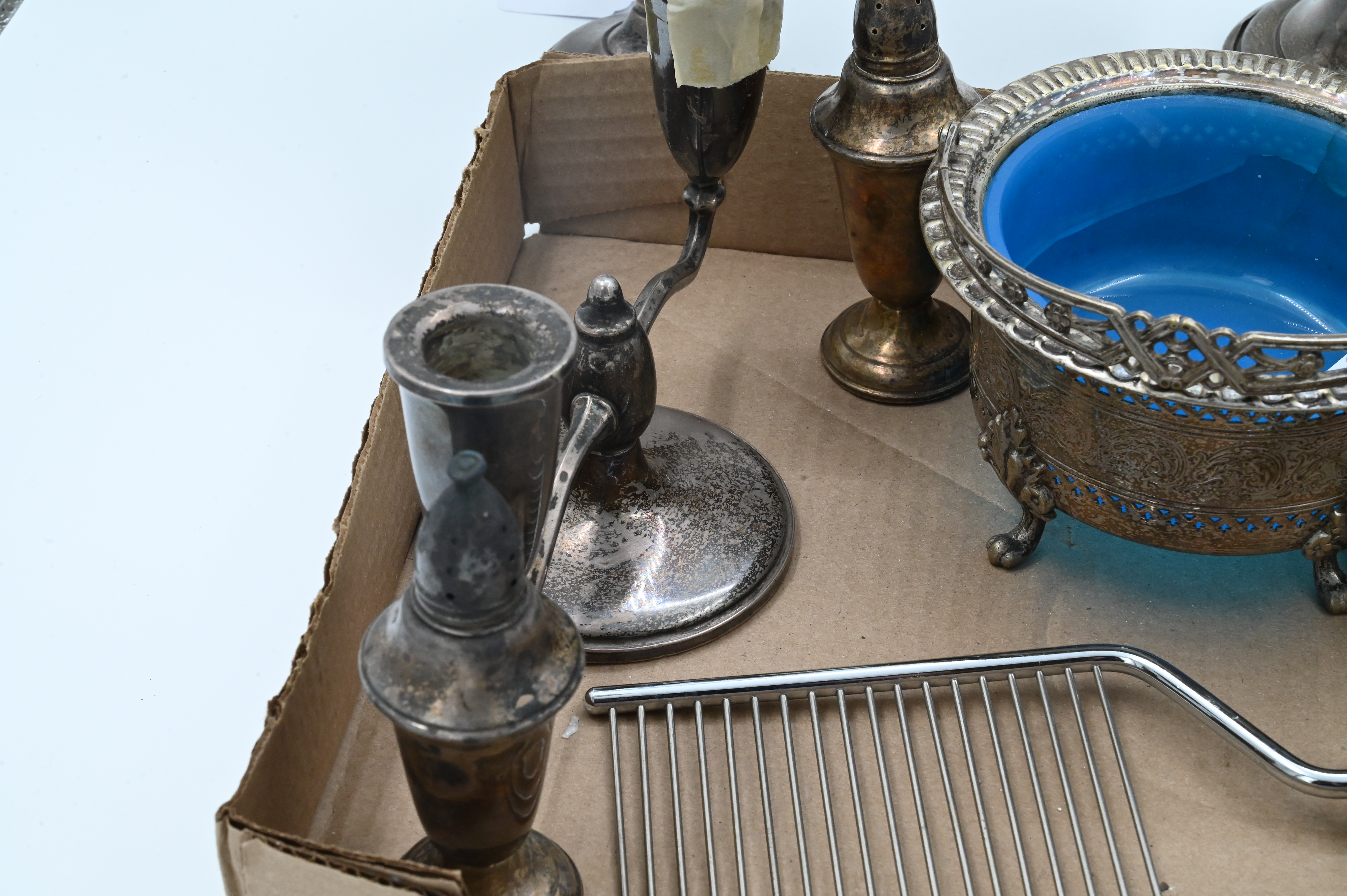 basket, pair of candelabras, pepper shakers, with silver plate dish