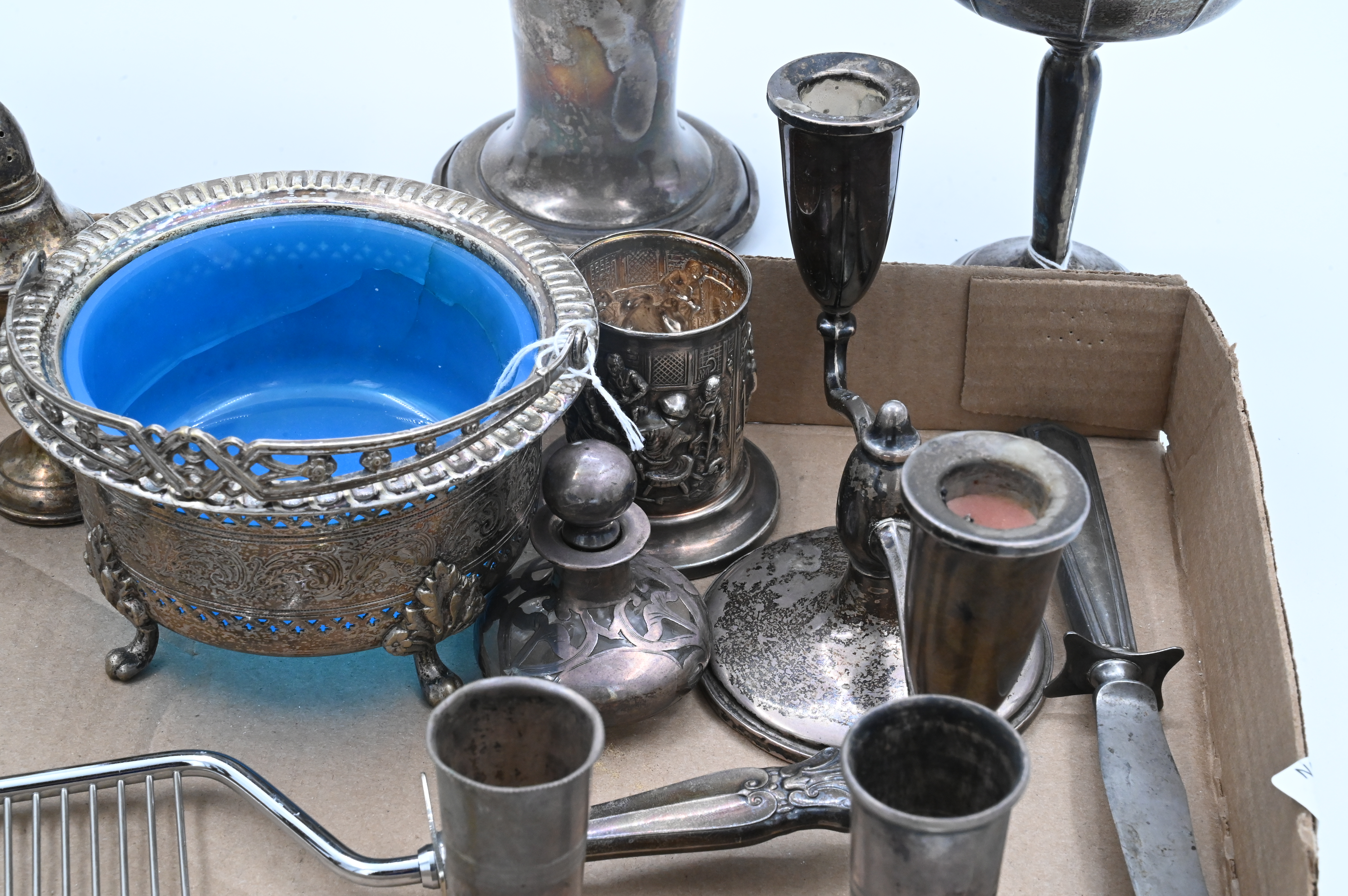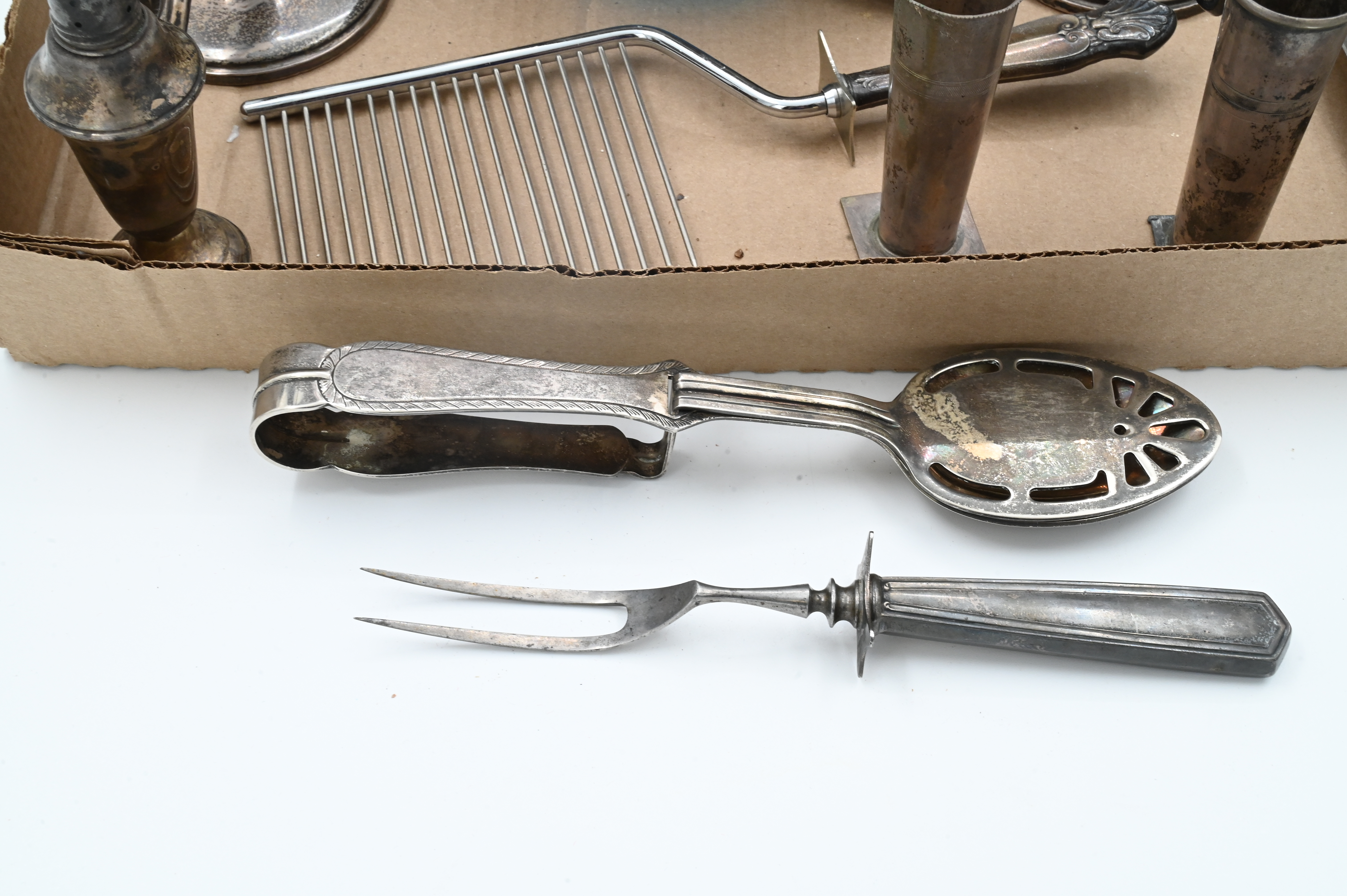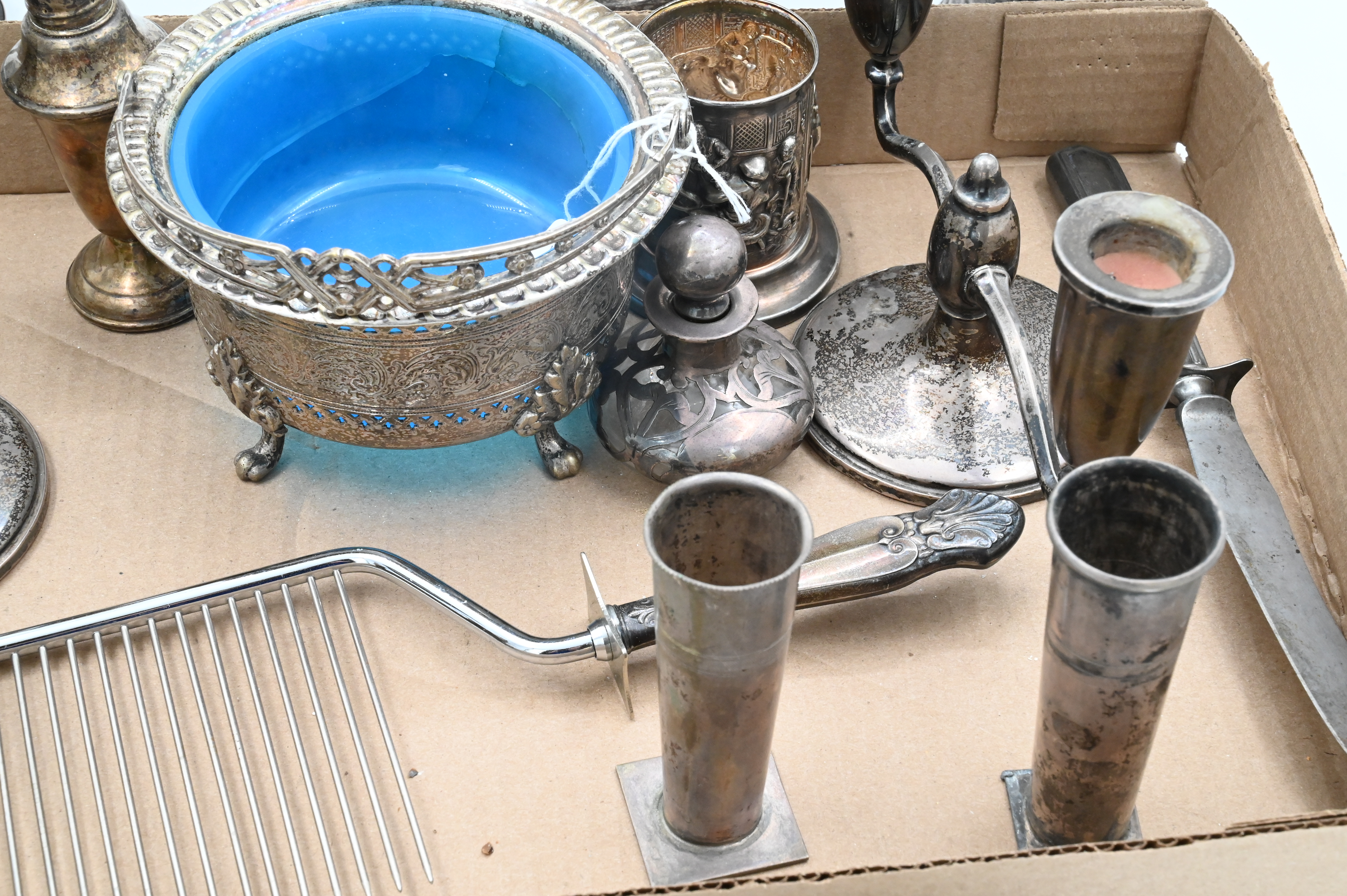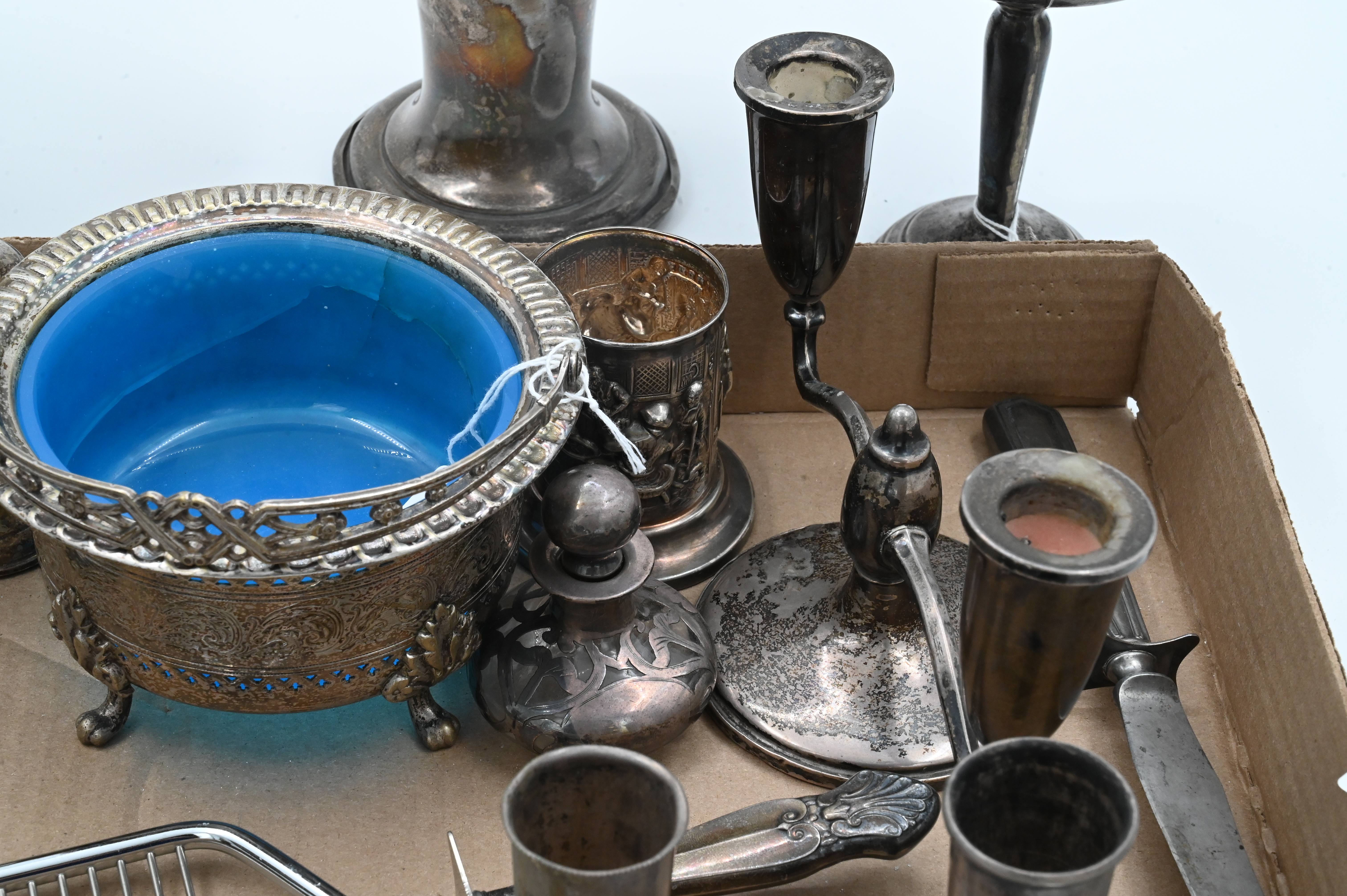 basket, pair of candelabras, pepper shakers, with silver plate dish