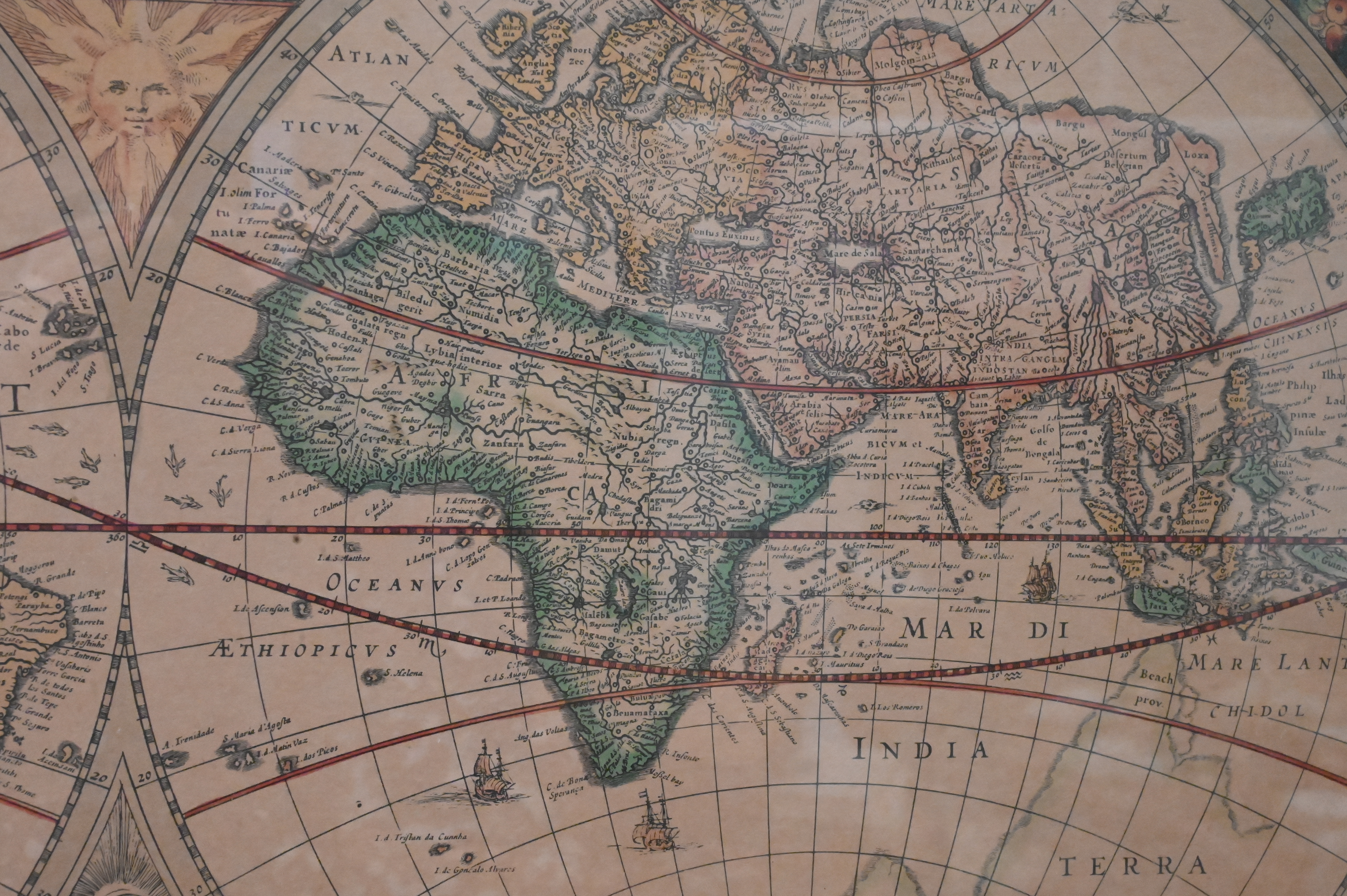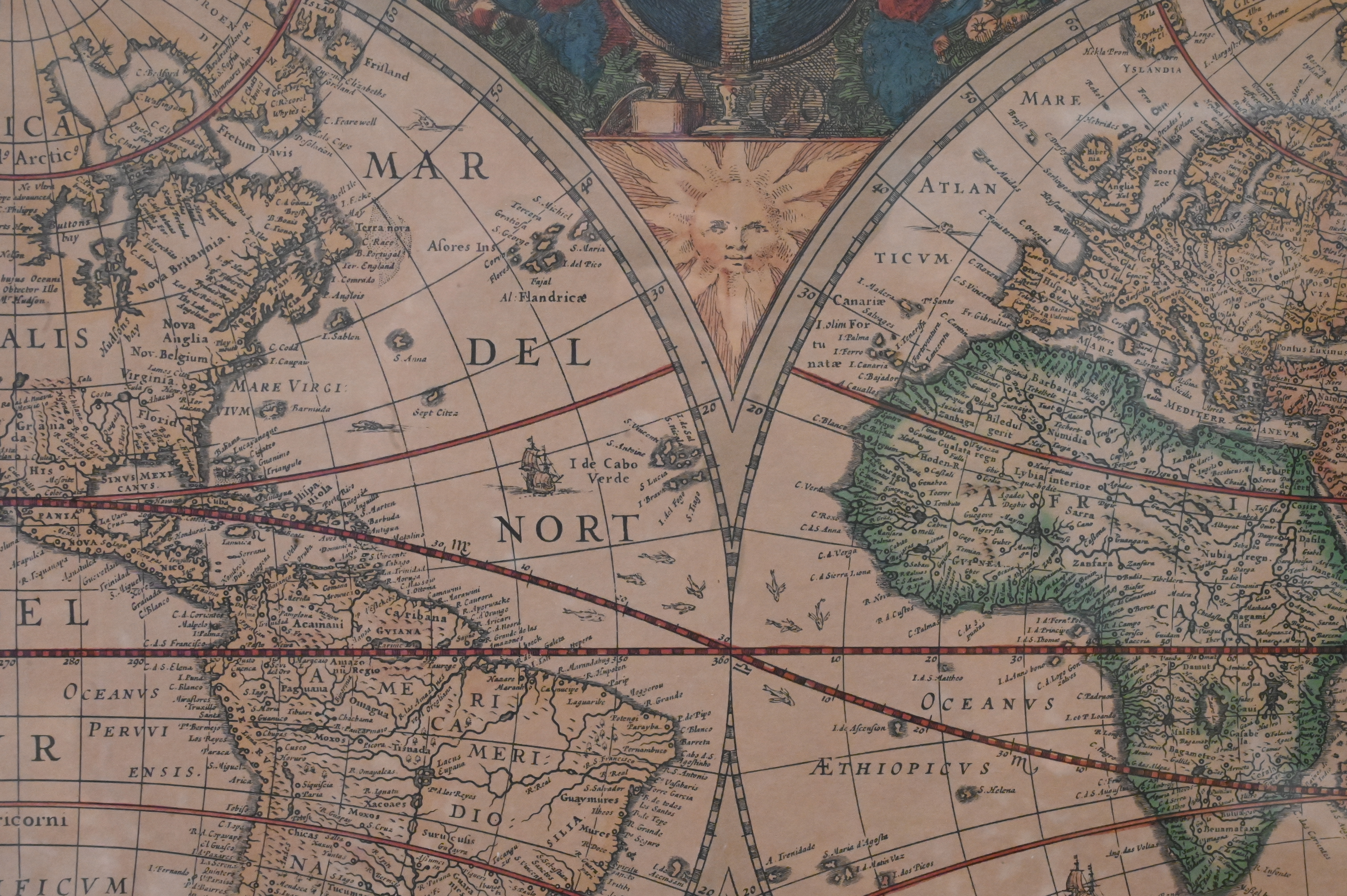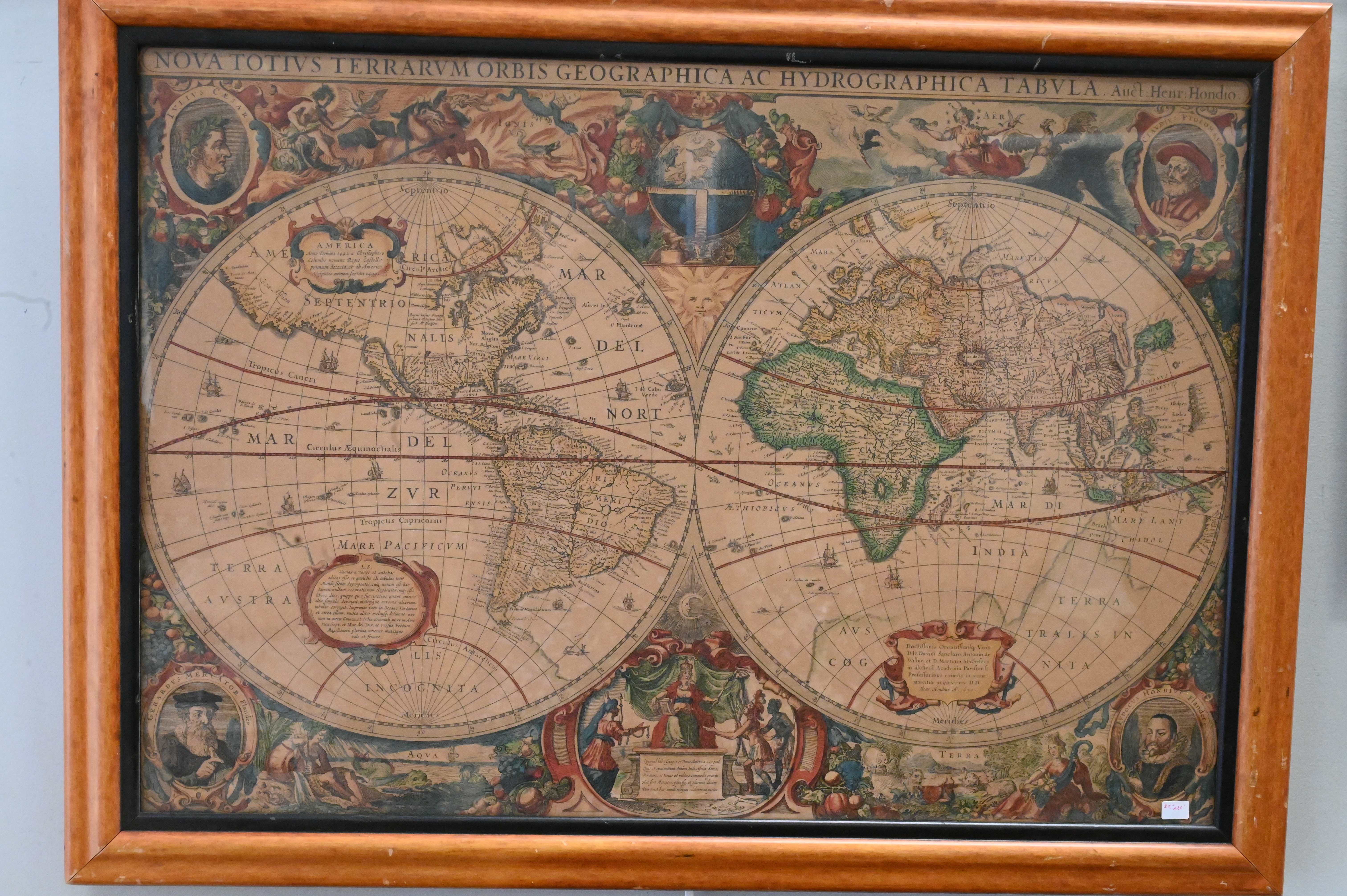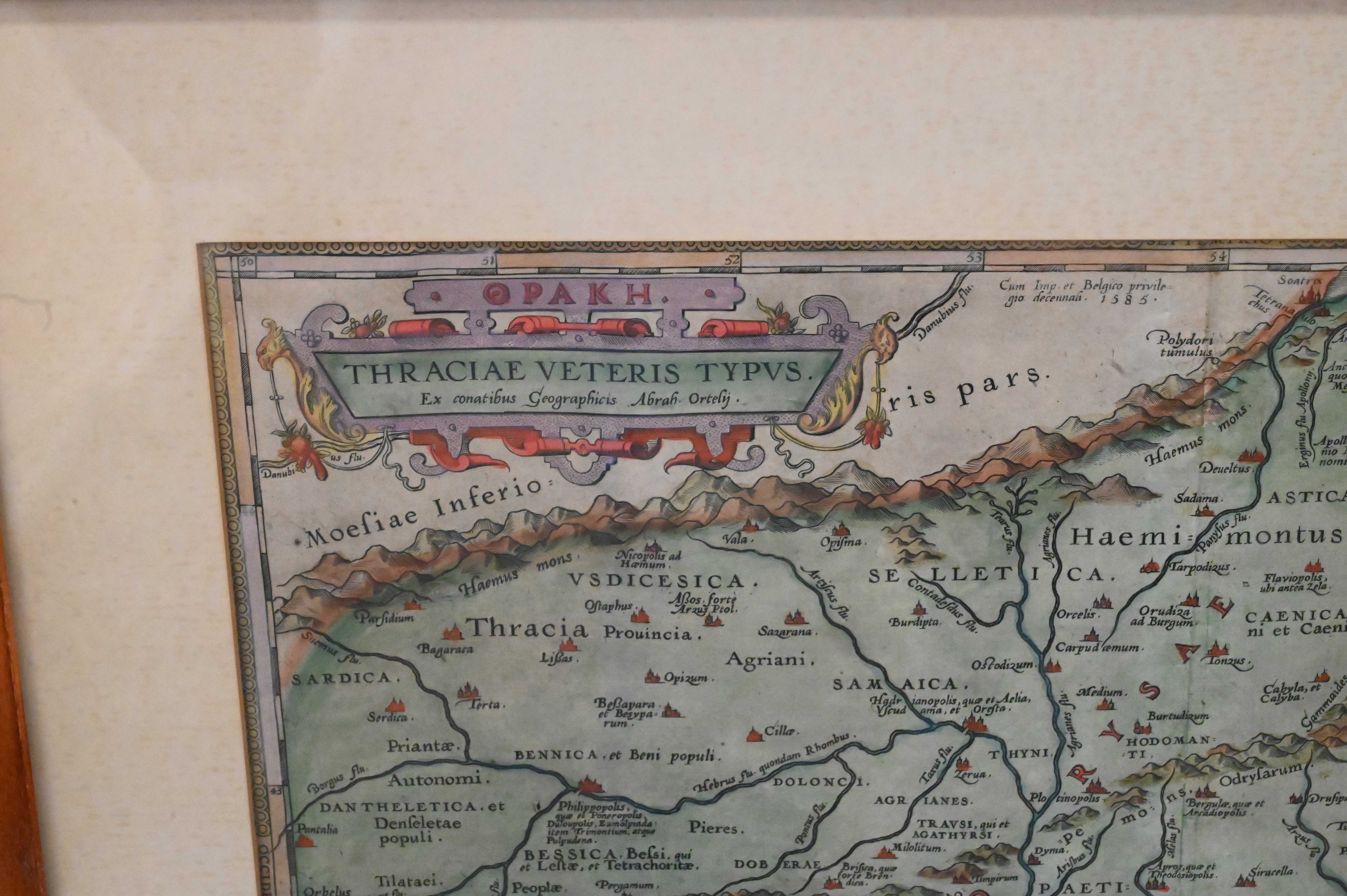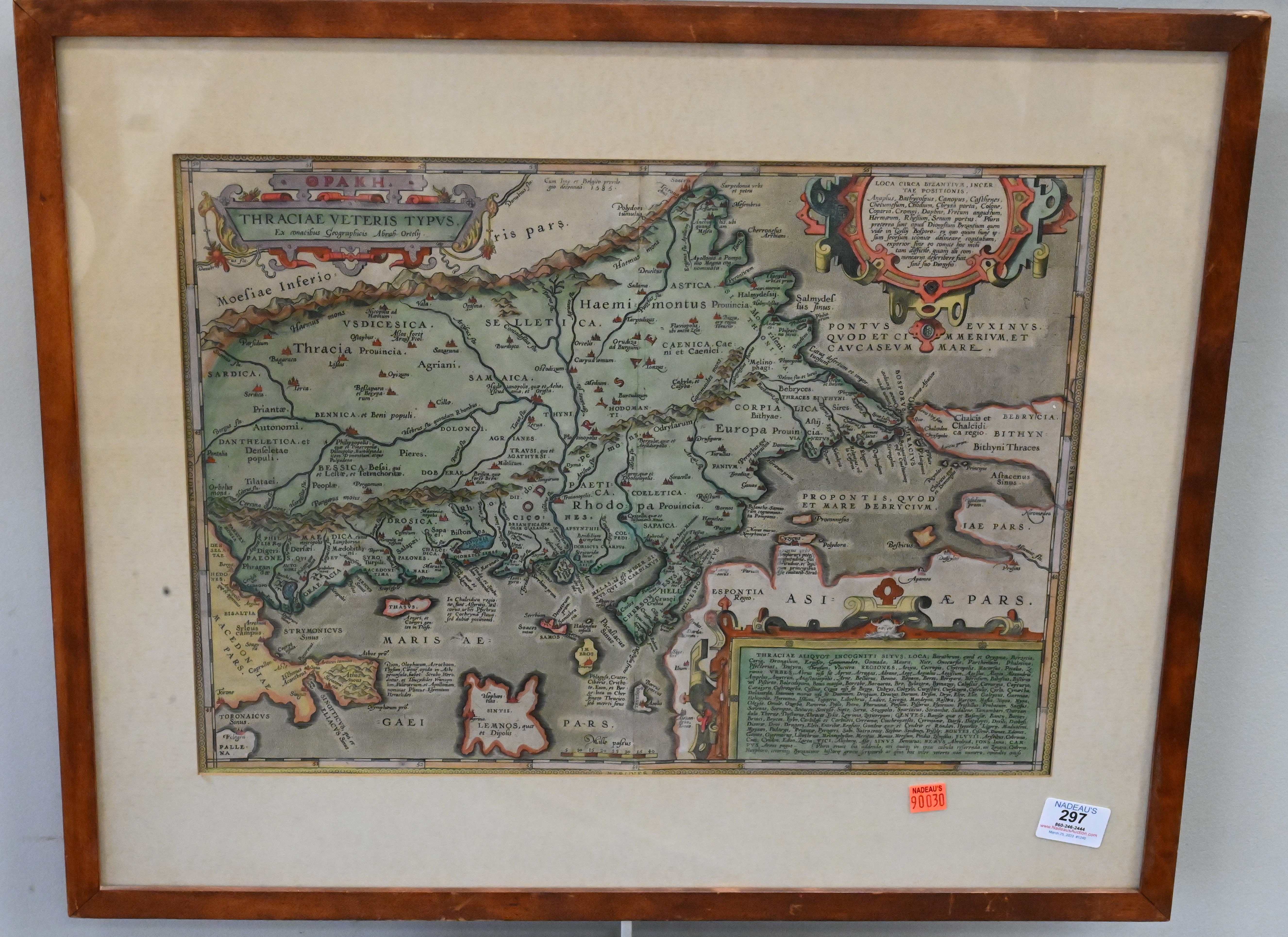 Two Framed Maps, to include a hand colored map etchings of “Thraciae Vesteris Typus Ex continuous Geographics Agyah Otelj”, Northeastern Greece and Northwest Turkey by Abraham Ortelius originally published in 1602 after Gastaldi’s 1560 map of South East Europe, 13 1/2″ x 18 1/2″; along with a restrike of Hondius map of the world, 20″ x 29″.