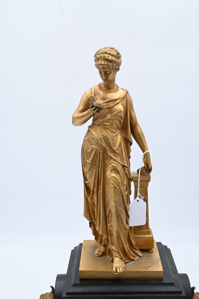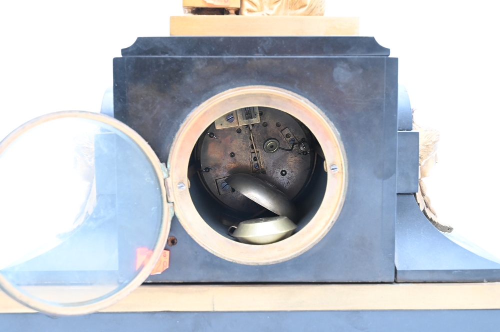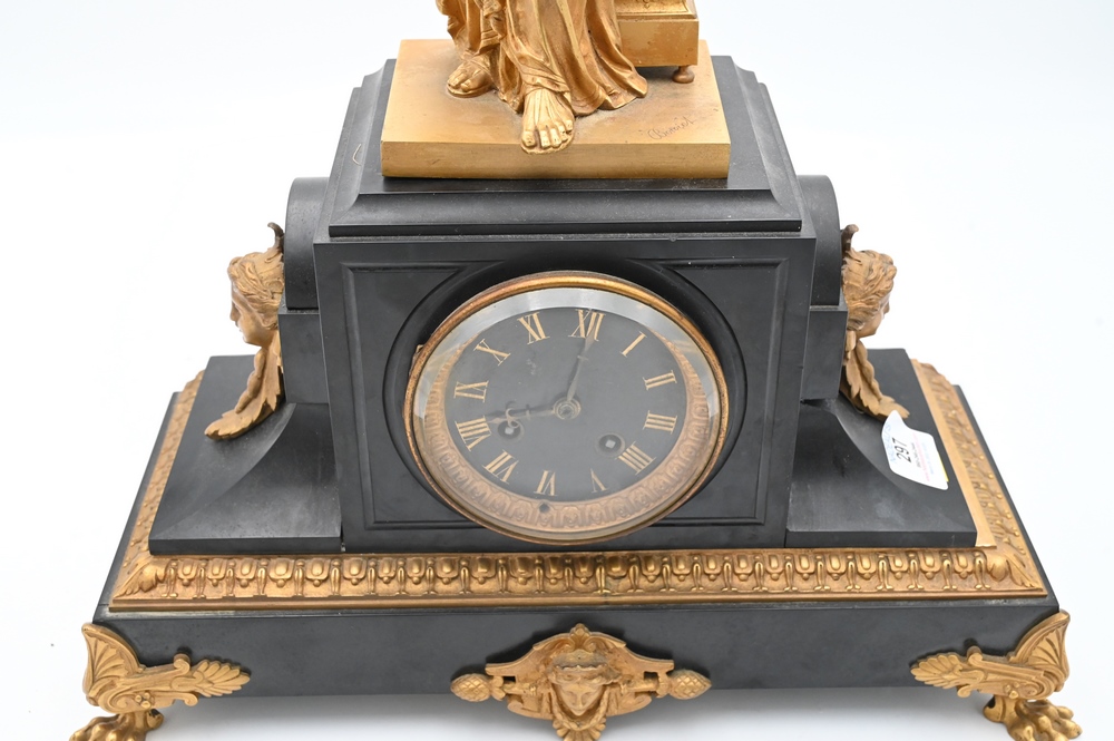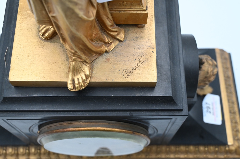 Lot 297: Victorian Black Slate Mantle Clock, having Eutrope bouret bronze classical standing figure reading a book mounted on top, all on cla…