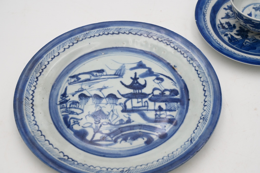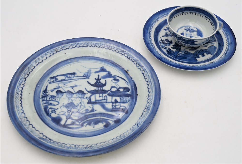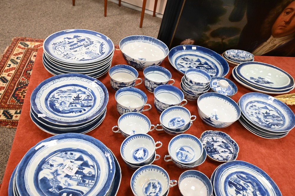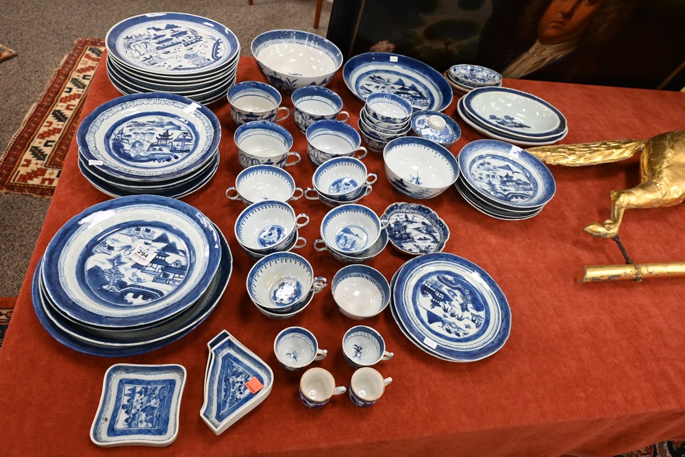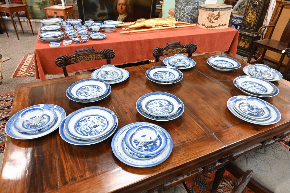 Lot 298: 85 Piece Lot of Canton to include various sized plates, cups, bowls and liners diameter up to 10 inches Provenance: From a Newport, Rhode Island historic home, in the same family since 1761.