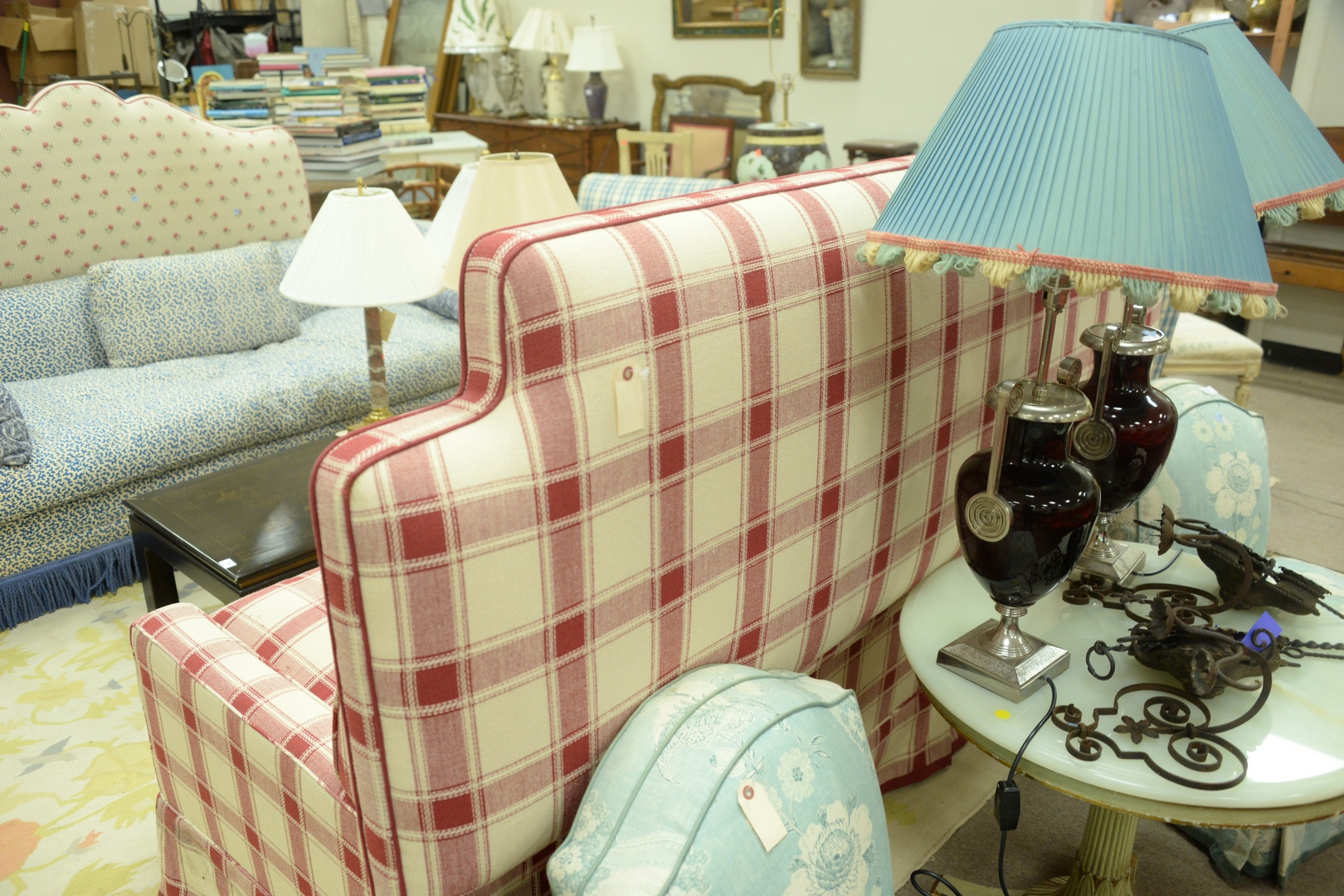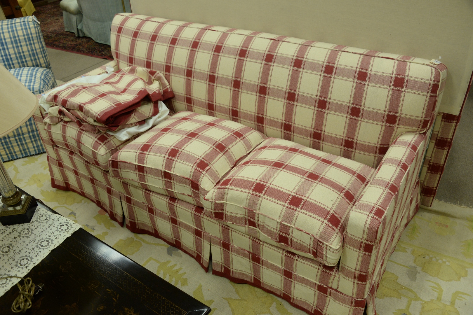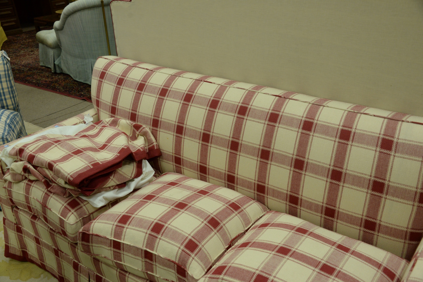 Lot 298: Albert Menin Interiors Plaid Custom Upholstered Sofa, height 32 inches, length 72 inches along with a king headboard, height 49 inc…