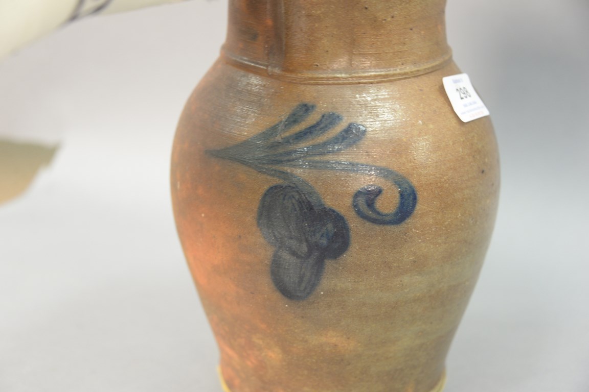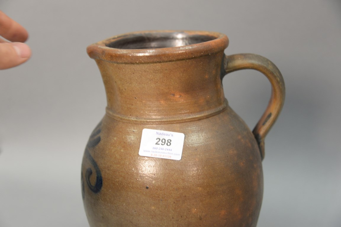 Blue decorated stoneware pitcher with ladle. ht. 10 1/2 in.