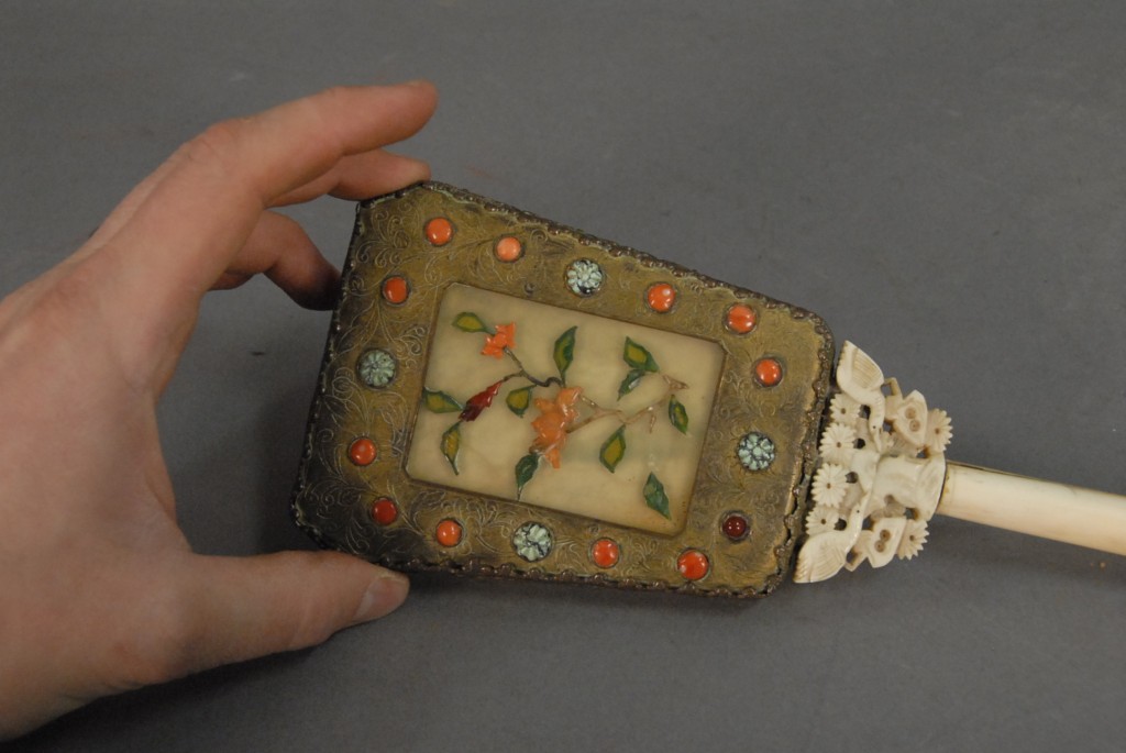 Lot 298: Carved ivory hardstone and coral hand mirror, having carved ivory handle, the back of the mirror mounted with hardstone and coral h…