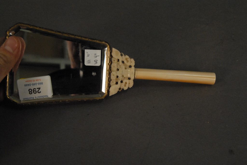 Carved ivory hardstone and coral hand mirror, having carved ivory handle, the back of the mirror mounted with hardstone and coral handle as is, lg. 10 wd. 4.