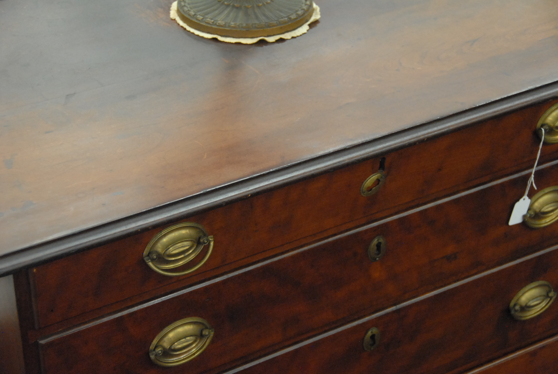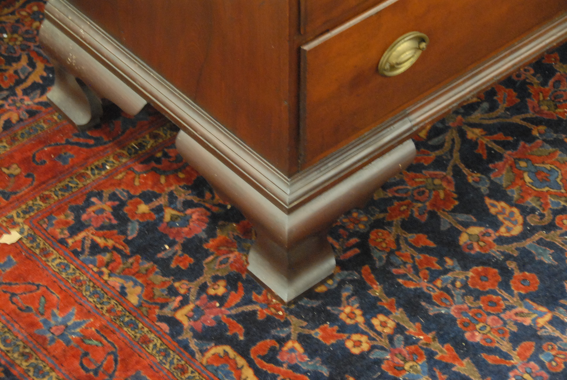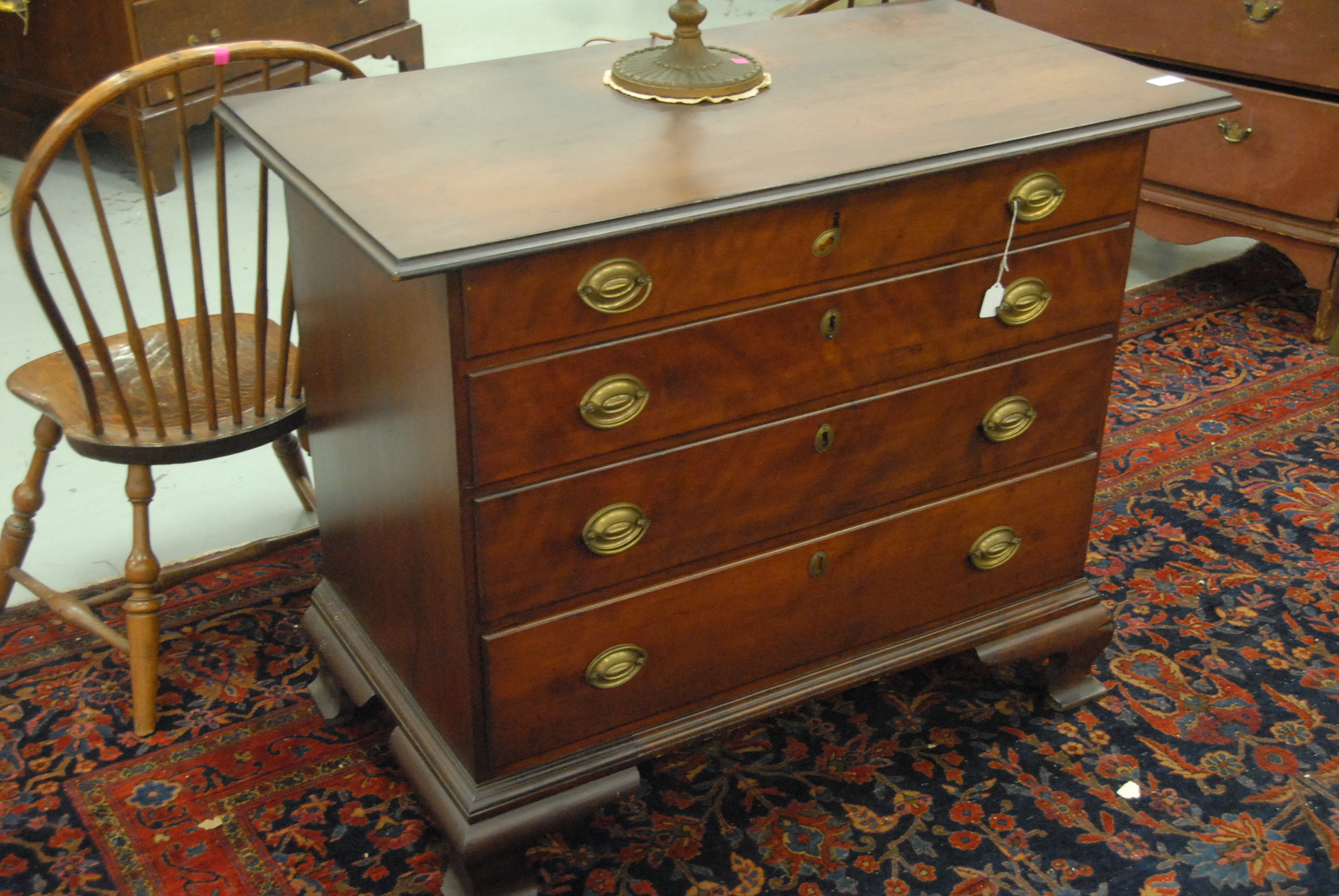 Lot 298: Chippendale cherry chest having thumb molded over-hanging top over four graduated drawers, all set on large ogee feet. ht. 34 in. wd. 35 3/4 in. dp. 19 3/4 in. Provenance: Property from the Estate of Elizabeth and Edward Wallace of Th