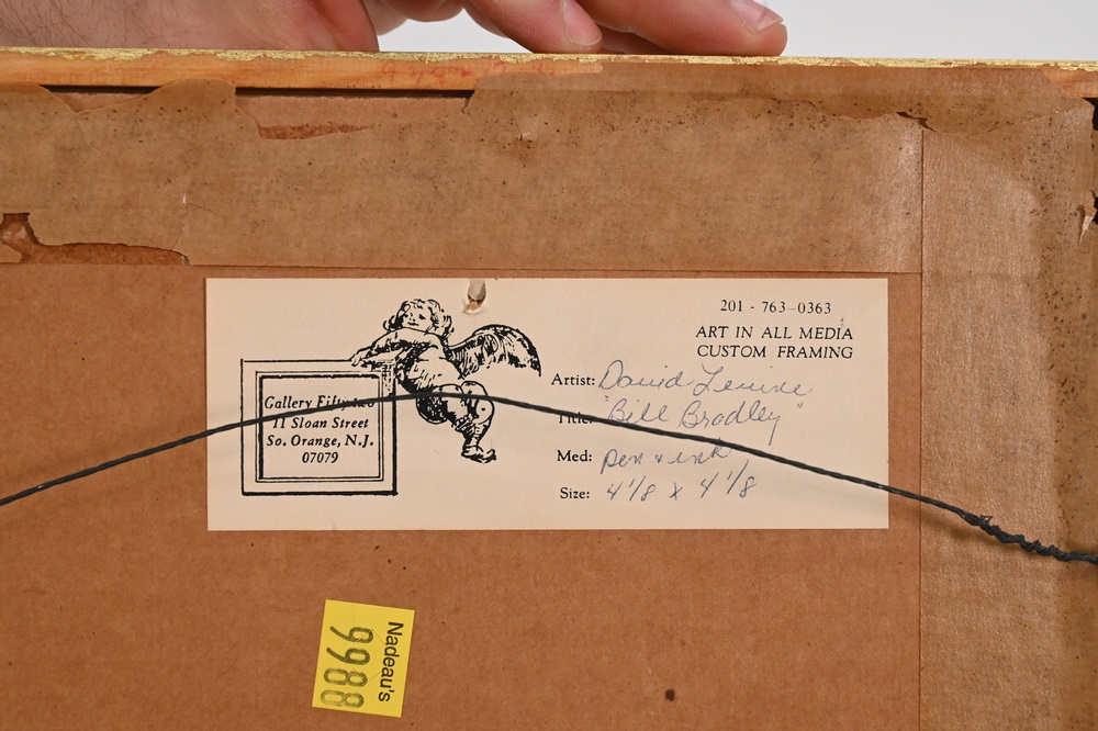 David Levine (1926 – 2009), Bill Bradley, pen and ink, signed D. Levine, 73, Gallery Fifty-two, New Jersey label verso, 6 1/2″ x 10 1/2″.