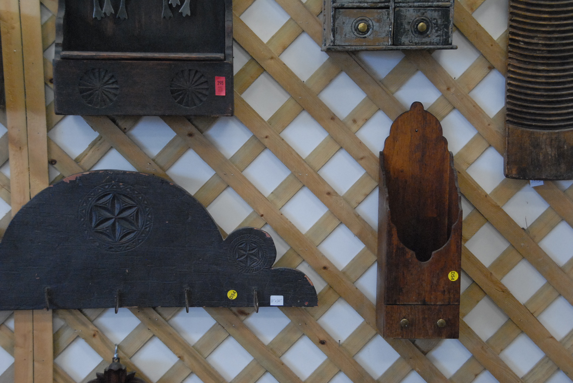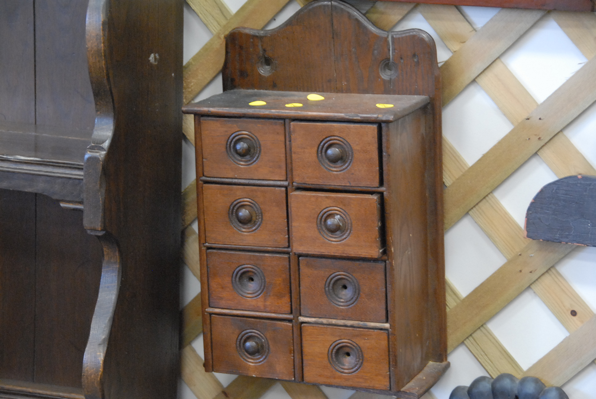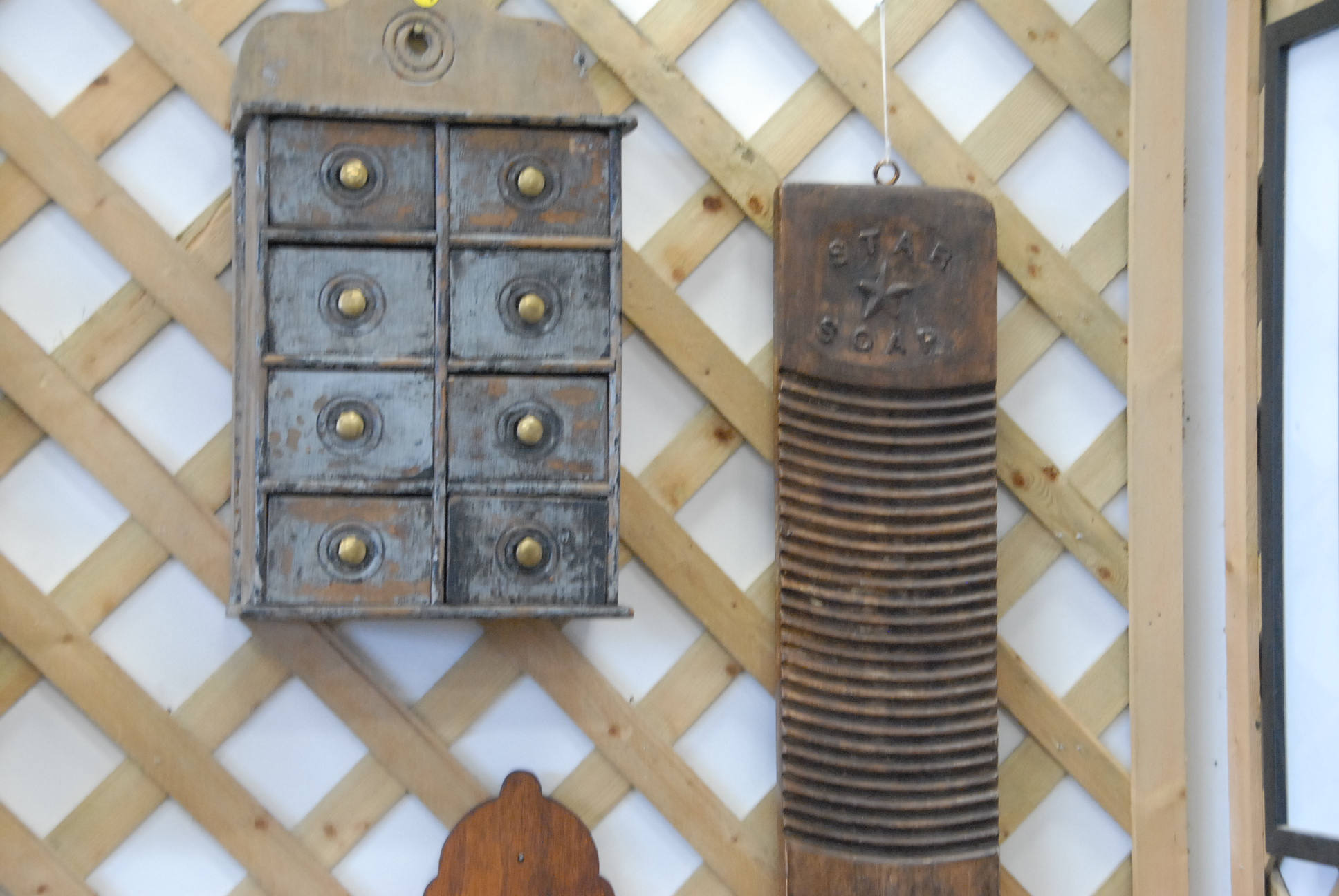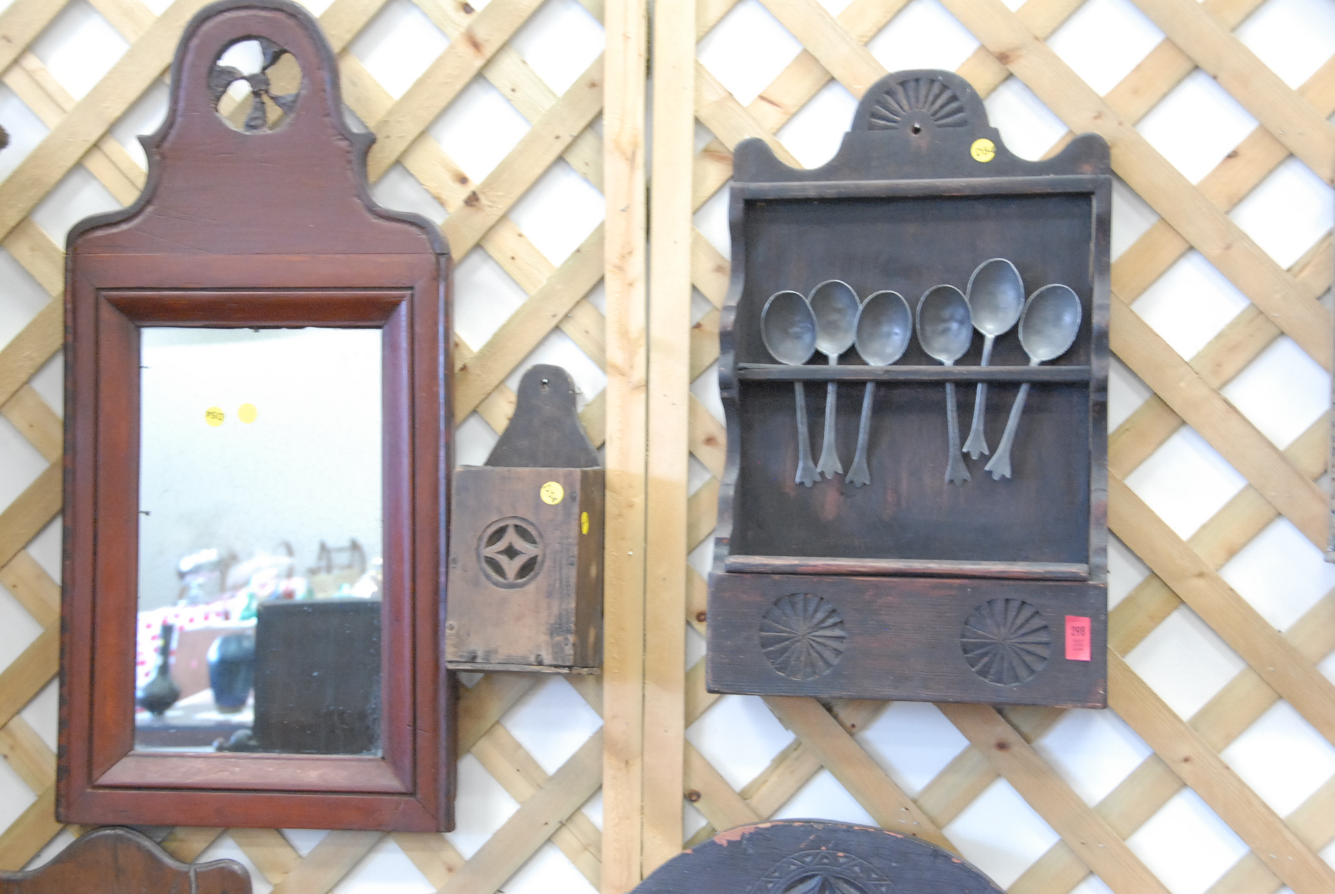 Eight piece lot of primitives to include meat hooks, a pipe box, two hanging spice boxes with eight drawers each, a spoon rack, a mirror