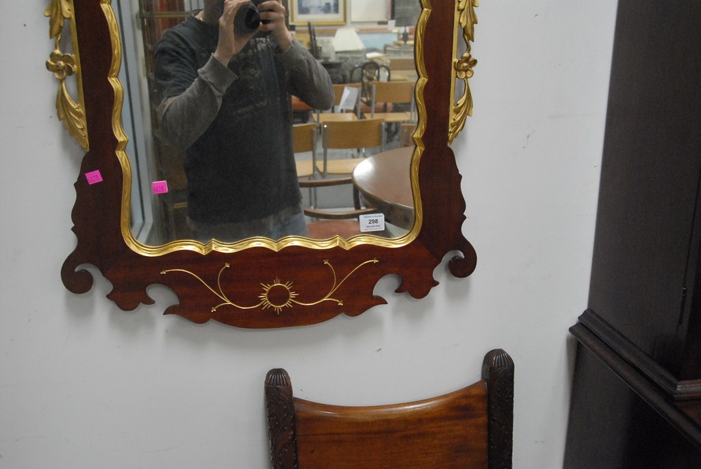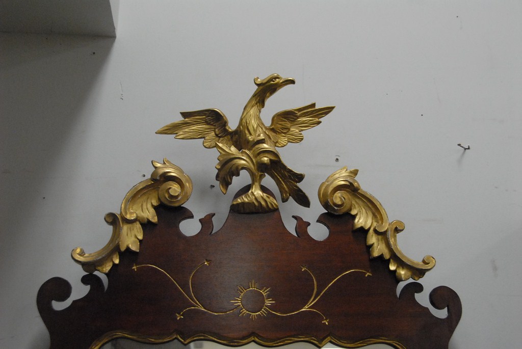 Lot 298: Fineberg Chippendale style mirror with gilt eagle top, flanked by scrolled pediment and incised gold, made by Fineberg, Hartford, CT…