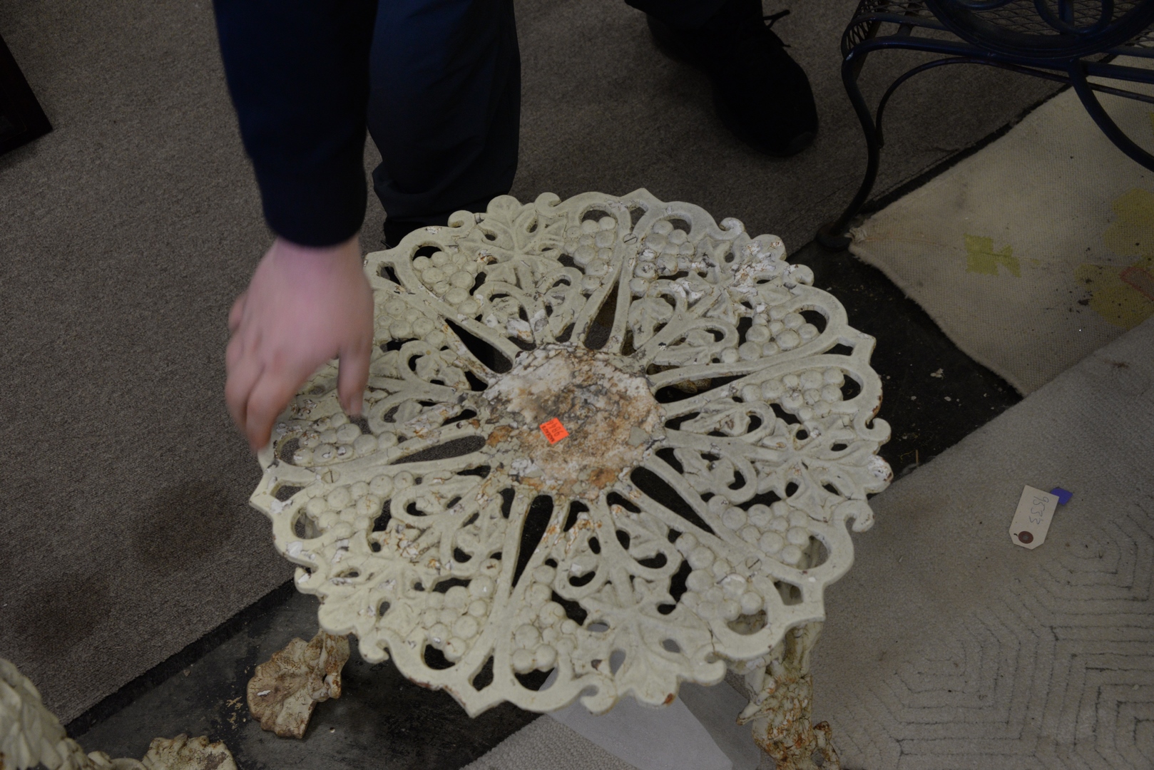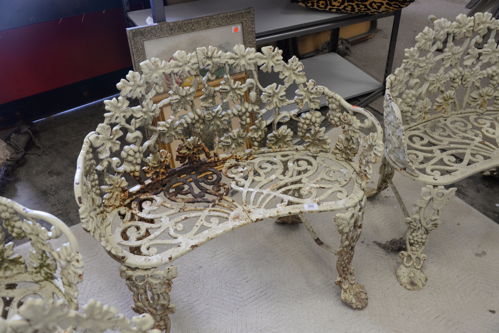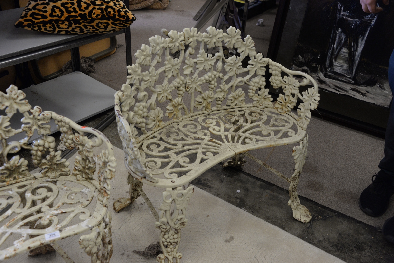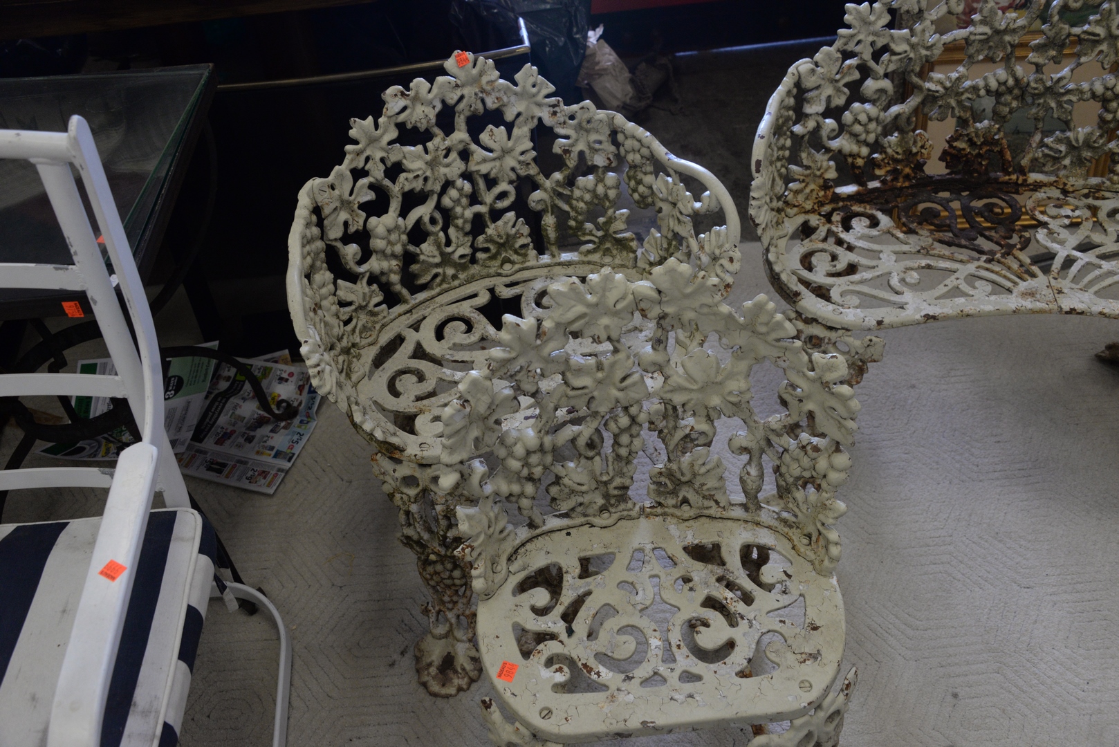 Lot 298: Five Piece Iron Lot having grape motif, to include two loveseats, two chairs, and one table, height 28 1/2 inches, length 33 inches, (needs paint).