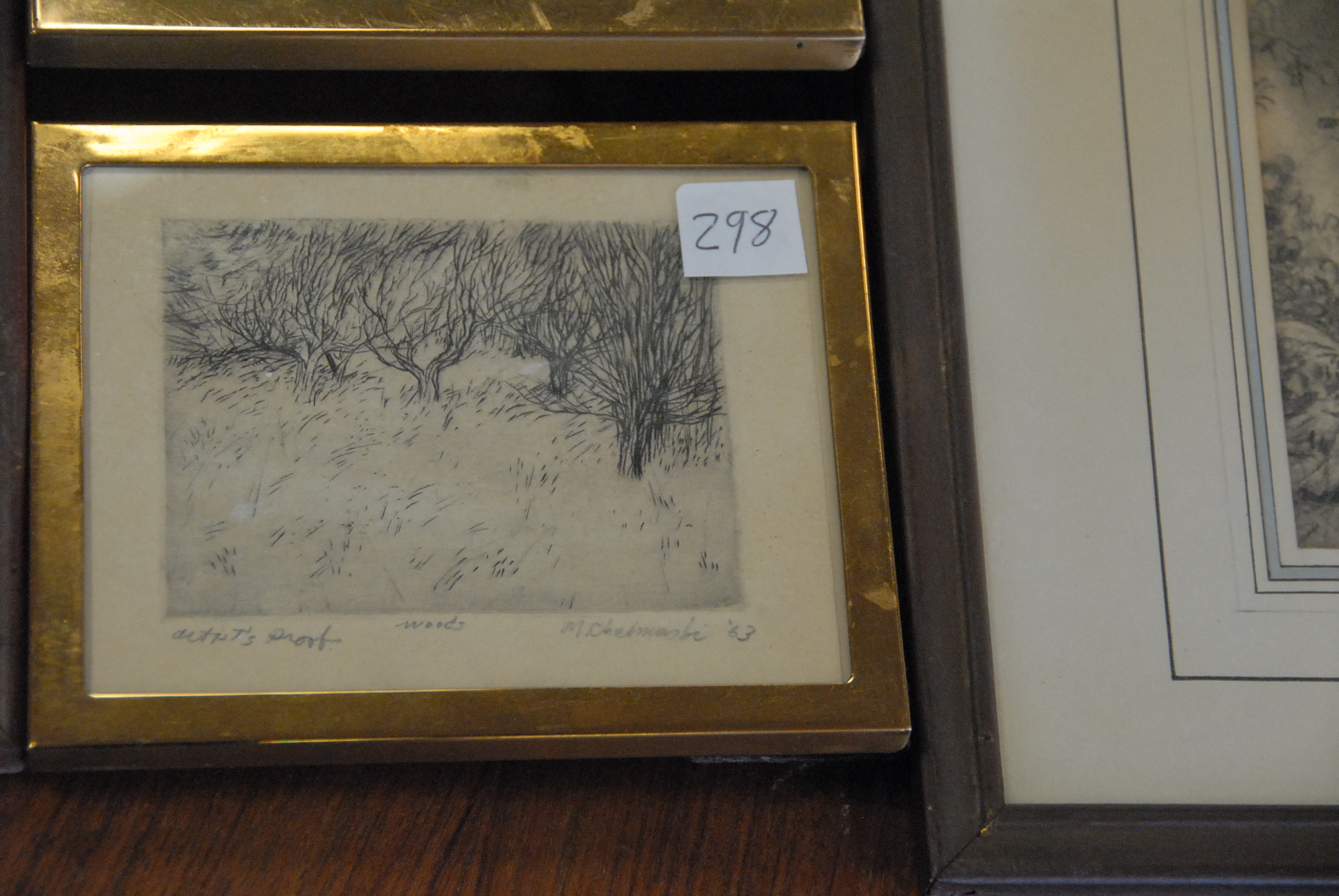 Group of four prints and etchings to include two artist proof titled Woods signed lower right M. Chelmiski