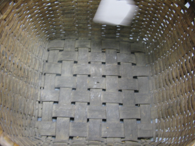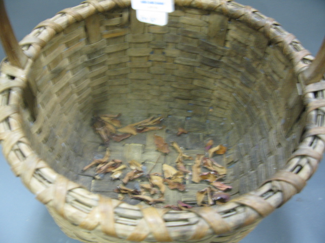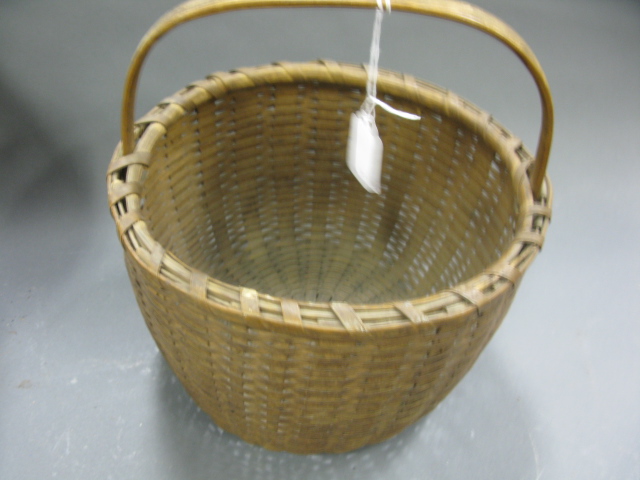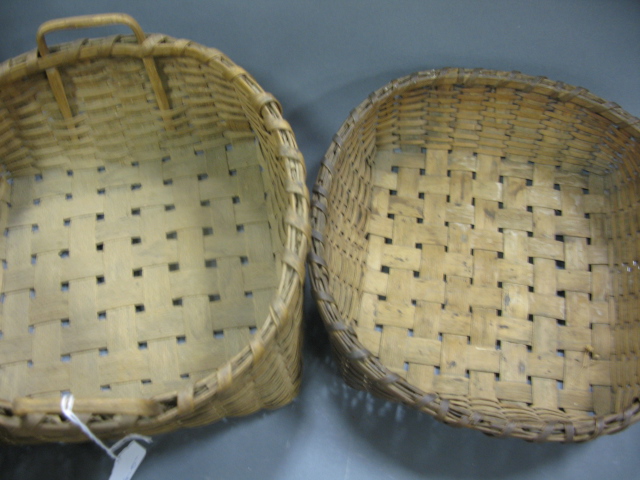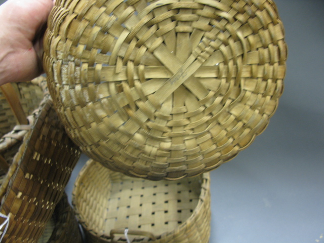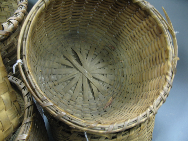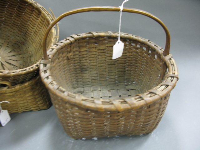 Group of primitive baskets, three with hoop handles, two round, one square low basket.